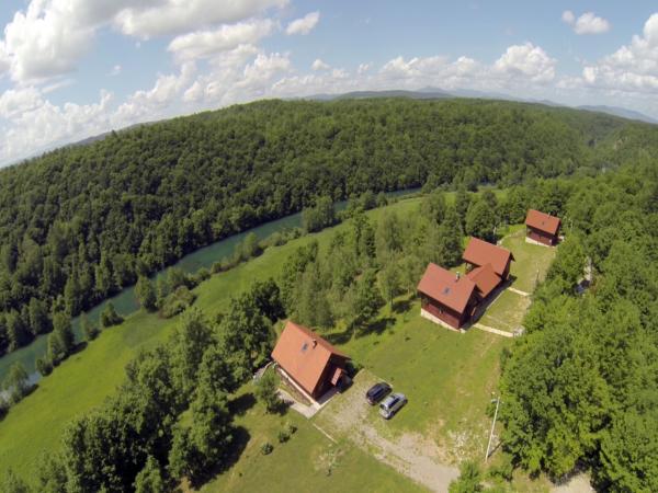 Totalmente equipados y casas modernas en la naturaleza virgen en el río Mrežnica. Alquile tres casas de madera. Cada uno es 140 m2. Primera planta hay tres dormitorios en la planta baja, salón, cocina y terraza. Después de un baño en la primera planta piso y planta. La cocina está totalmente equipada. Los huéspedes pueden utilizar la parrilla. Además de la casa hay un parque infantil para el fútbol, voleibol y bádminton. Frente a una gran terraza es una piscina de 10x4 m. Adaptar el paseo a lo largo del río. Se alquilan kayaks y bicicletas de montaña. La comida puede ser pedido con antelación.