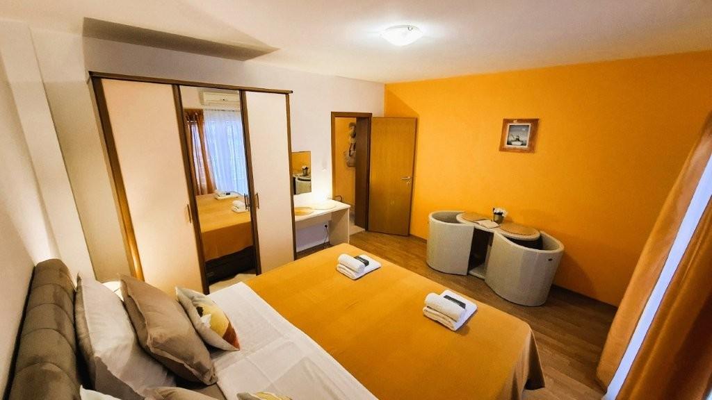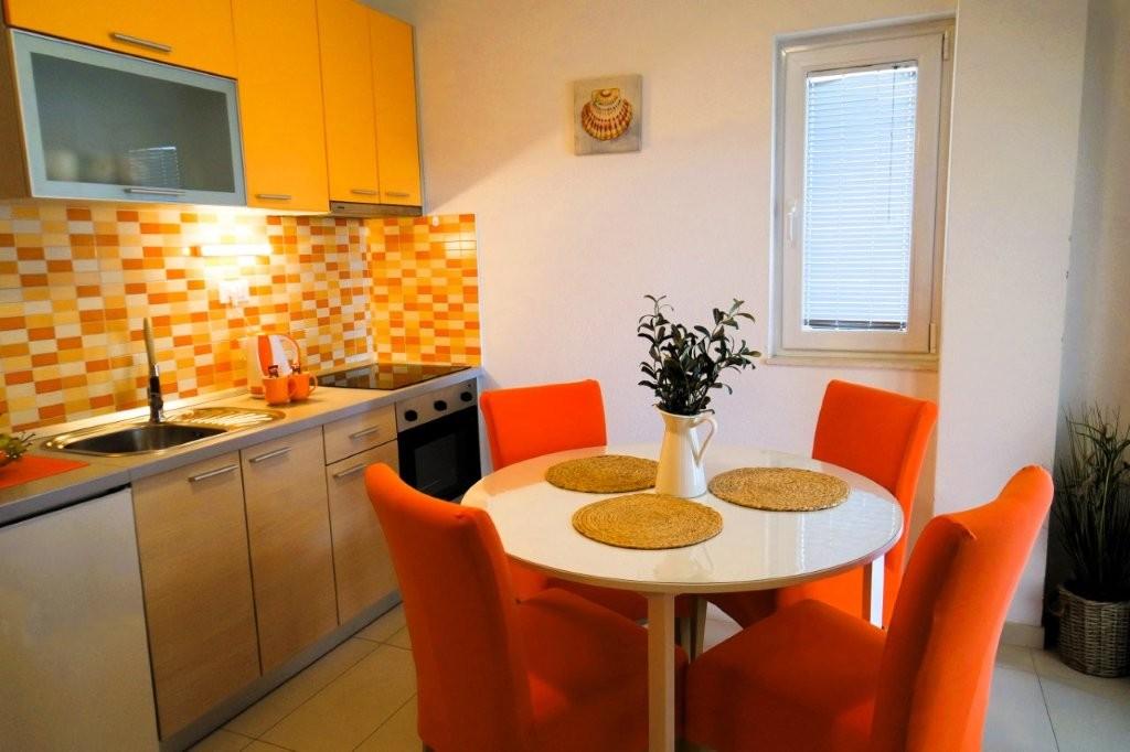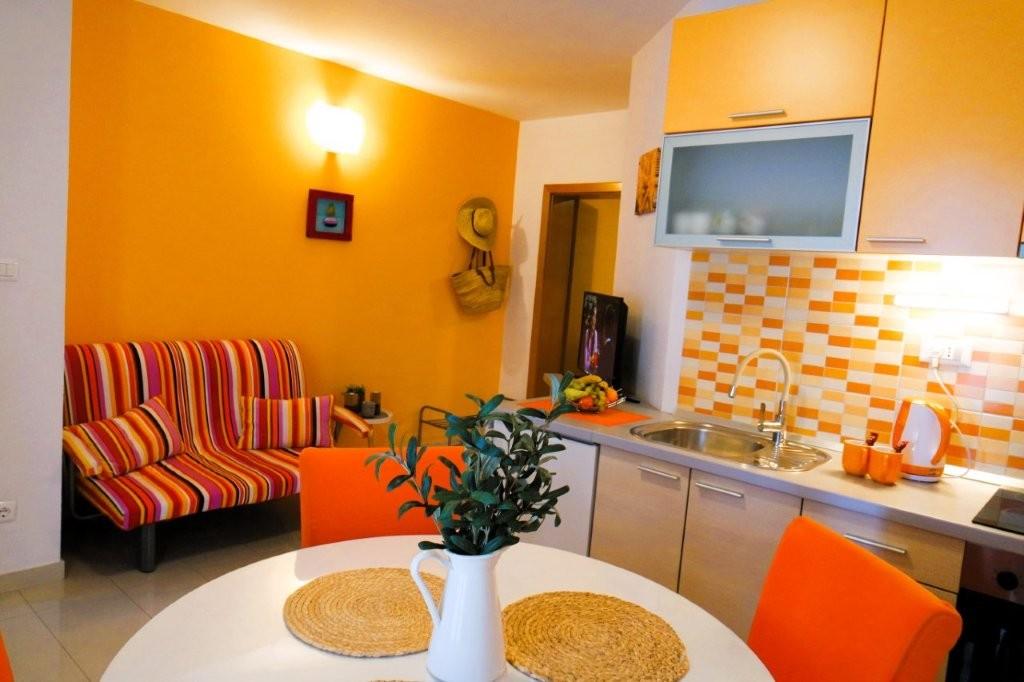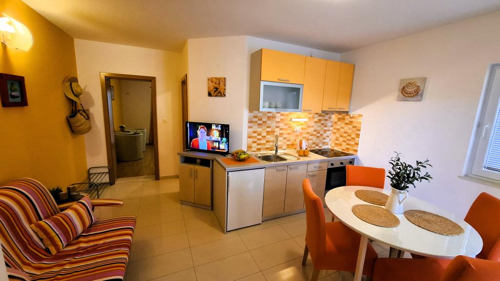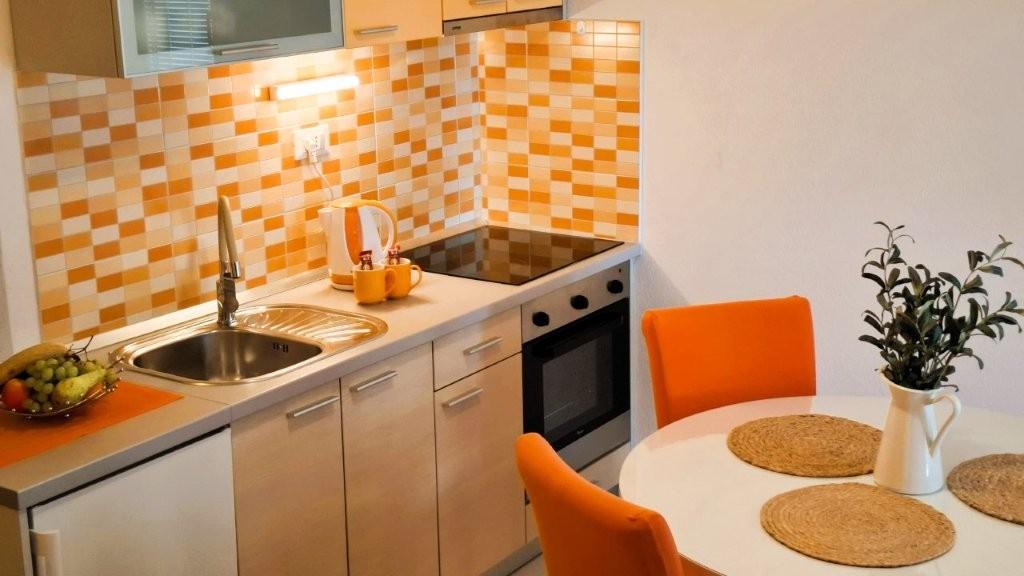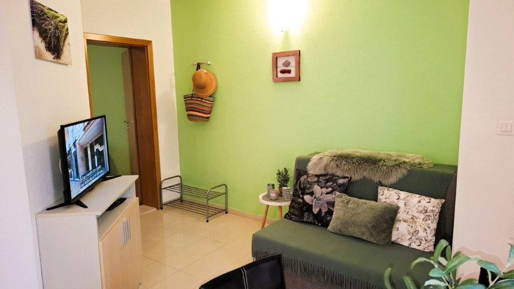 Los modernos apartamentos Harmonia son la elección perfecta para unas vacaciones familiares cómodas o para parejas que buscan un alojamiento confortable cerca de la playa. A unos 200 metros de la playa de Nikola, en una atractiva zona de Baška Voda y no muy lejos del centro, con una hermosa vista lateral del mar y la montaña Biokovo. Ofrecemos alojamiento en apartamentos verdes y naranjas, destinados a 2 adultos con 2 niños pequeños y en un apartamento turquesa para 2 adultos con ev. 1 niño Cada apartamento es de 40m2, tiene un amplio dormitorio, sala de estar que incluye una cocina totalmente equipada, mesa y sillas y un sofá cama, baño y terraza. Los apartamentos verde y naranja se encuentran en el primer piso de la casa familiar y tienen amplios balcones con vistas laterales al mar, mientras que el apartamento turquesa se encuentra en el sótano de la casa sin vistas al mar, con una gran terraza y sillones. Cada apartamento está totalmente equipado, irradia limpieza y colores brillantes que seguramente lo harán sentir cómodo y pasar unas agradables vacaciones.