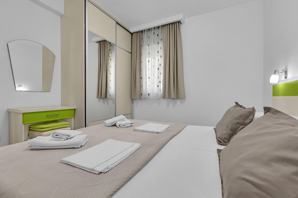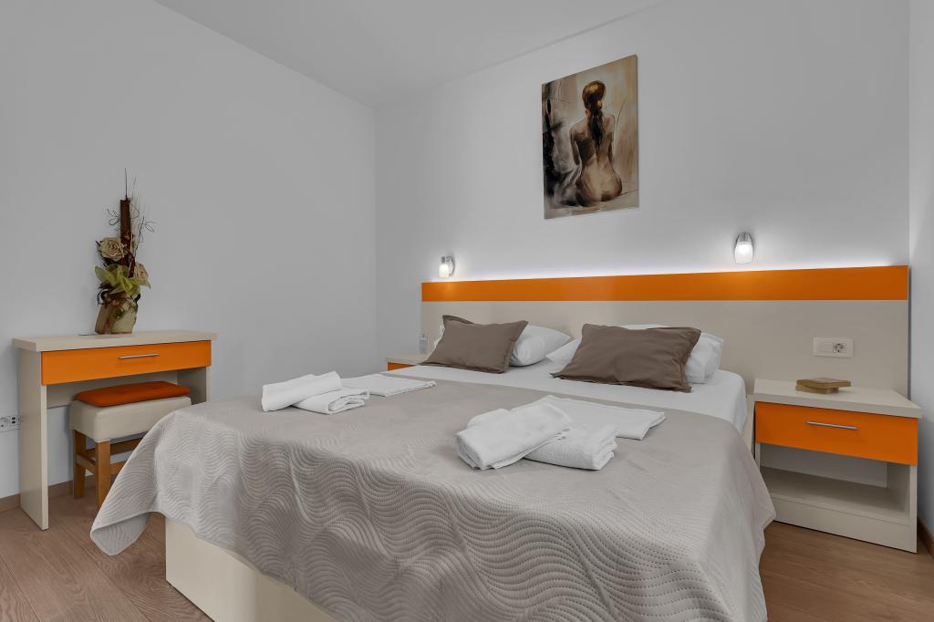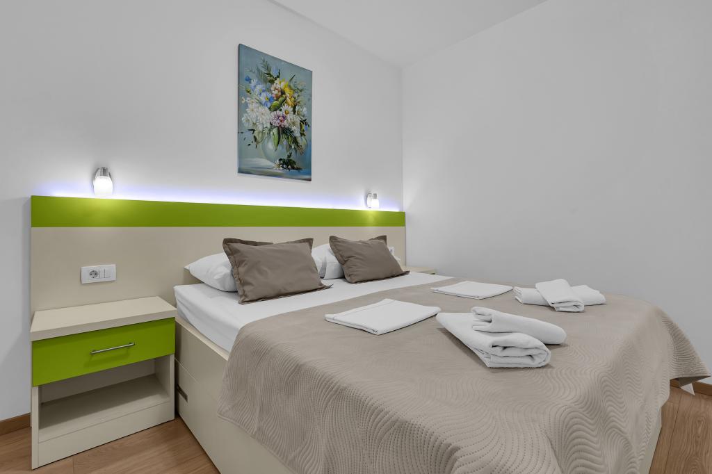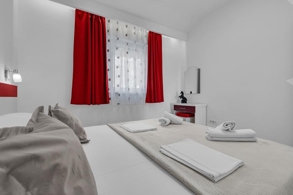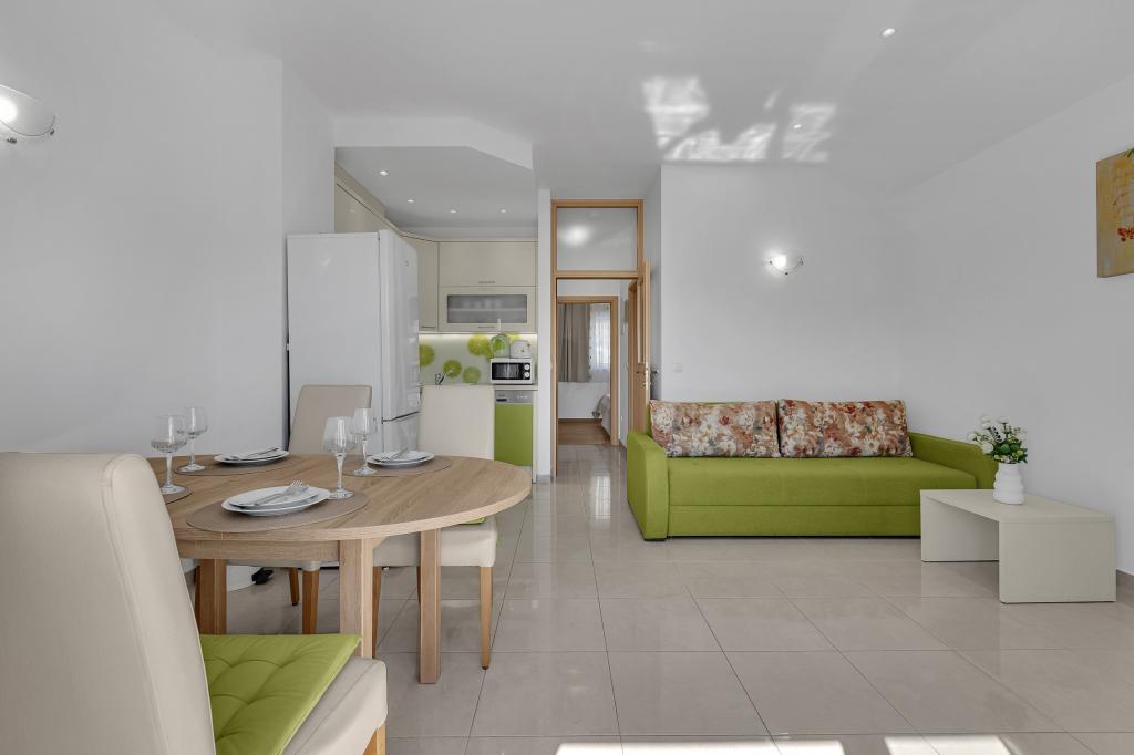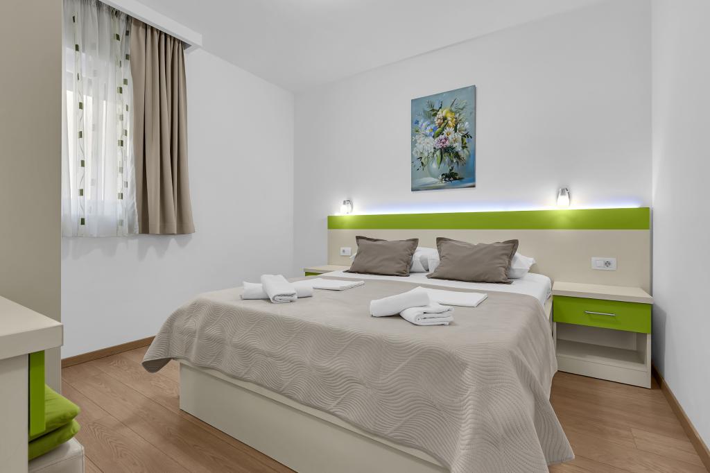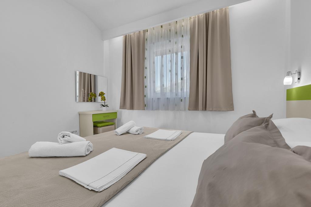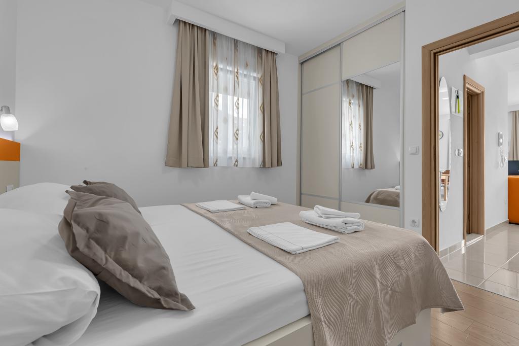 ¡APARTAMENTOS NUEVOS! Todos nuestros apartamentos están modernamente equipados. En total, tenemos seis (6) apartamentos para ofrecer, cinco (5) de los cuales son de un dormitorio y un dúplex de dos dormitorios. En el patio hay una pequeña piscina para los huéspedes, a) Los apartamentos de una habitación (2 adultos y 2 niños) tienen: una habitación con una cama doble, un baño grande con una ducha grande, una cocina moderna totalmente equipada con un comedor y una sala de estar con aire acondicionado y un cómodo sofá cama para dos niños adultos, así como Internet Wi-Fi. Cada uno de estos apartamentos dispone de un amplio balcón de 9 m2 desde el salón. b) Apartamento 4 de dos habitaciones y dos niveles (4 adultos y 2 niños) tiene en el primer piso una moderna habitación con una cama doble y un baño con ducha y WC, una cocina completa con comedor y una sala de estar que tiene un cómodo sofá cama para dos niños adultos. Se accede al segundo piso a través de una escalera de caracol, con una gran habitación, baño y aseo independiente. . Ambas plantas disponen de aire acondicionado.