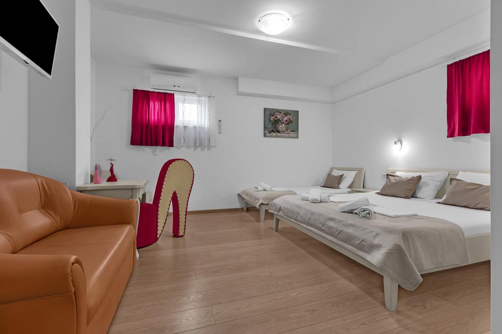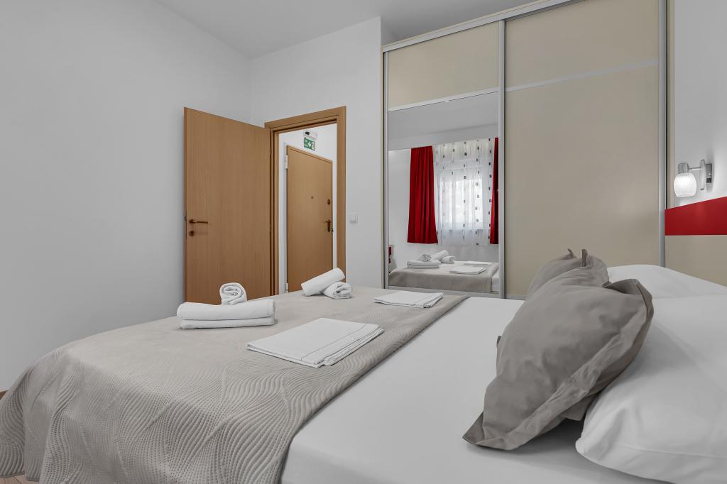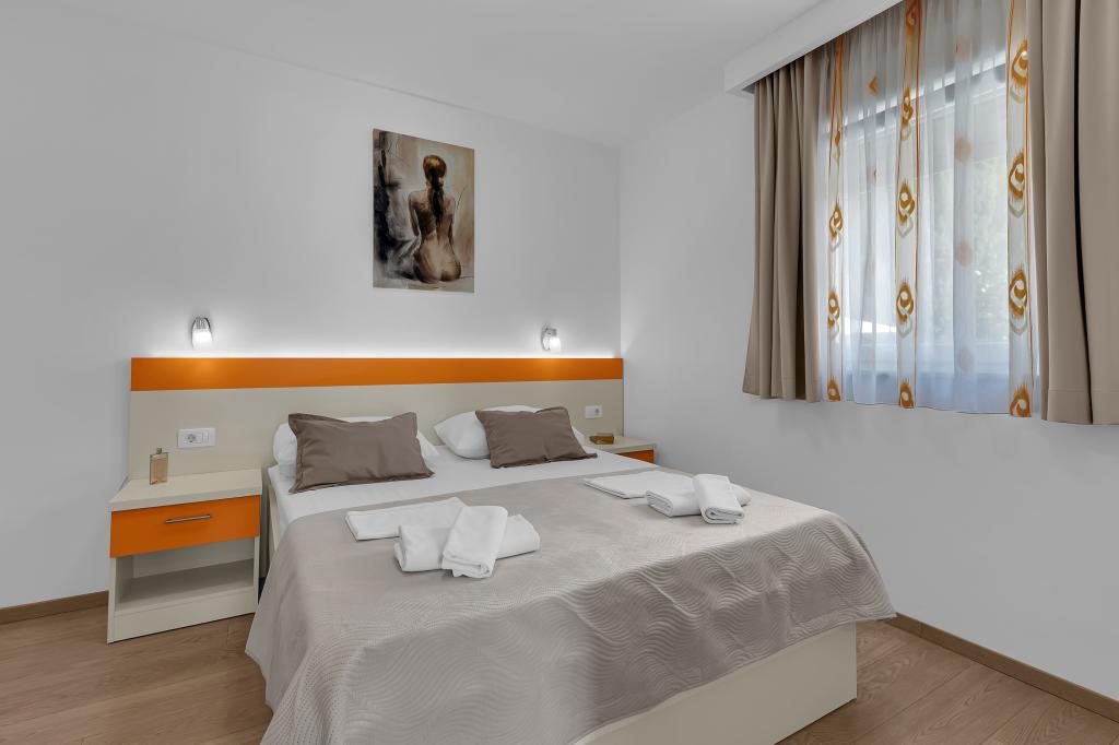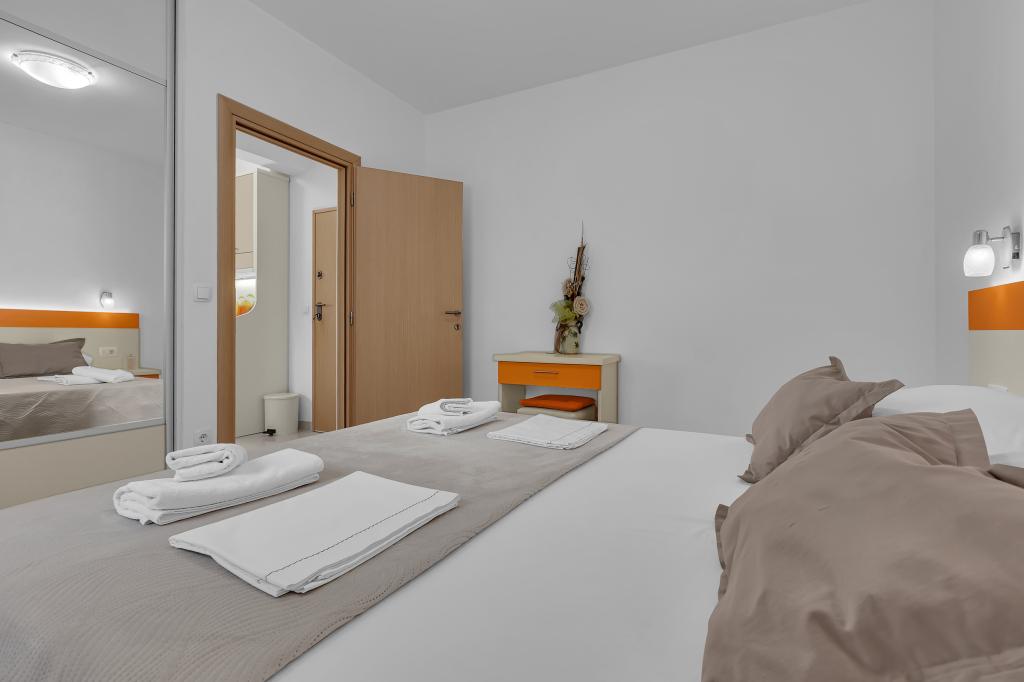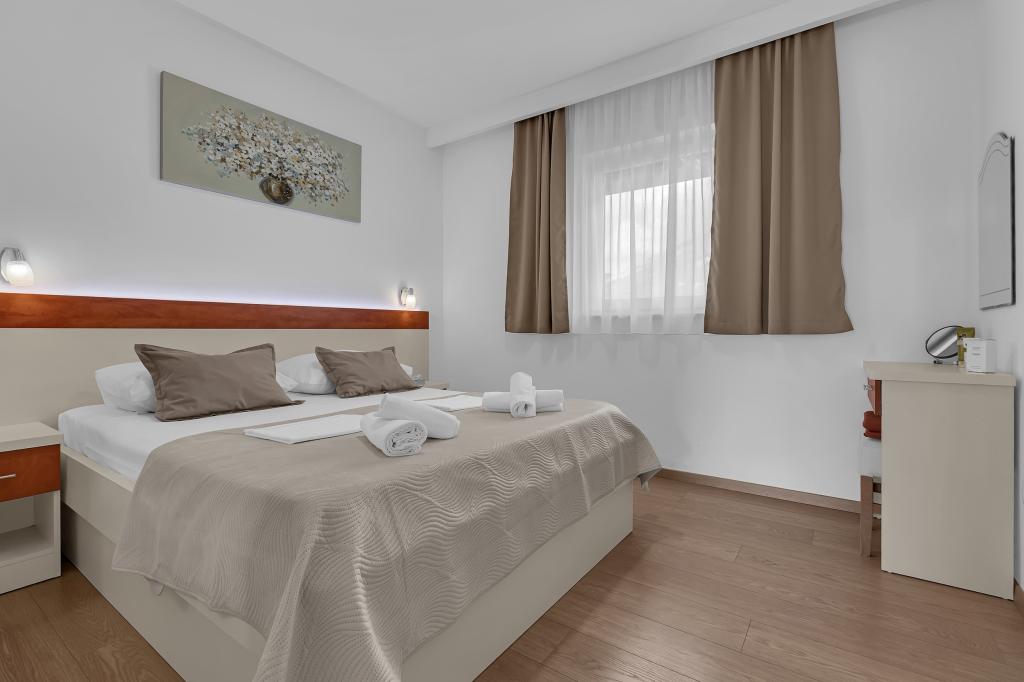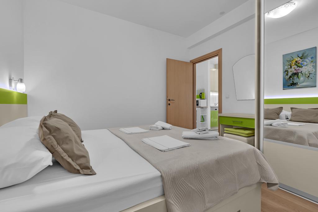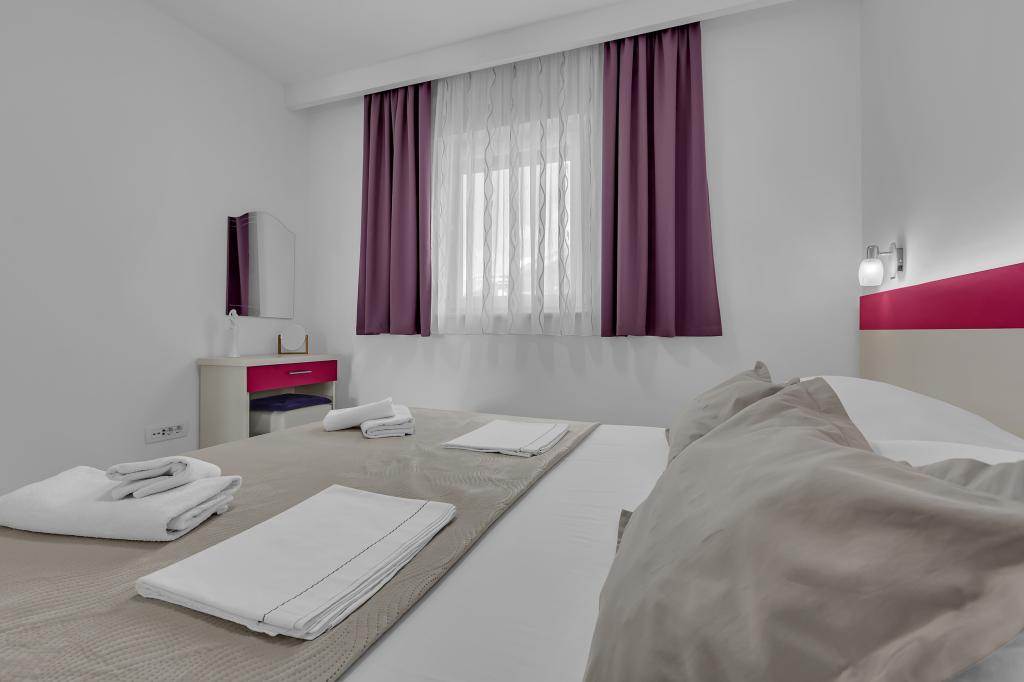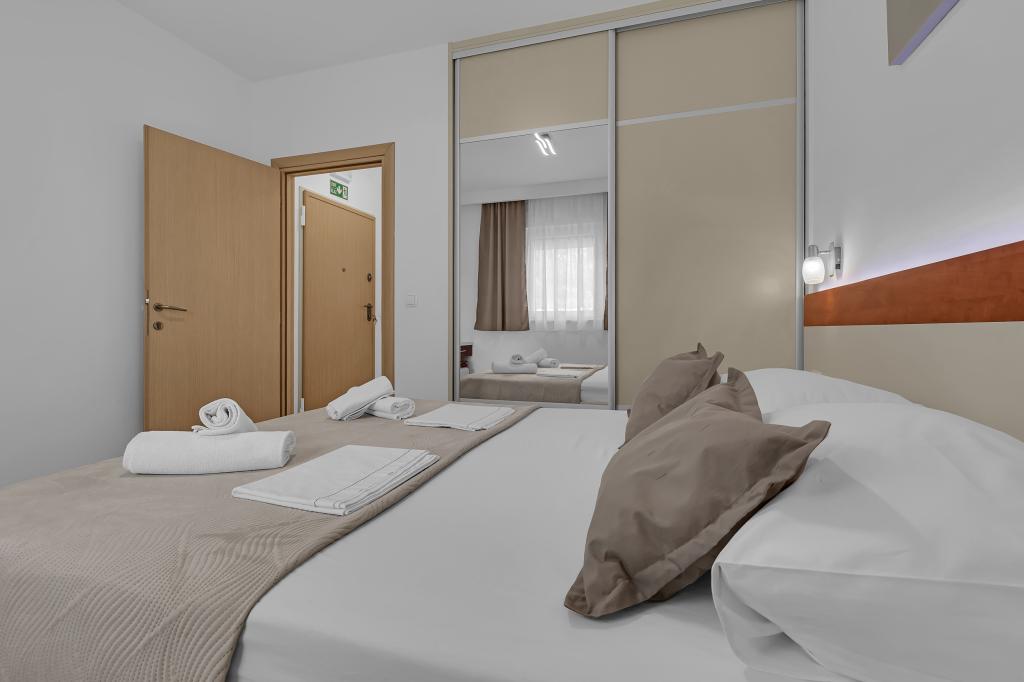 ¡APARTAMENTOS NUEVOS! Todos nuestros apartamentos están modernamente equipados. En total, tenemos seis (6) apartamentos para ofrecer, cinco (5) de los cuales son de un dormitorio y un dúplex de dos dormitorios. En el patio hay una pequeña piscina para los huéspedes, a) Los apartamentos de una habitación (2 adultos y 2 niños) tienen: una habitación con una cama doble, un baño grande con una ducha grande, una cocina moderna totalmente equipada con un comedor y una sala de estar con aire acondicionado y un cómodo sofá cama para dos niños adultos, así como Internet Wi-Fi. Cada uno de estos apartamentos dispone de un amplio balcón de 9 m2 desde el salón. b) Apartamento 4 de dos habitaciones y dos niveles (4 adultos y 2 niños) tiene en el primer piso una moderna habitación con una cama doble y un baño con ducha y WC, una cocina completa con comedor y una sala de estar que tiene un cómodo sofá cama para dos niños adultos. Se accede al segundo piso a través de una escalera de caracol, con una gran habitación, baño y aseo independiente. . Ambas plantas disponen de aire acondicionado.