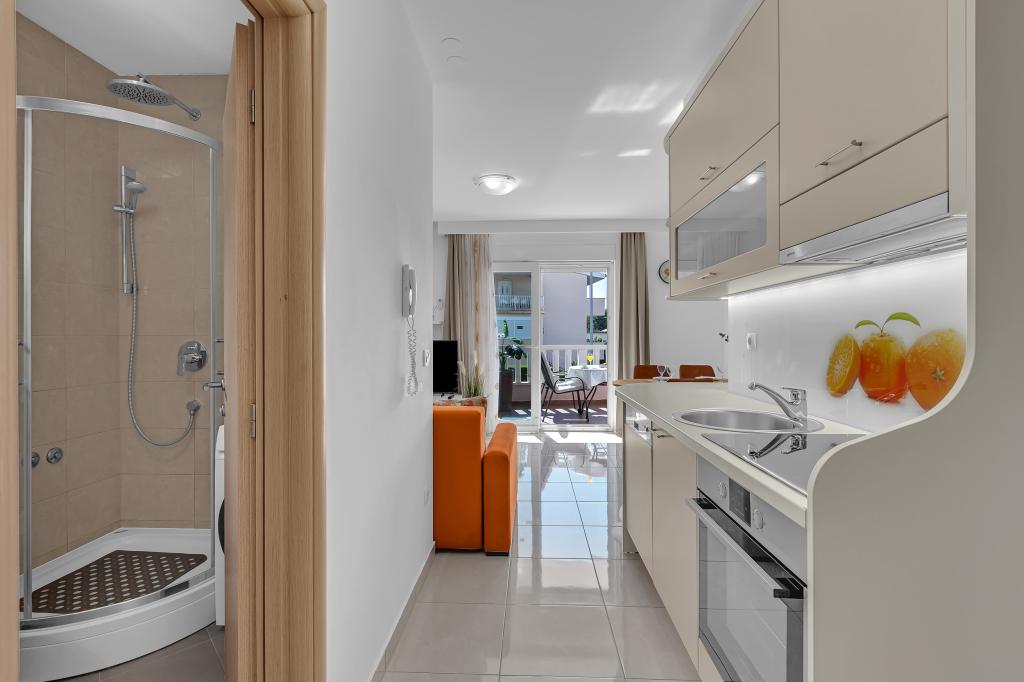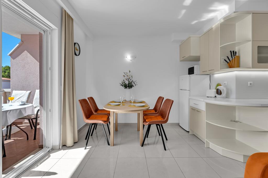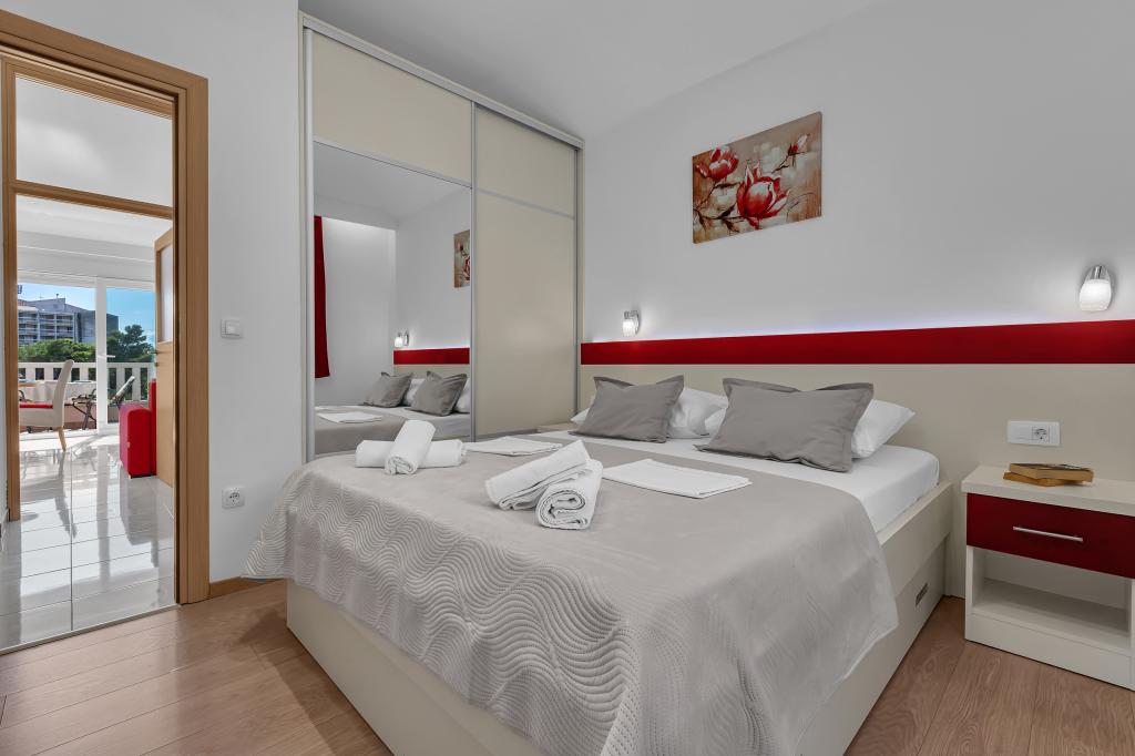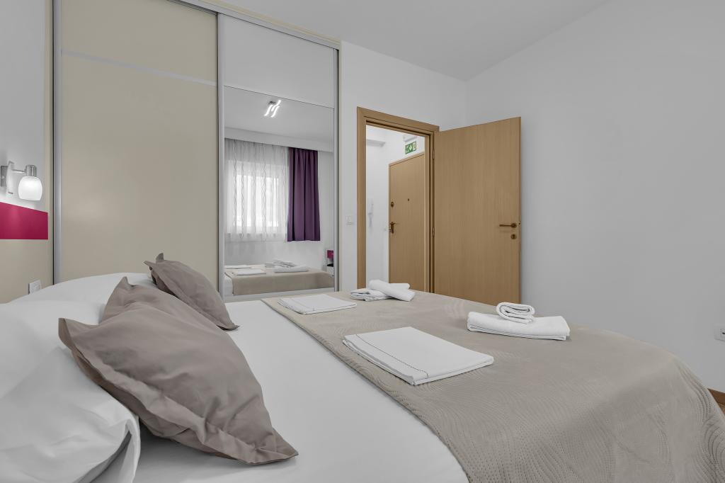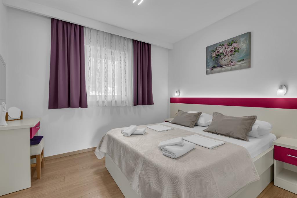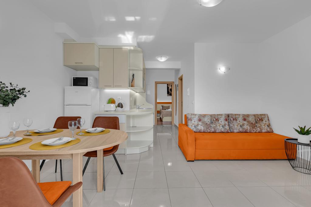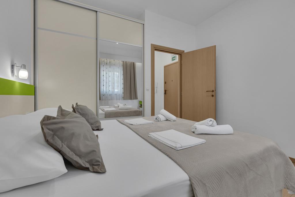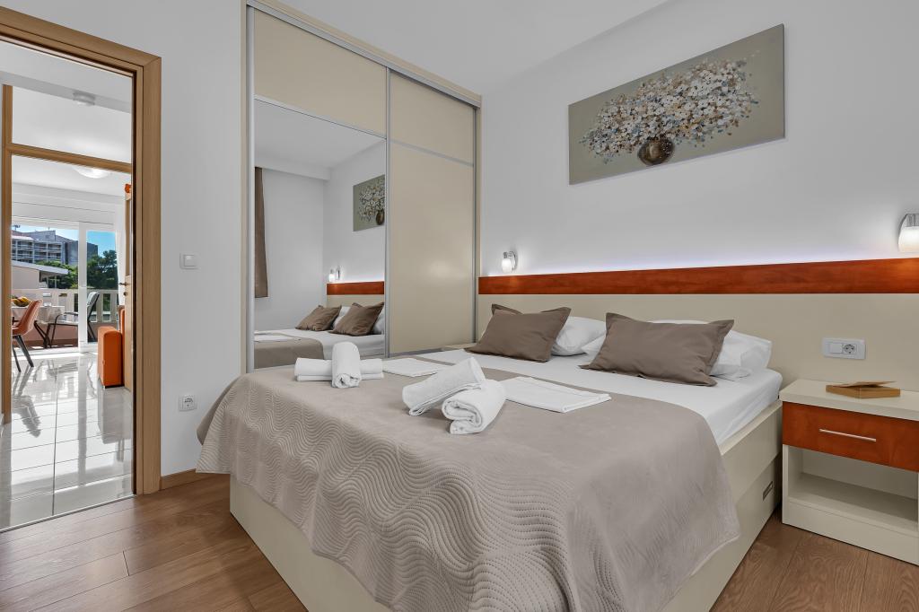 ¡APARTAMENTOS NUEVOS! Todos nuestros apartamentos están modernamente equipados. En total, tenemos seis (6) apartamentos para ofrecer, cinco (5) de los cuales son de un dormitorio y un dúplex de dos dormitorios. En el patio hay una pequeña piscina para los huéspedes, a) Los apartamentos de una habitación (2 adultos y 2 niños) tienen: una habitación con una cama doble, un baño grande con una ducha grande, una cocina moderna totalmente equipada con un comedor y una sala de estar con aire acondicionado y un cómodo sofá cama para dos niños adultos, así como Internet Wi-Fi. Cada uno de estos apartamentos dispone de un amplio balcón de 9 m2 desde el salón. b) Apartamento 4 de dos habitaciones y dos niveles (4 adultos y 2 niños) tiene en el primer piso una moderna habitación con una cama doble y un baño con ducha y WC, una cocina completa con comedor y una sala de estar que tiene un cómodo sofá cama para dos niños adultos. Se accede al segundo piso a través de una escalera de caracol, con una gran habitación, baño y aseo independiente. . Ambas plantas disponen de aire acondicionado.