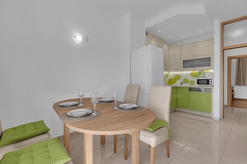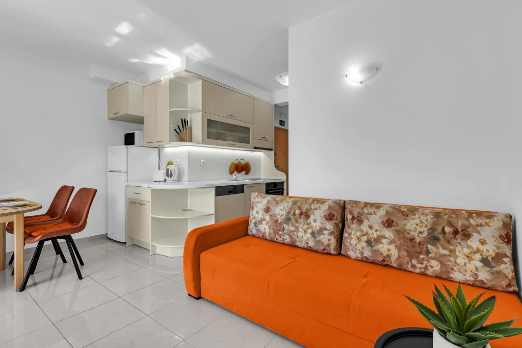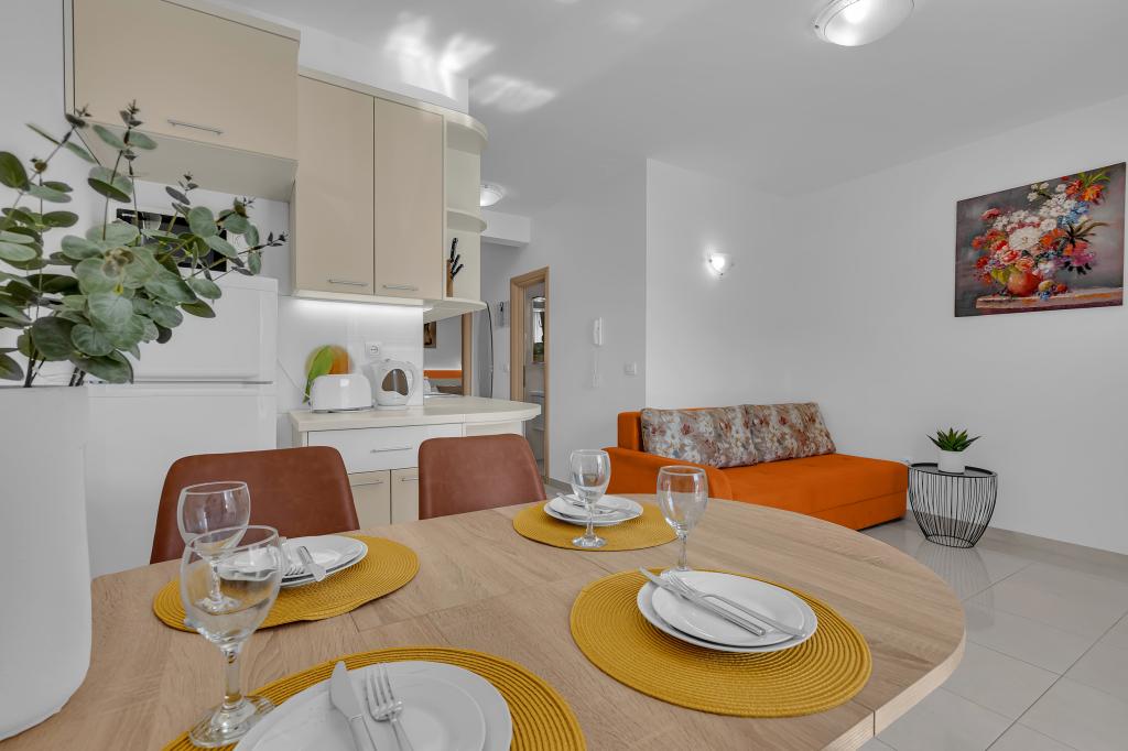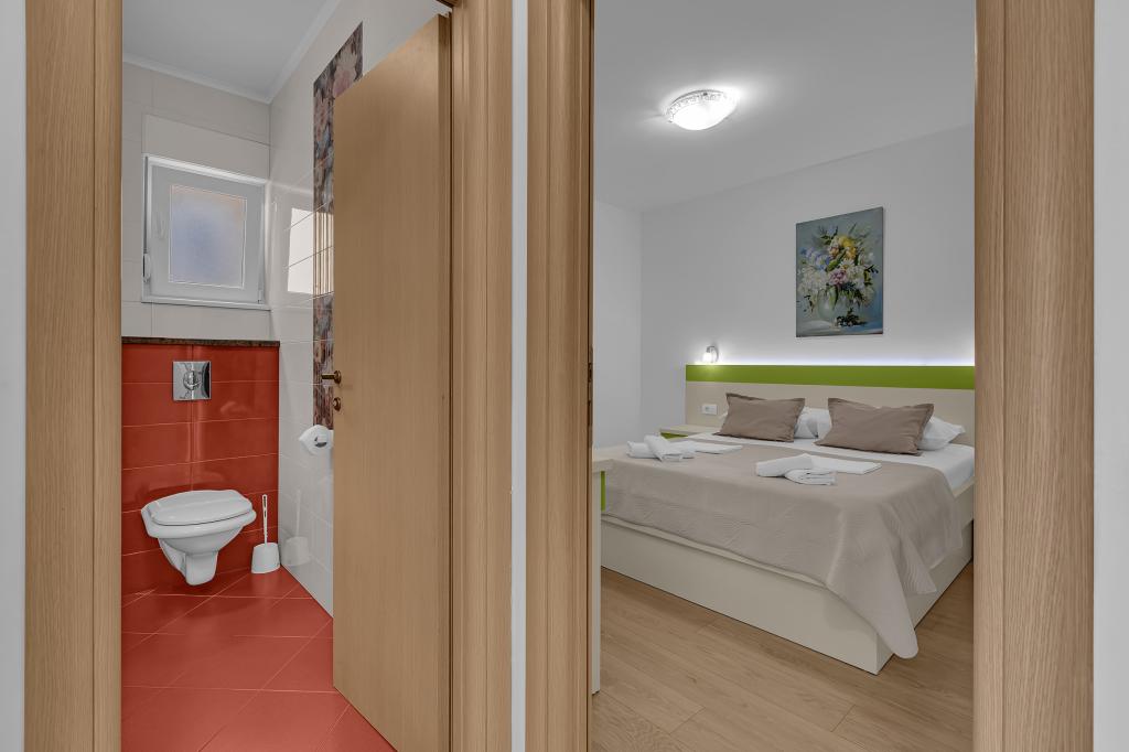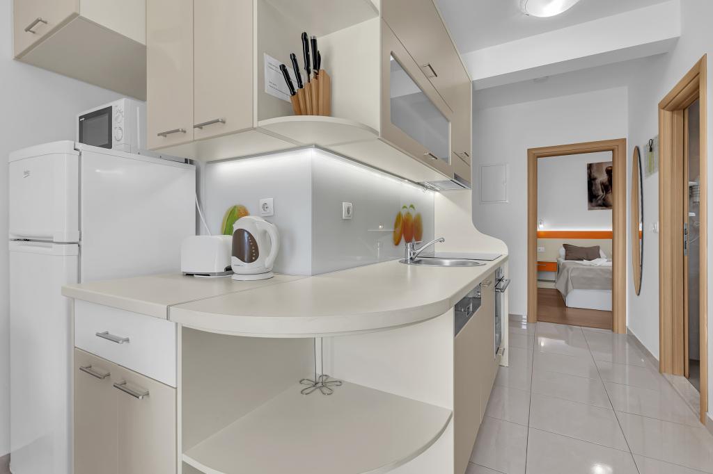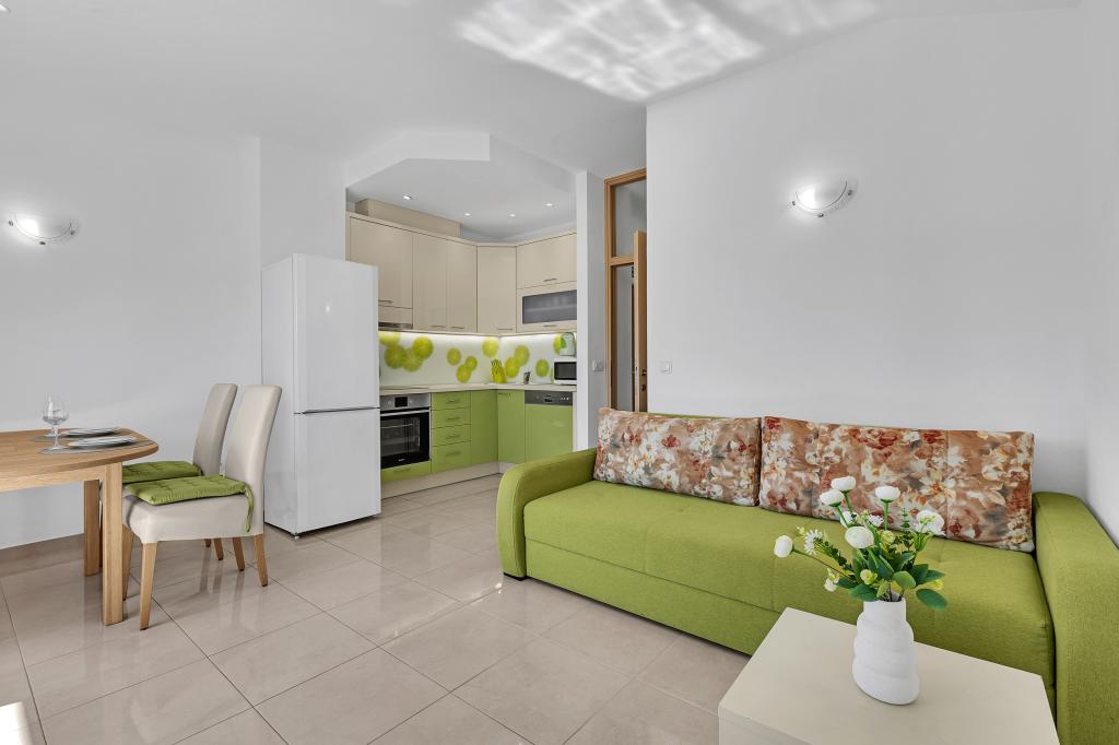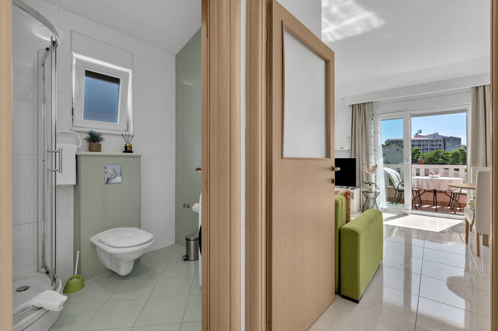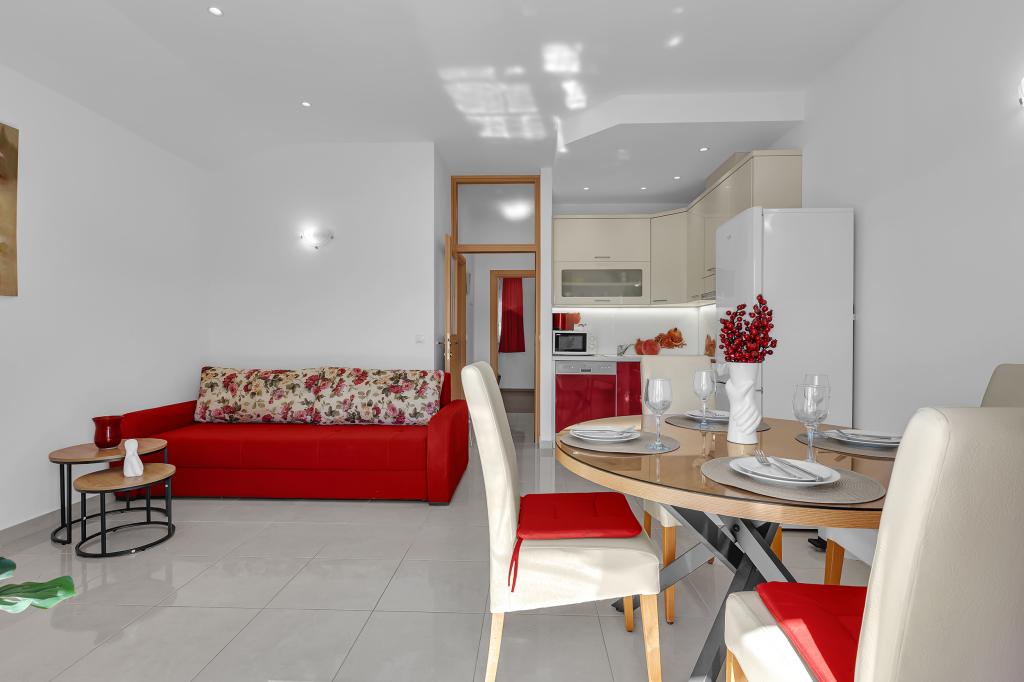 ¡APARTAMENTOS NUEVOS! Todos nuestros apartamentos están modernamente equipados. En total, tenemos seis (6) apartamentos para ofrecer, cinco (5) de los cuales son de un dormitorio y un dúplex de dos dormitorios. En el patio hay una pequeña piscina para los huéspedes, a) Los apartamentos de una habitación (2 adultos y 2 niños) tienen: una habitación con una cama doble, un baño grande con una ducha grande, una cocina moderna totalmente equipada con un comedor y una sala de estar con aire acondicionado y un cómodo sofá cama para dos niños adultos, así como Internet Wi-Fi. Cada uno de estos apartamentos dispone de un amplio balcón de 9 m2 desde el salón. b) Apartamento 4 de dos habitaciones y dos niveles (4 adultos y 2 niños) tiene en el primer piso una moderna habitación con una cama doble y un baño con ducha y WC, una cocina completa con comedor y una sala de estar que tiene un cómodo sofá cama para dos niños adultos. Se accede al segundo piso a través de una escalera de caracol, con una gran habitación, baño y aseo independiente. . Ambas plantas disponen de aire acondicionado.