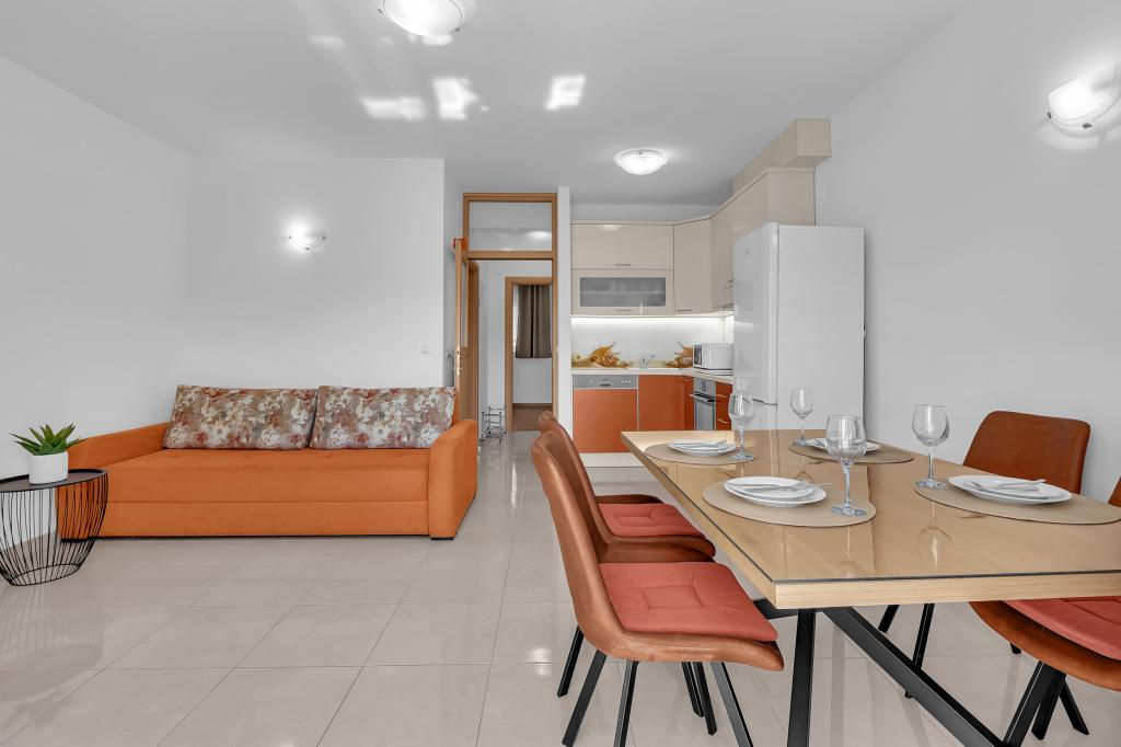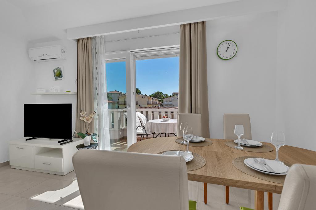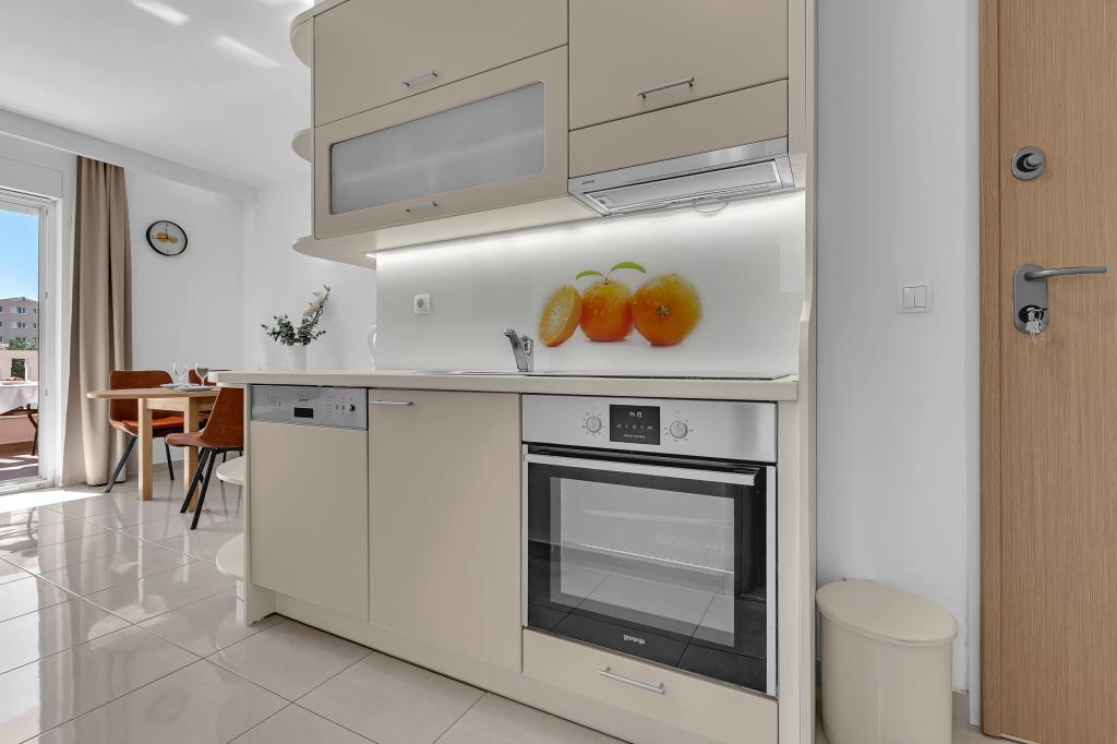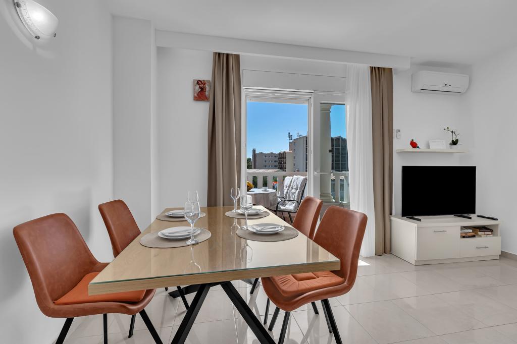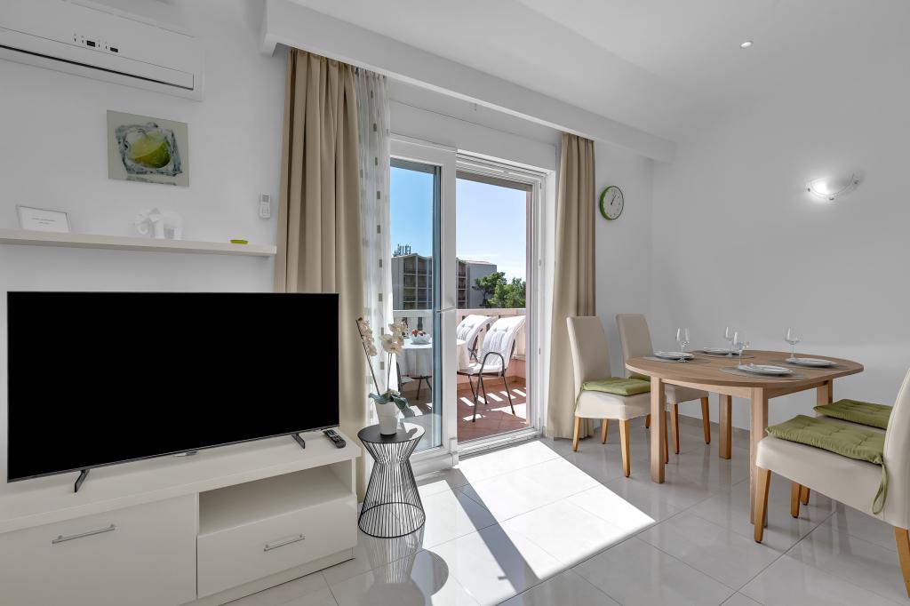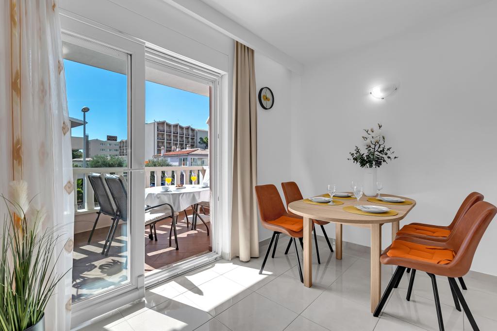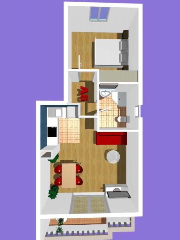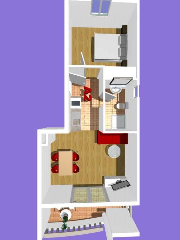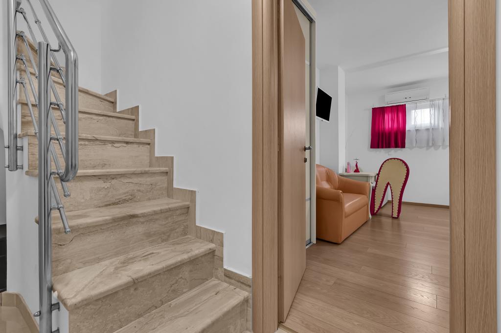 ¡APARTAMENTOS NUEVOS! Todos nuestros apartamentos están modernamente equipados. En total, tenemos seis (6) apartamentos para ofrecer, cinco (5) de los cuales son de un dormitorio y un dúplex de dos dormitorios. En el patio hay una pequeña piscina para los huéspedes, a) Los apartamentos de una habitación (2 adultos y 2 niños) tienen: una habitación con una cama doble, un baño grande con una ducha grande, una cocina moderna totalmente equipada con un comedor y una sala de estar con aire acondicionado y un cómodo sofá cama para dos niños adultos, así como Internet Wi-Fi. Cada uno de estos apartamentos dispone de un amplio balcón de 9 m2 desde el salón. b) Apartamento 4 de dos habitaciones y dos niveles (4 adultos y 2 niños) tiene en el primer piso una moderna habitación con una cama doble y un baño con ducha y WC, una cocina completa con comedor y una sala de estar que tiene un cómodo sofá cama para dos niños adultos. Se accede al segundo piso a través de una escalera de caracol, con una gran habitación, baño y aseo independiente. . Ambas plantas disponen de aire acondicionado.