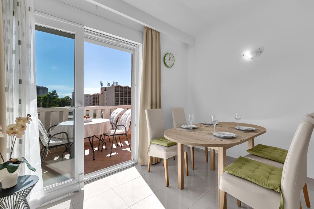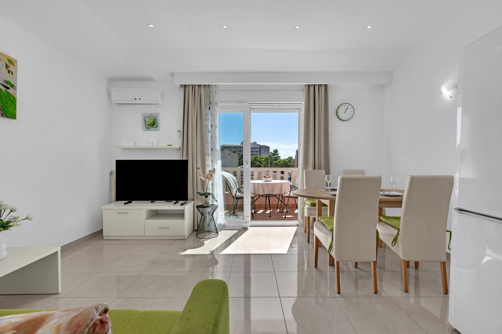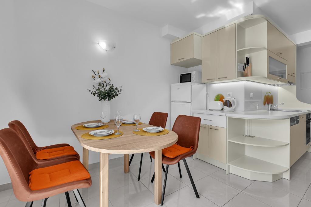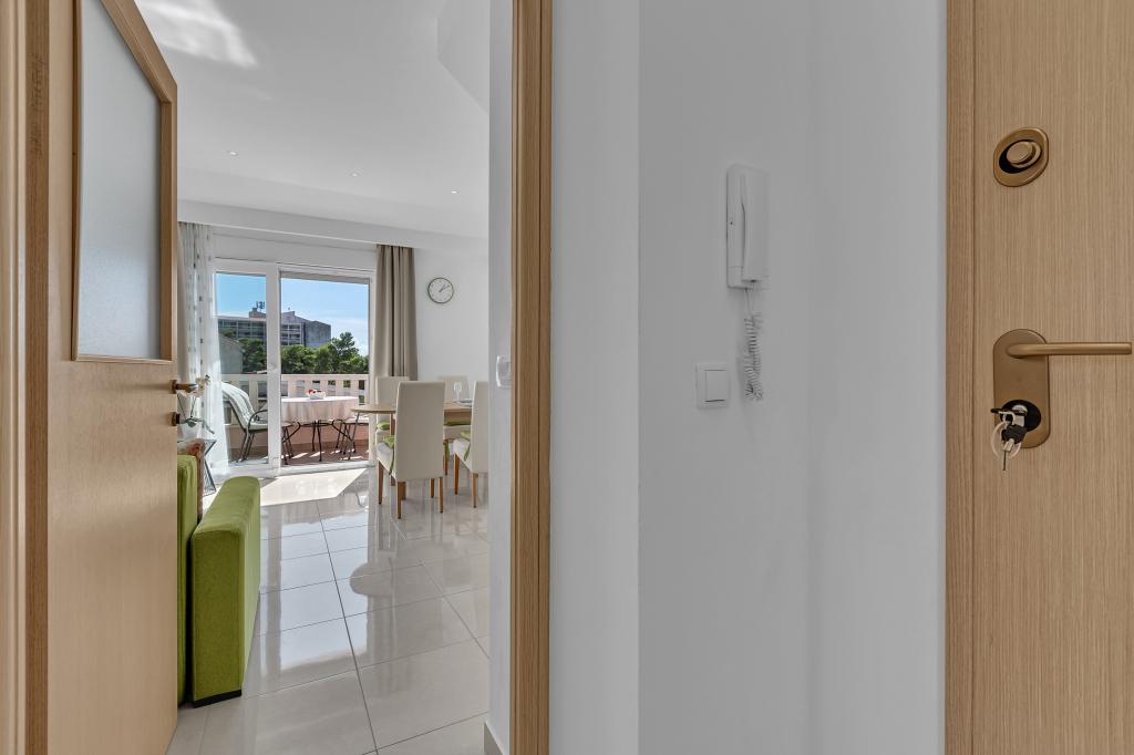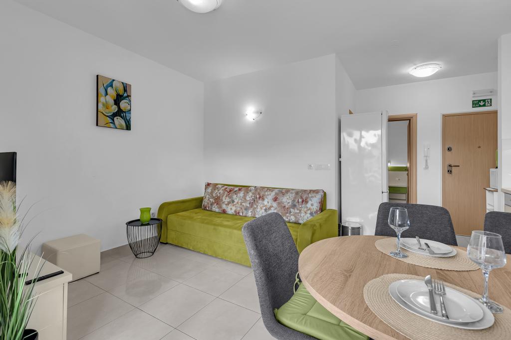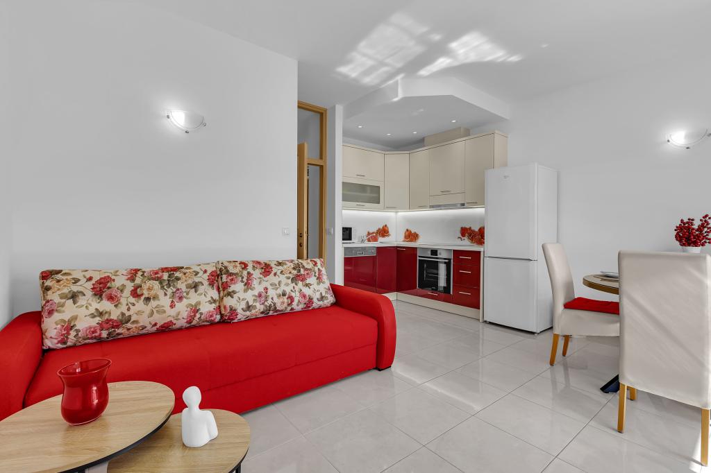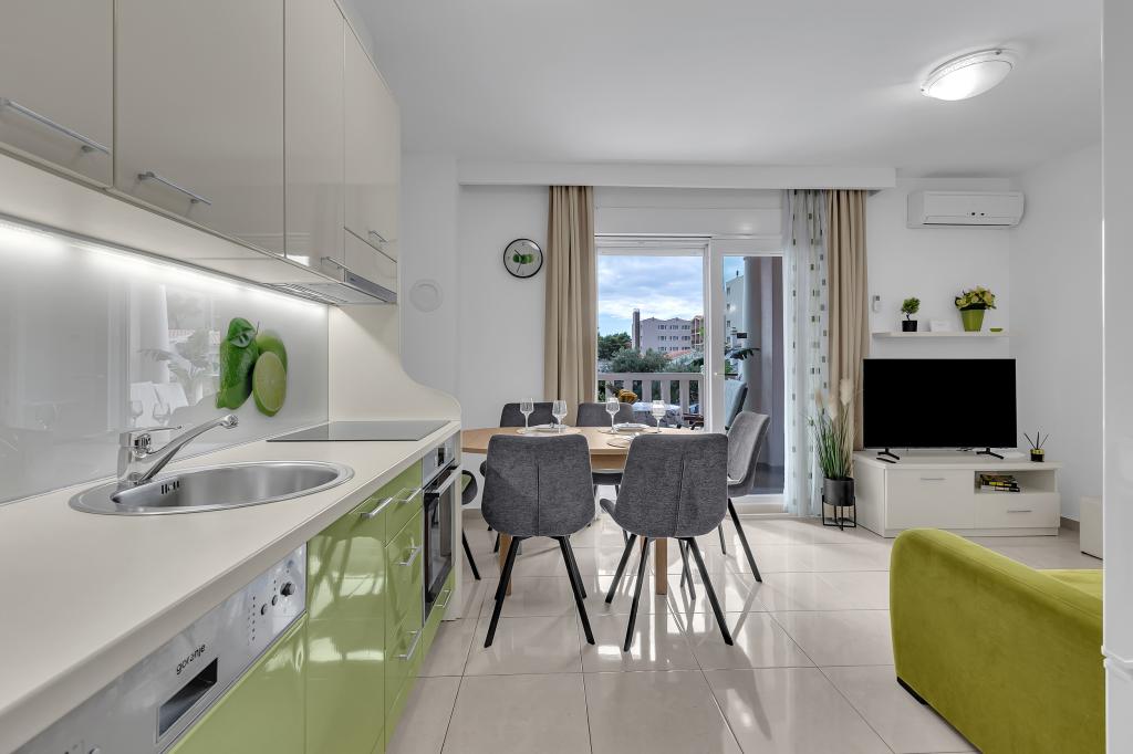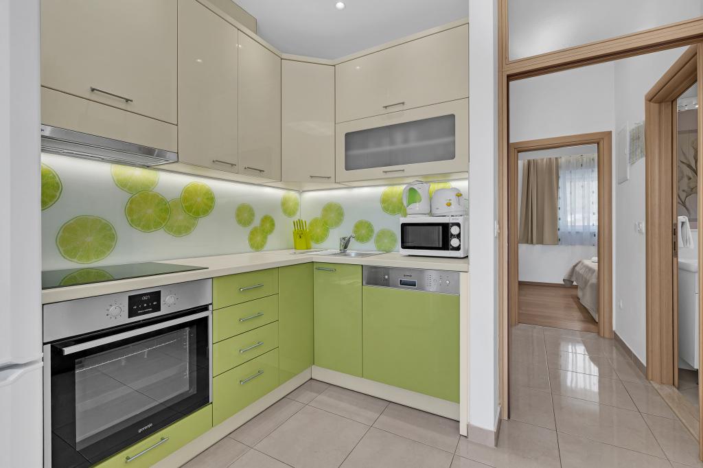 ¡APARTAMENTOS NUEVOS! Todos nuestros apartamentos están modernamente equipados. En total, tenemos seis (6) apartamentos para ofrecer, cinco (5) de los cuales son de un dormitorio y un dúplex de dos dormitorios. En el patio hay una pequeña piscina para los huéspedes, a) Los apartamentos de una habitación (2 adultos y 2 niños) tienen: una habitación con una cama doble, un baño grande con una ducha grande, una cocina moderna totalmente equipada con un comedor y una sala de estar con aire acondicionado y un cómodo sofá cama para dos niños adultos, así como Internet Wi-Fi. Cada uno de estos apartamentos dispone de un amplio balcón de 9 m2 desde el salón. b) Apartamento 4 de dos habitaciones y dos niveles (4 adultos y 2 niños) tiene en el primer piso una moderna habitación con una cama doble y un baño con ducha y WC, una cocina completa con comedor y una sala de estar que tiene un cómodo sofá cama para dos niños adultos. Se accede al segundo piso a través de una escalera de caracol, con una gran habitación, baño y aseo independiente. . Ambas plantas disponen de aire acondicionado.