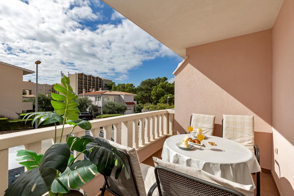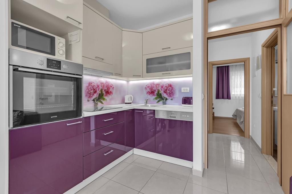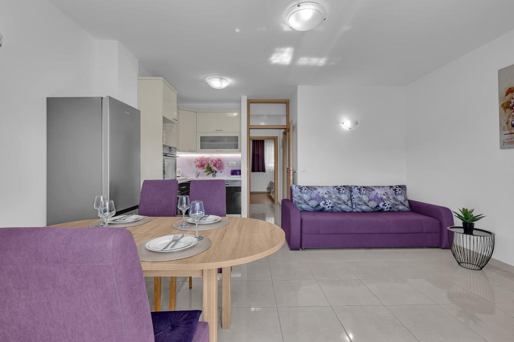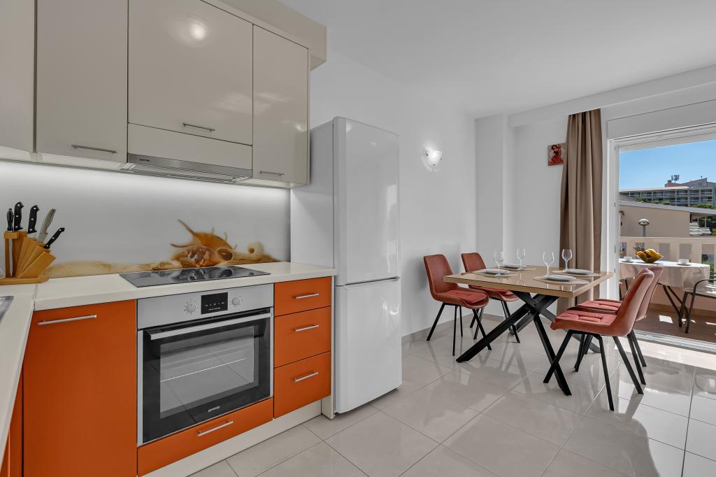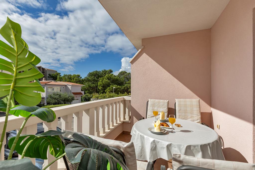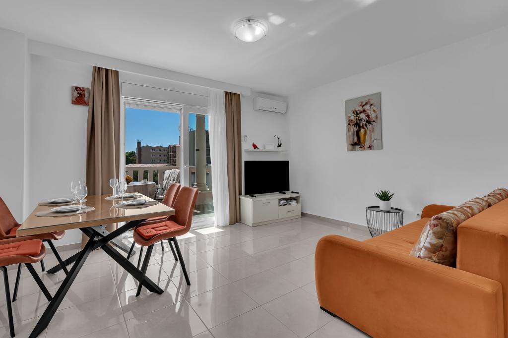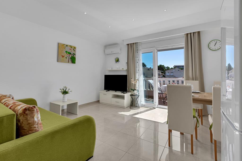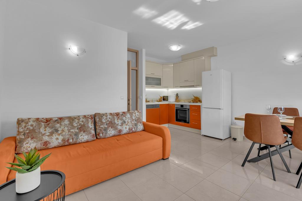 ¡APARTAMENTOS NUEVOS! Todos nuestros apartamentos están modernamente equipados. En total, tenemos seis (6) apartamentos para ofrecer, cinco (5) de los cuales son de un dormitorio y un dúplex de dos dormitorios. En el patio hay una pequeña piscina para los huéspedes, a) Los apartamentos de una habitación (2 adultos y 2 niños) tienen: una habitación con una cama doble, un baño grande con una ducha grande, una cocina moderna totalmente equipada con un comedor y una sala de estar con aire acondicionado y un cómodo sofá cama para dos niños adultos, así como Internet Wi-Fi. Cada uno de estos apartamentos dispone de un amplio balcón de 9 m2 desde el salón. b) Apartamento 4 de dos habitaciones y dos niveles (4 adultos y 2 niños) tiene en el primer piso una moderna habitación con una cama doble y un baño con ducha y WC, una cocina completa con comedor y una sala de estar que tiene un cómodo sofá cama para dos niños adultos. Se accede al segundo piso a través de una escalera de caracol, con una gran habitación, baño y aseo independiente. . Ambas plantas disponen de aire acondicionado.