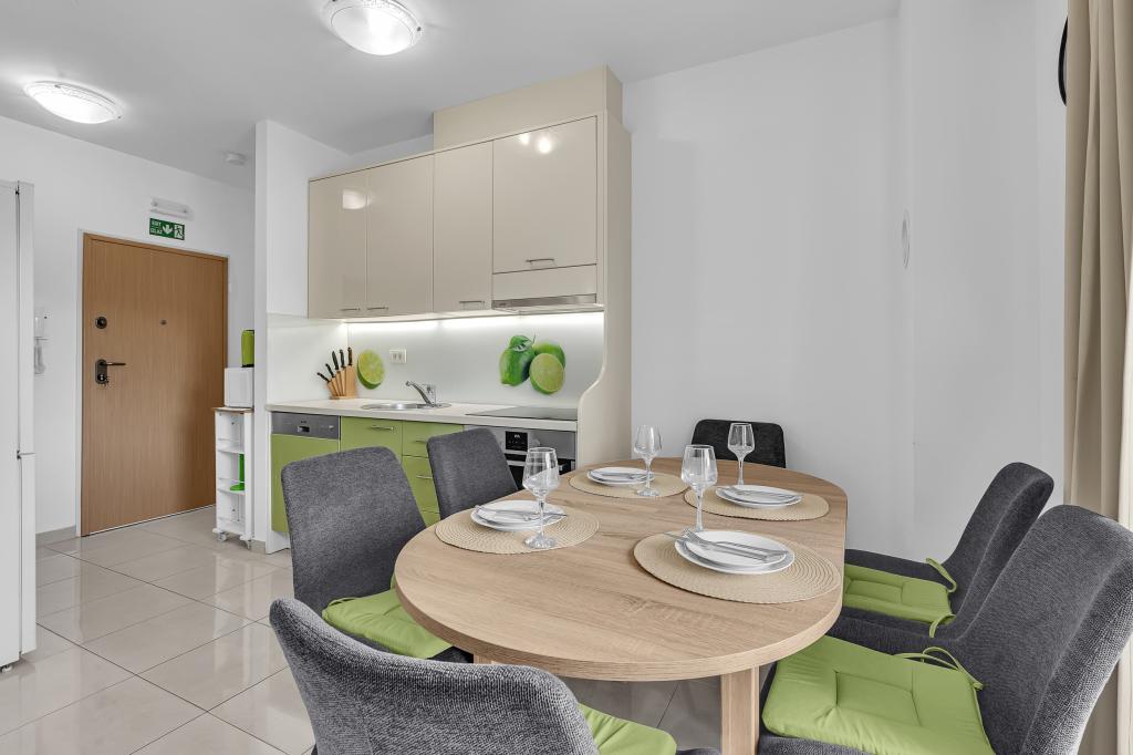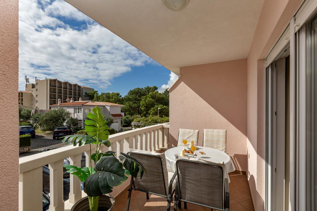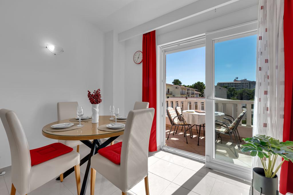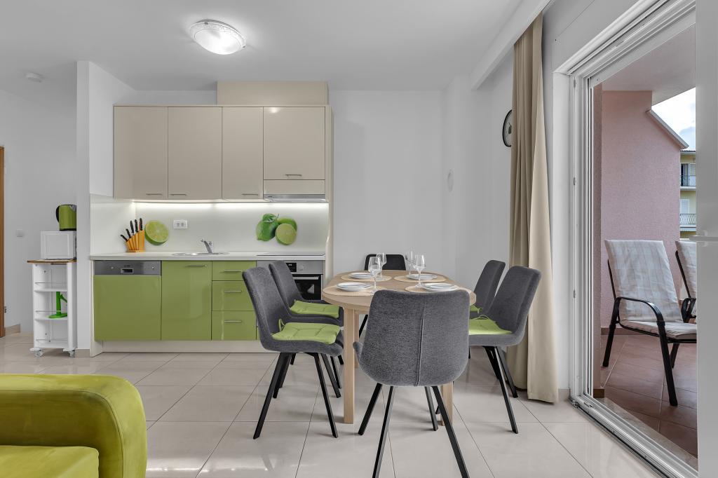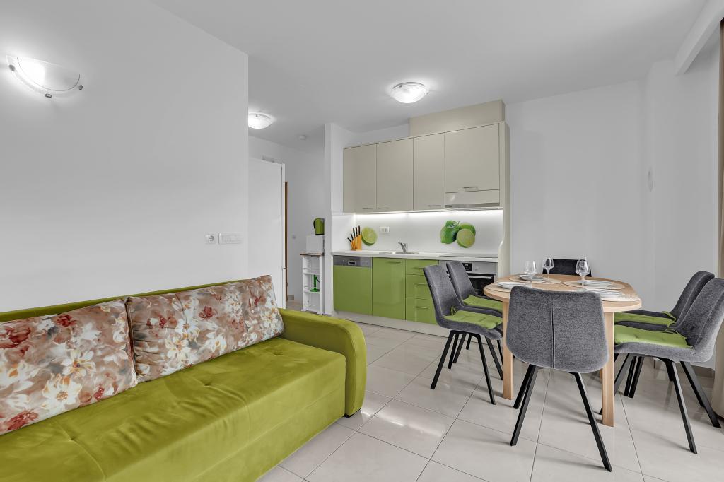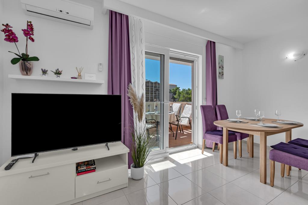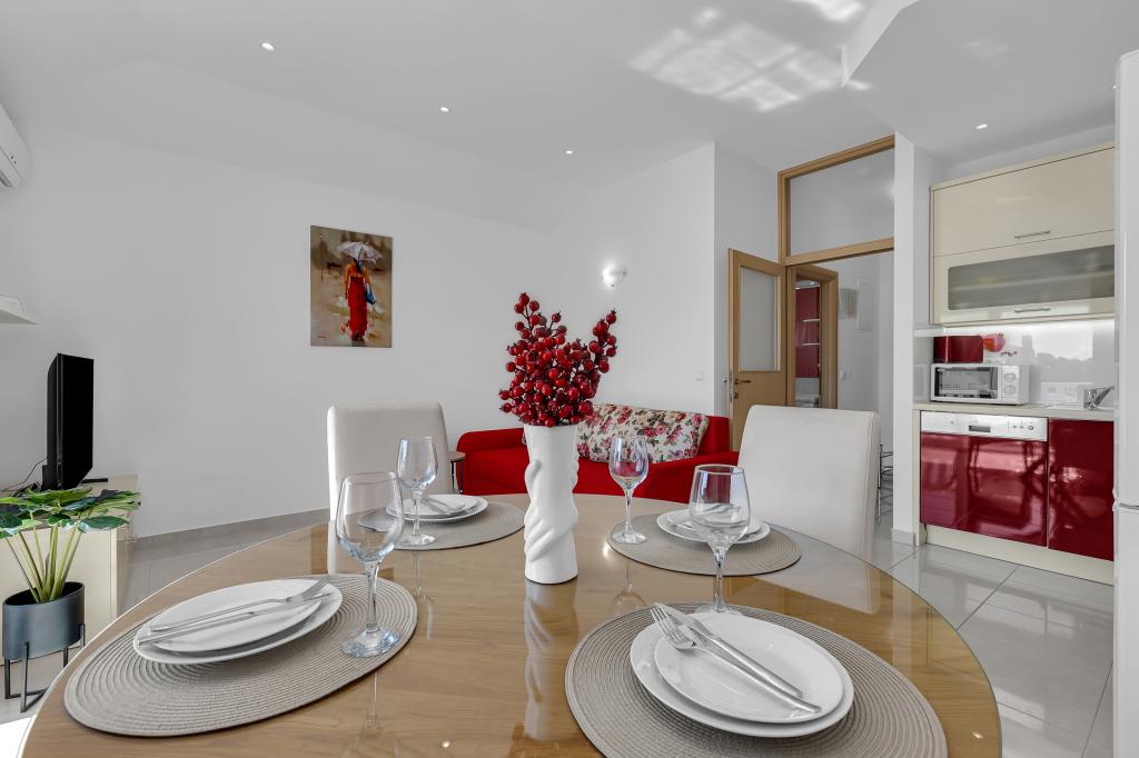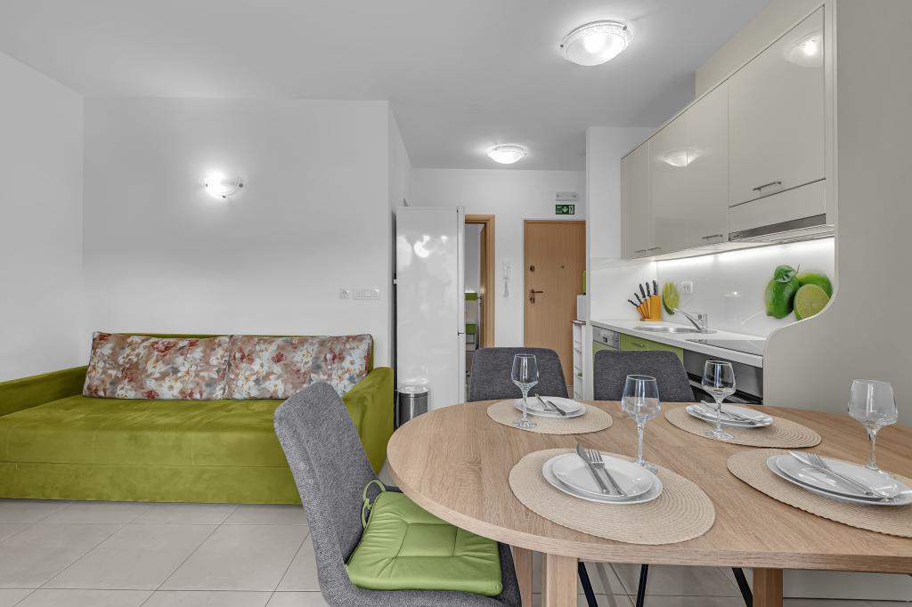 ¡APARTAMENTOS NUEVOS! Todos nuestros apartamentos están modernamente equipados. En total, tenemos seis (6) apartamentos para ofrecer, cinco (5) de los cuales son de un dormitorio y un dúplex de dos dormitorios. En el patio hay una pequeña piscina para los huéspedes, a) Los apartamentos de una habitación (2 adultos y 2 niños) tienen: una habitación con una cama doble, un baño grande con una ducha grande, una cocina moderna totalmente equipada con un comedor y una sala de estar con aire acondicionado y un cómodo sofá cama para dos niños adultos, así como Internet Wi-Fi. Cada uno de estos apartamentos dispone de un amplio balcón de 9 m2 desde el salón. b) Apartamento 4 de dos habitaciones y dos niveles (4 adultos y 2 niños) tiene en el primer piso una moderna habitación con una cama doble y un baño con ducha y WC, una cocina completa con comedor y una sala de estar que tiene un cómodo sofá cama para dos niños adultos. Se accede al segundo piso a través de una escalera de caracol, con una gran habitación, baño y aseo independiente. . Ambas plantas disponen de aire acondicionado.