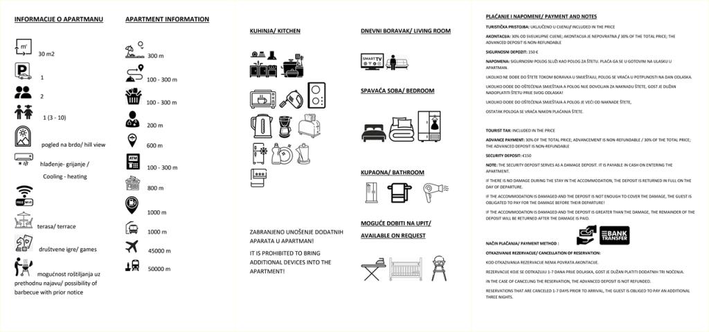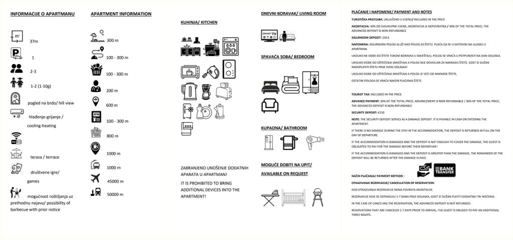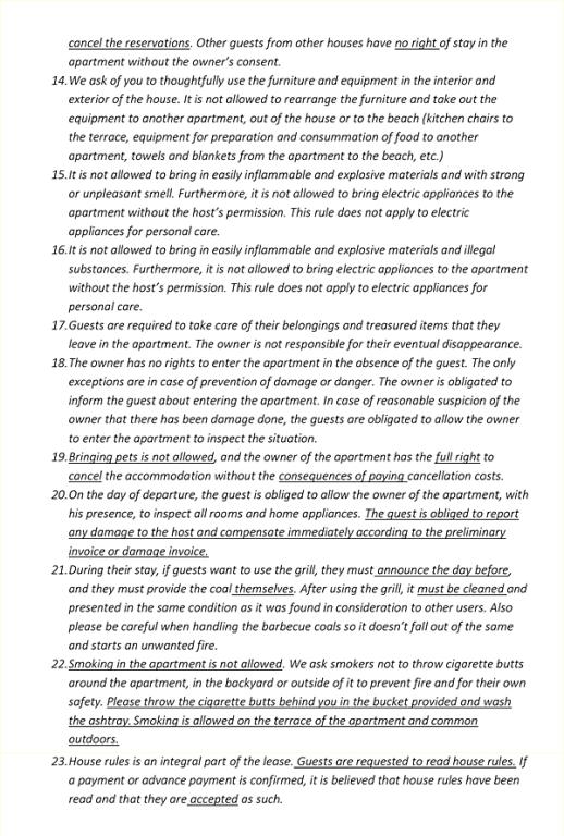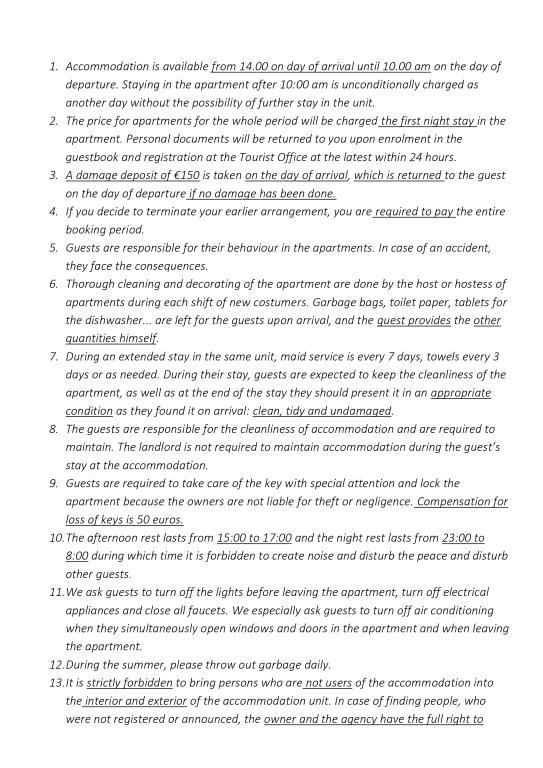 Tasa turistica está incluida en el precio.El anticipo es la cantidad que el huésped abona a la cuenta del propietario del apartamento. Este importe garantiza su llegada al propietario y la reserva del apartamento para una fecha y un número determinado de personas. Además, constituye una compensación en caso de no presentarse. Se requiere un anticipo del 30% del precio total, que no es reembolsable. El resto del importe lo abona el huésped al entrar en el apartamento. Tras el pago y el registro, se entrega la factura y se devuelven los documentos. A su llegada, el huésped abona una fianza de 150 € por daños, que se le devolverá el día de salida si no ha causado ningún daño. En caso de daños, la fianza queda en poder del propietario del apartamento para cubrir el importe de los daños. Si el importe de los daños es superior a la fianza, el huésped está obligado a pagar de inmediato. Si decide finalizar su estancia antes de lo previsto, está obligado a abonar el importe total. En caso de incumplimiento de las normas de la casa, la agencia o el propietario del apartamento tienen derecho a cancelar la reserva, devolviéndose el importe desde el día siguiente hasta el final de la estancia.