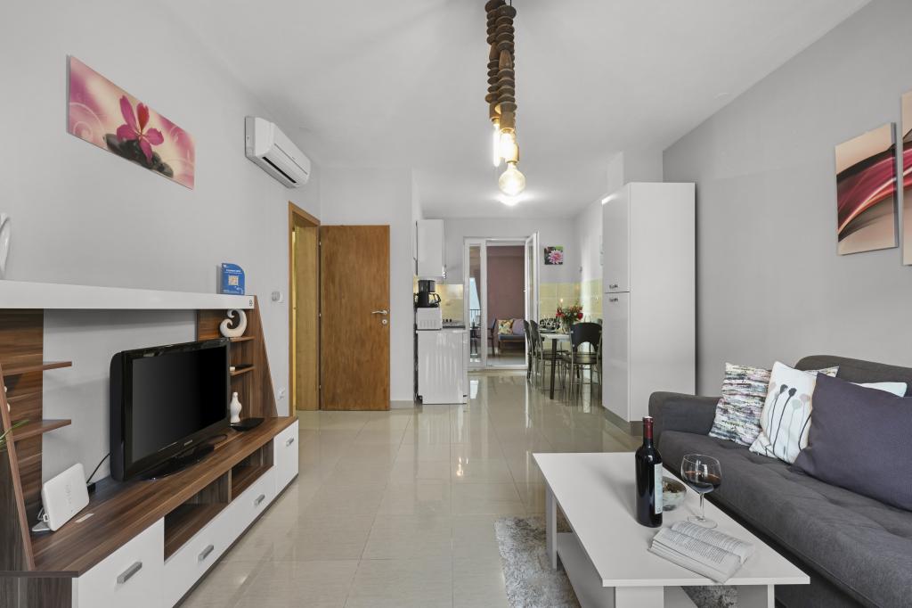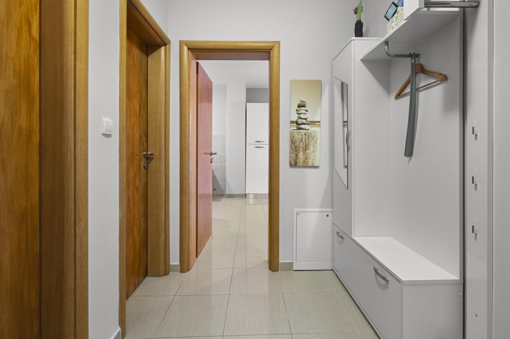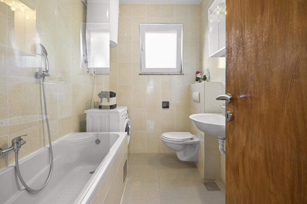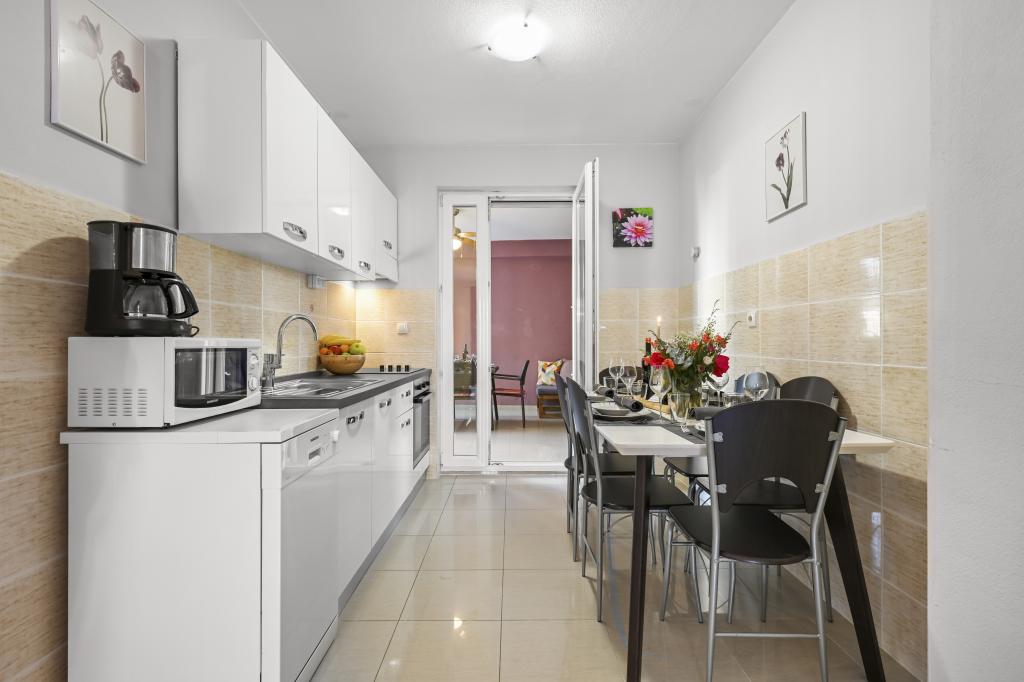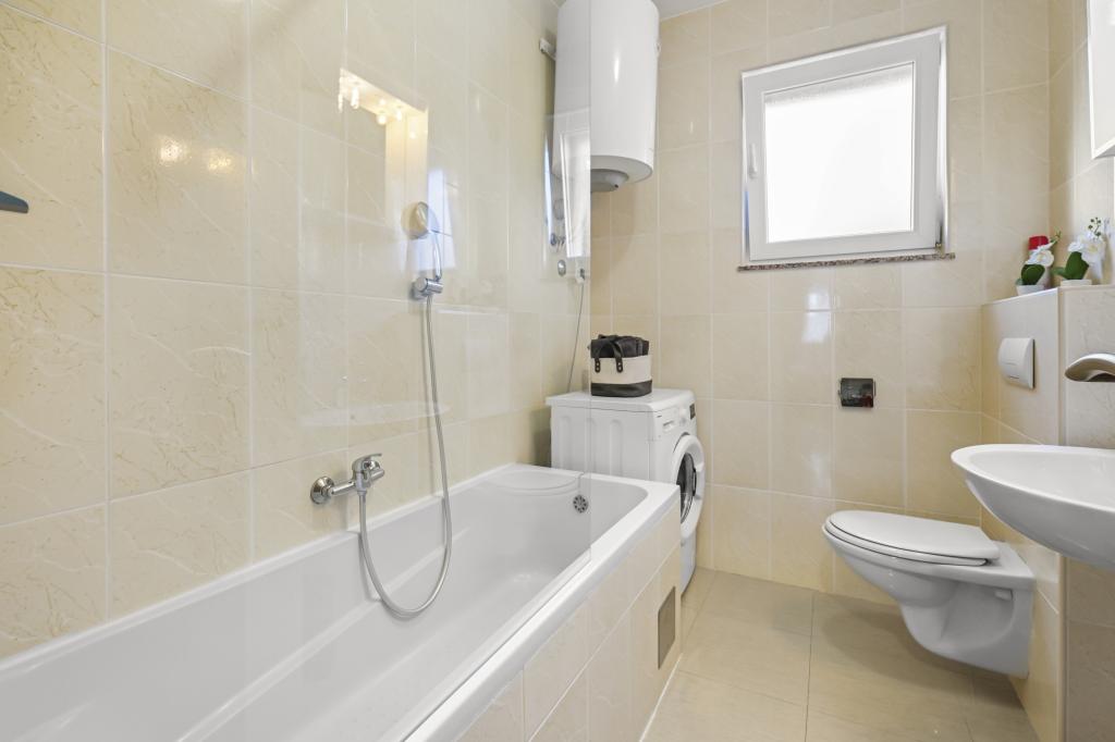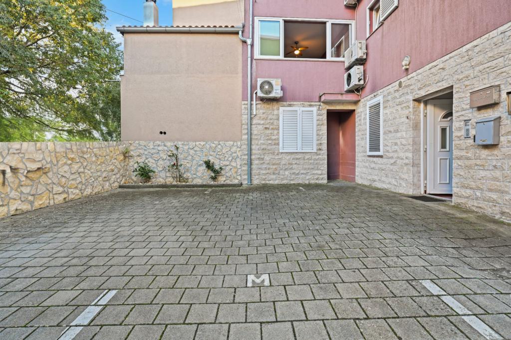 El apartamento Majviva goza de una ubicación privilegiada en la encantadora localidad de Biograd na Moru, un pequeño pueblo ideal para familias. Como su nombre indica, está rodeado por el mar y magníficas playas en tres de sus lados. Se encuentra en pleno centro, en una calle tranquila a tan solo 150 metros de la playa de Dražice, galardonada con la Bandera Azul, una de las playas más bellas del Adriático. El apartamento, totalmente equipado con un estilo moderno, está situado en la primera planta de un pequeño edificio con solo tres apartamentos. En el patio del edificio hay una plaza de aparcamiento privada para un coche, marcada con la letra M (la inicial del nombre del apartamento). El apartamento dispone de dos dormitorios con camas dobles, un salón con un amplio sofá esquinero que se convierte en cama para dos personas más, dos baños (uno con bañera y otro con ducha), una cocina totalmente equipada (nevera grande con congelador, lavavajillas, cafetera, hervidor de agua, horno, etc.) y una amplia terraza cubierta. Su ubicación ideal le permitirá disfrutar de una relajación total, ya que no necesitará utilizar el coche durante toda su estancia.