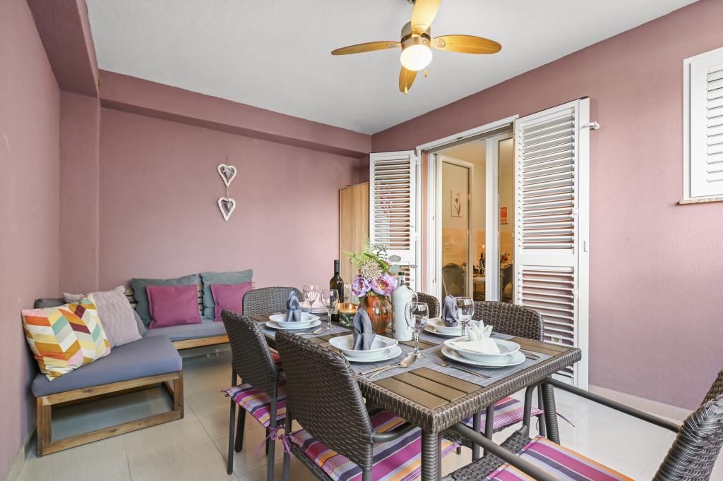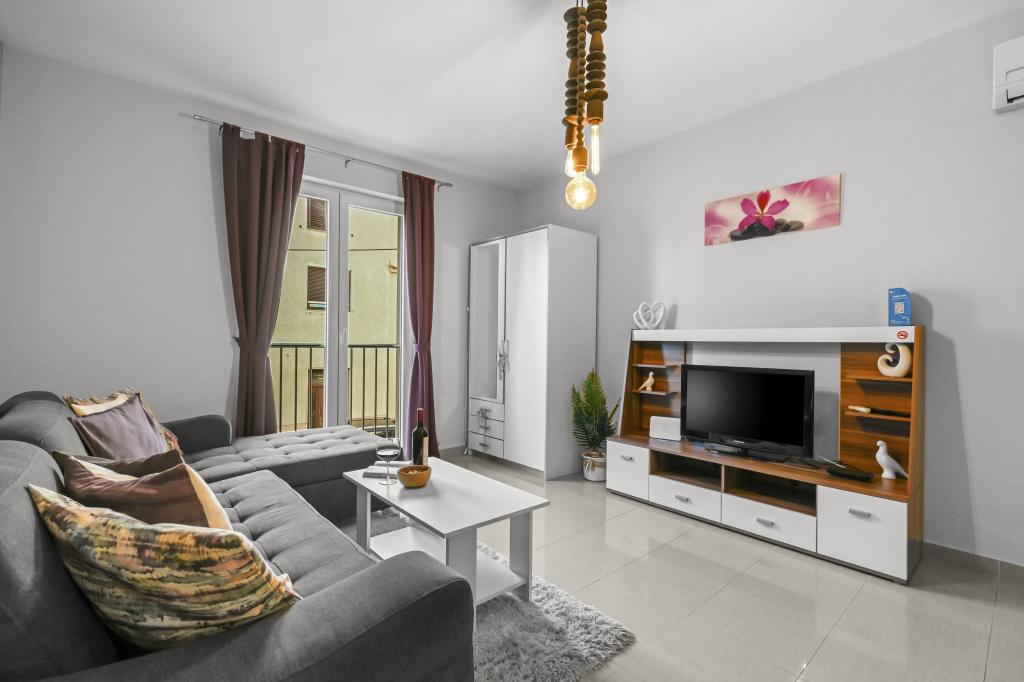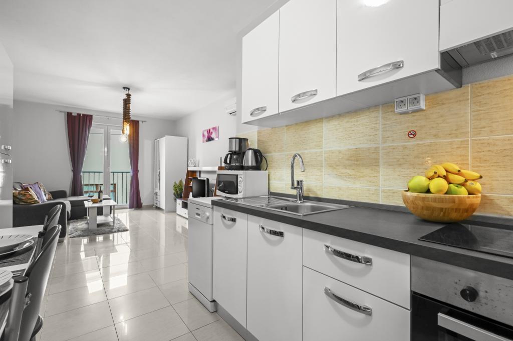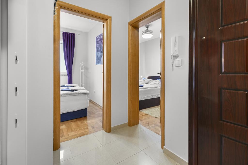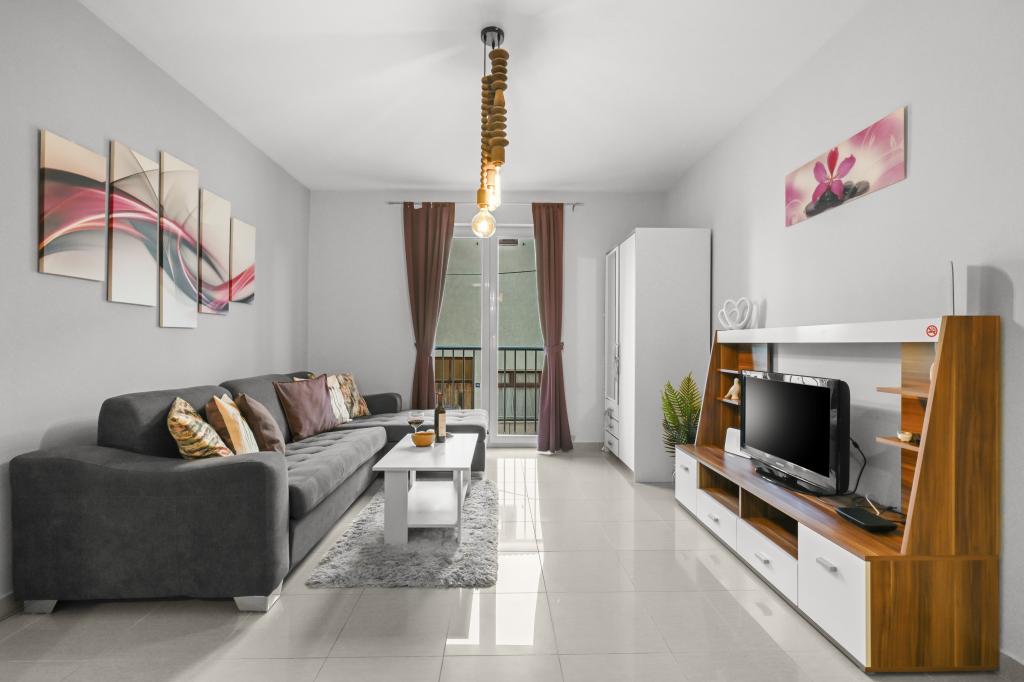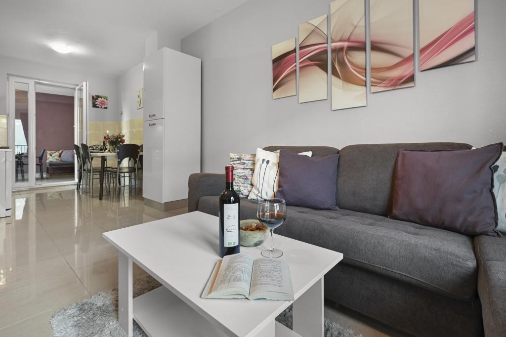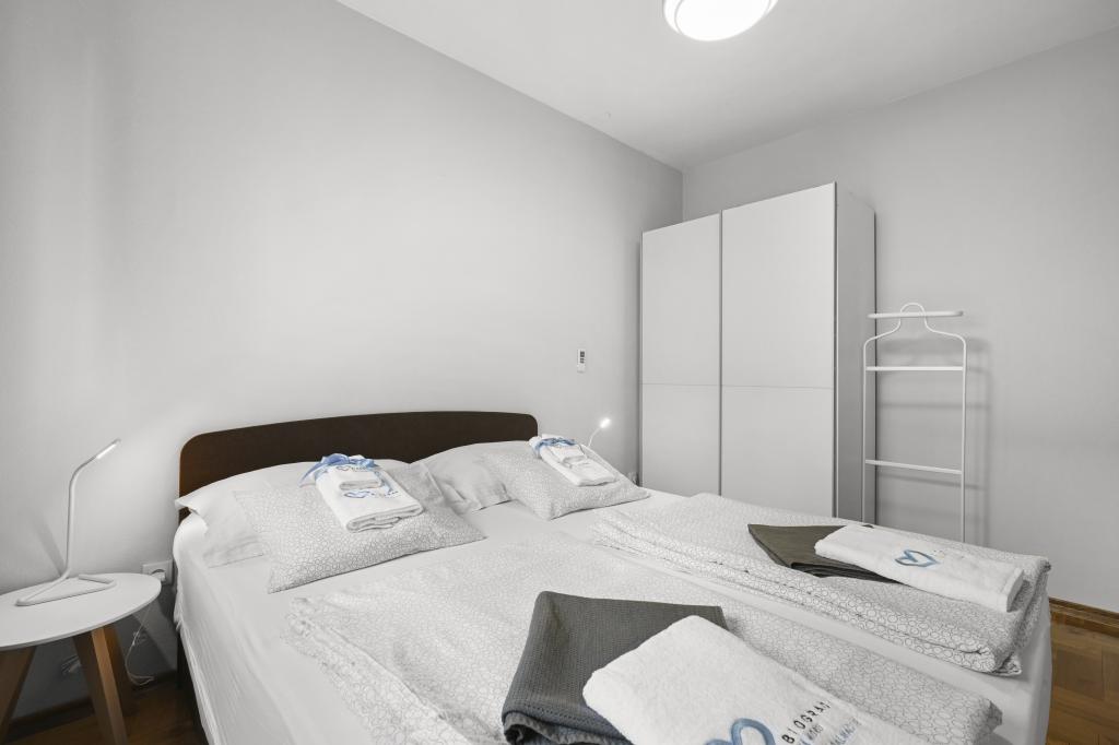 El apartamento Majviva goza de una ubicación privilegiada en la encantadora localidad de Biograd na Moru, un pequeño pueblo ideal para familias. Como su nombre indica, está rodeado por el mar y magníficas playas en tres de sus lados. Se encuentra en pleno centro, en una calle tranquila a tan solo 150 metros de la playa de Dražice, galardonada con la Bandera Azul, una de las playas más bellas del Adriático. El apartamento, totalmente equipado con un estilo moderno, está situado en la primera planta de un pequeño edificio con solo tres apartamentos. En el patio del edificio hay una plaza de aparcamiento privada para un coche, marcada con la letra M (la inicial del nombre del apartamento). El apartamento dispone de dos dormitorios con camas dobles, un salón con un amplio sofá esquinero que se convierte en cama para dos personas más, dos baños (uno con bañera y otro con ducha), una cocina totalmente equipada (nevera grande con congelador, lavavajillas, cafetera, hervidor de agua, horno, etc.) y una amplia terraza cubierta. Su ubicación ideal le permitirá disfrutar de una relajación total, ya que no necesitará utilizar el coche durante toda su estancia.