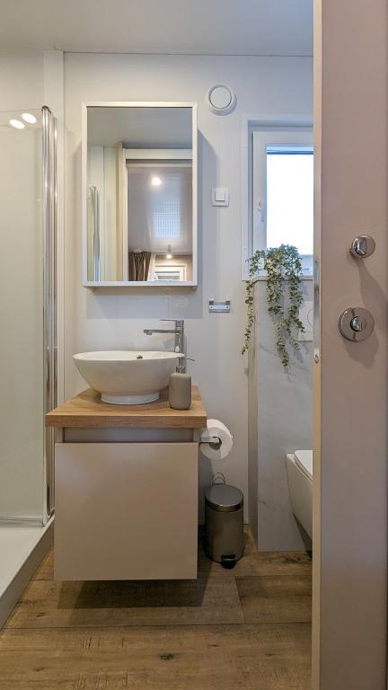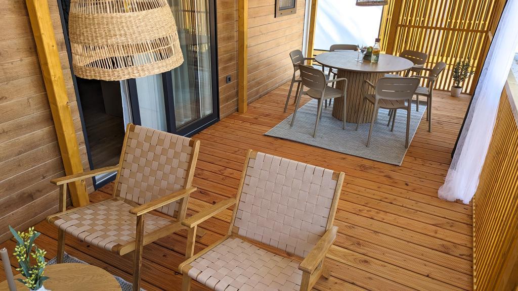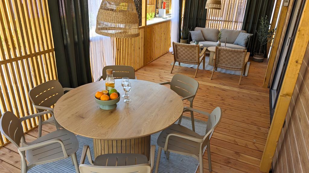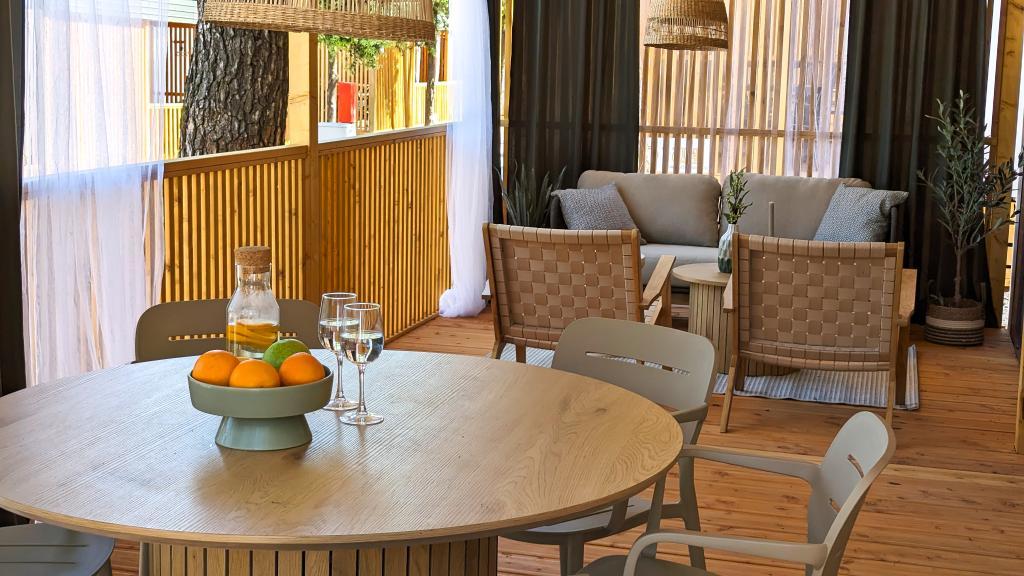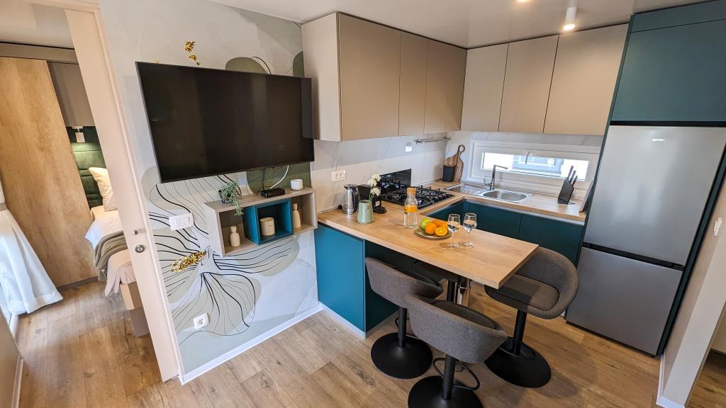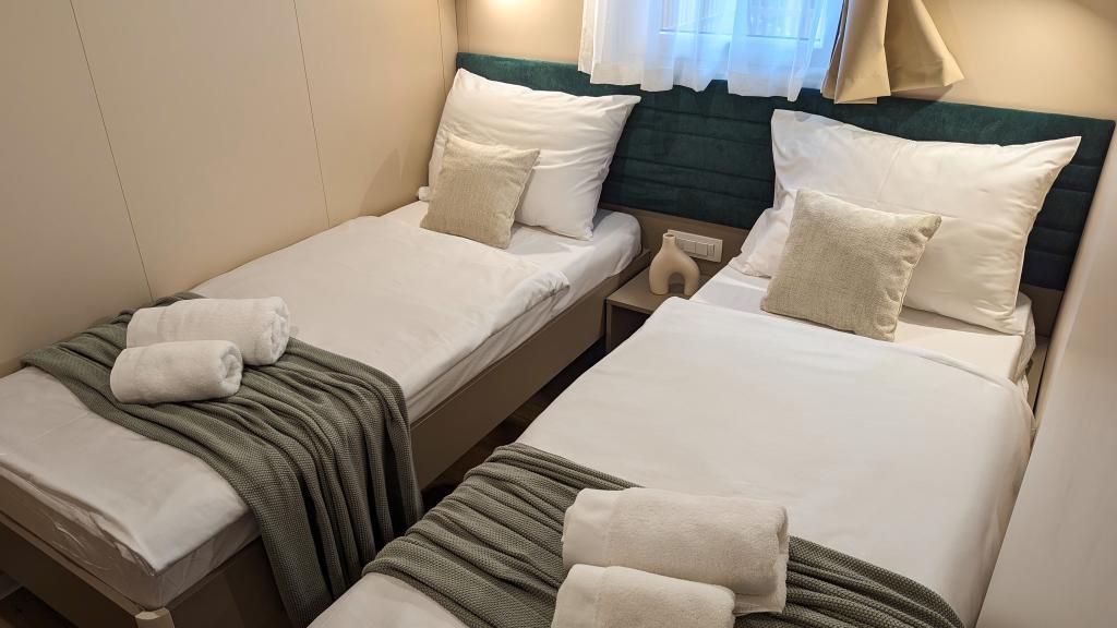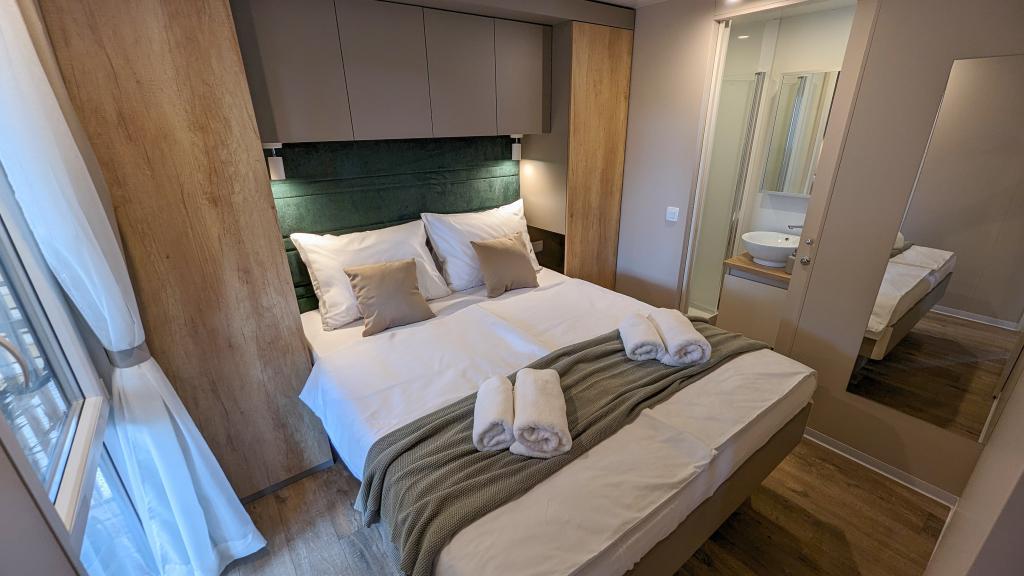 Disfrute de la naturaleza y la comodidad: las casas móviles Jaki en el Camping Soline, Biograd na Moru. Ubicadas en una zona tranquila del camping de 4 estrellas, rodeadas de pinares, nuestras modernas casas móviles son ideales para hasta 6 personas. Disfrute de la proximidad a la playa (2-5 minutos a pie), tiendas y restaurantes, y del paseo marítimo que lleva al centro (15 minutos). Estas casas ofrecen 2 dormitorios y 2 baños, salón, una amplia terraza con mesa de comedor y zona de estar, y una cocina totalmente equipada con lavavajillas, microondas, cafetera, tostadora, batidora y barbacoa exterior. La casa también incluye wifi gratis, aparcamiento gratuito junto a la casa, Smart TV, aire acondicionado, toallas y ropa de cama. El camping ofrece numerosas instalaciones para toda la familia: hermosas playas de arena y guijarros que se extienden hasta el centro, un restaurante con especialidades mediterráneas, un parque infantil, actividades deportivas y alquiler de bicicletas. Dalmaland, el parque acuático temático más grande de Croacia, está a 15 minutos en coche.