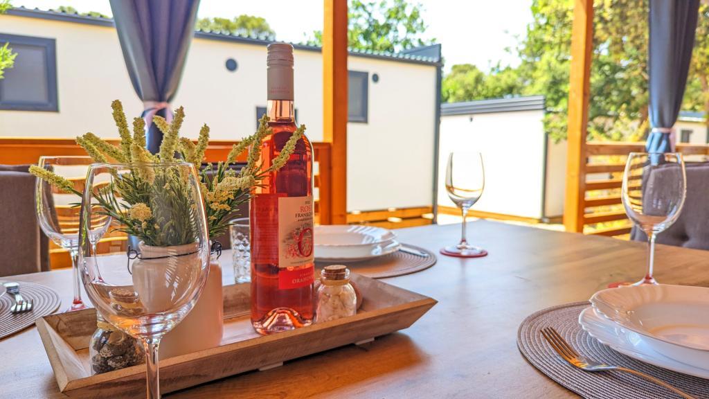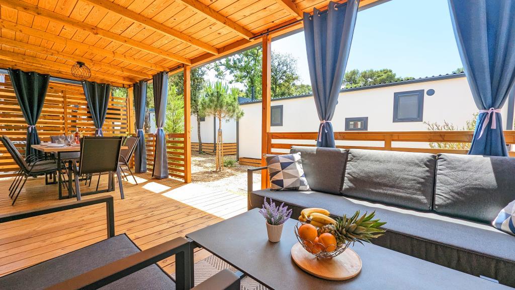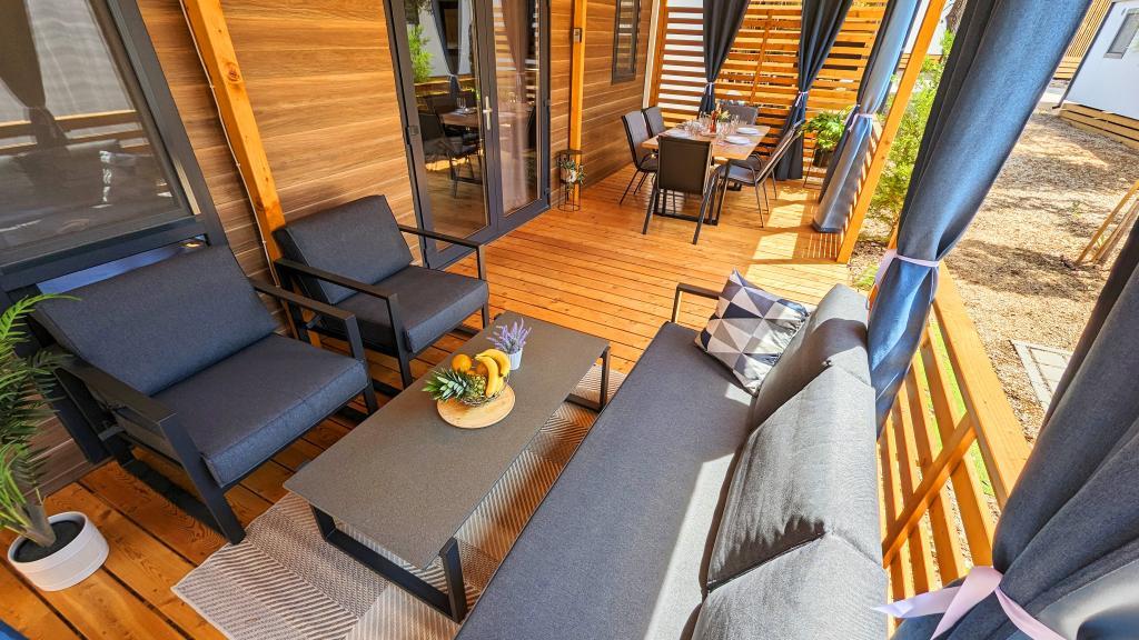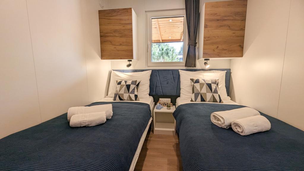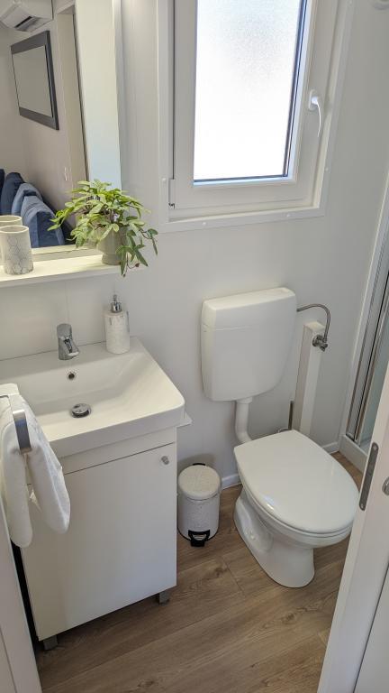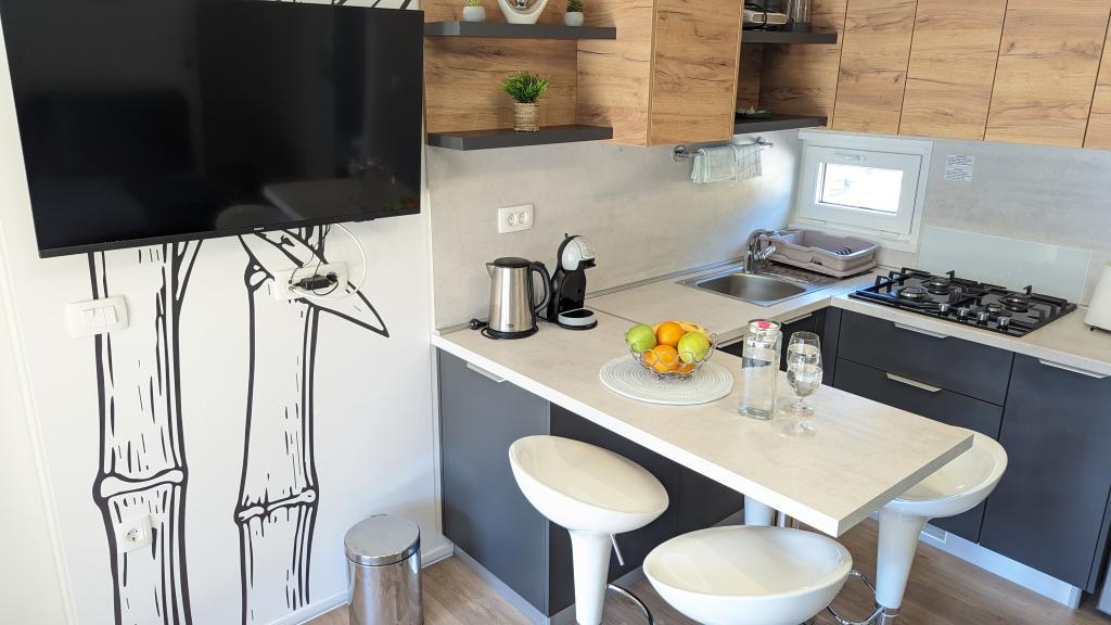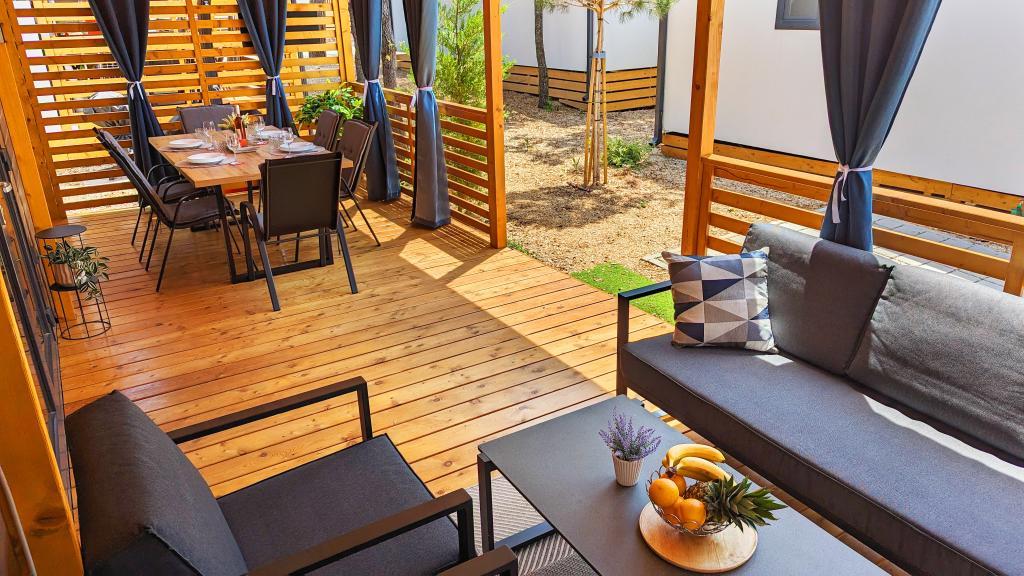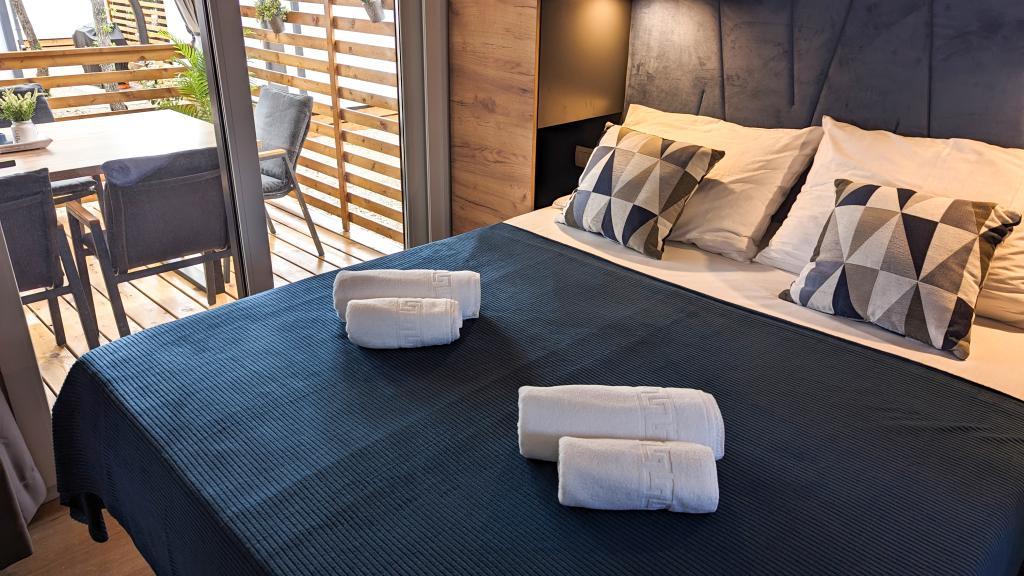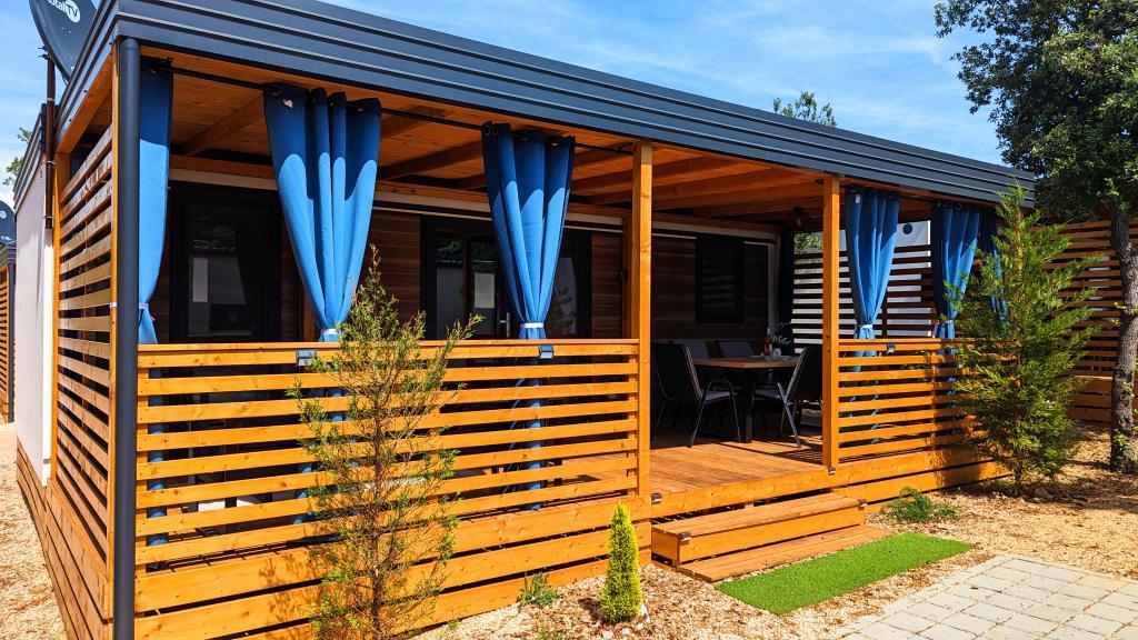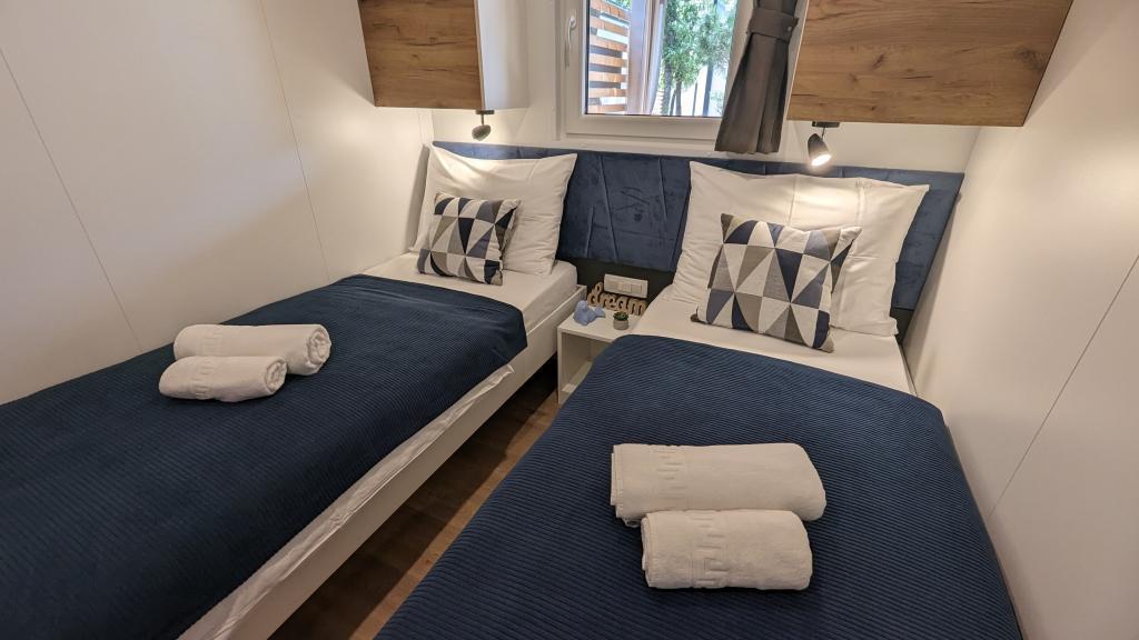 Disfrute de la naturaleza y la comodidad: las casas móviles Jaki en el Camping Soline, Biograd na Moru. Ubicadas en una zona tranquila del camping de 4 estrellas, rodeadas de pinares, nuestras modernas casas móviles son ideales para hasta 6 personas. Disfrute de la proximidad a la playa (2-5 minutos a pie), tiendas y restaurantes, y del paseo marítimo que lleva al centro (15 minutos). Estas casas ofrecen 2 dormitorios y 2 baños, salón, una amplia terraza con mesa de comedor y zona de estar, y una cocina totalmente equipada con lavavajillas, microondas, cafetera, tostadora, batidora y barbacoa exterior. La casa también incluye wifi gratis, aparcamiento gratuito junto a la casa, Smart TV, aire acondicionado, toallas y ropa de cama. El camping ofrece numerosas instalaciones para toda la familia: hermosas playas de arena y guijarros que se extienden hasta el centro, un restaurante con especialidades mediterráneas, un parque infantil, actividades deportivas y alquiler de bicicletas. Dalmaland, el parque acuático temático más grande de Croacia, está a 15 minutos en coche.
