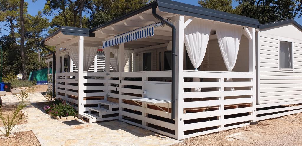 NUEVO !! Nueva casa móvil. Consta de 2 dormitorios (1 con cama de matrimonio y el otro con dos camas individuales), cada uno con su propio cuarto de baño y una sala de estar con una cocina donde hay una cama. La casa está prevista para el 4 de 2 personas. Superficie total solos casas es de 30 m2 y una terraza cubierta de 24 m2, donde hay una gran mesa de comedor con 6 sillas y tumbonas para una estancia agradable. La casa está bien equipada, con aire, TV, hervidor eléctrico, microondas, nevera y menaje de cocina completo. El campamento está situado en medio de un bosque de pinos. Ofrece servicios de cambio de divisas, lavado y secado de la máquina y diariamente organiza diversas actividades tanto para niños como para adultos. Dentro del campo hay varios restaurantes y cafeterías. Para aquellos que prefieren unas vacaciones activas pueden elegir entre ciclismo, buceo, voleibol de playa, tenis, tenis de mesa, esquí acuático, vela y excursiones a varios parques nacionales y paseos en barco.