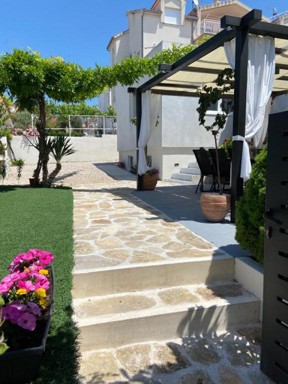 Moderno apartamento de 85m2 en la planta baja de la casa con 2 dormitorios, uno con cama de matrimonio de 180 cm y el otro con cama de matrimonio de 160 cm y sofá cama (para 1 adulto o dos niños). A petición del huésped, es posible añadir una cuna. El salón es amplio con un gran sofá cama para 2 personas más, un comedor, una moderna cocina con lavavajillas, heladera con congelador, horno, estufa, todos los electrodomésticos y vajilla necesarios y un comedor. También hay un baño grande con bañera y lavadora. Terraza delante de la casa con cenador cubierto y mesa con sillas, jacuzzi y tumbonas y barbacoa en el jardín. Aparcamiento gratuito para dos coches. Wi-Fi gratis. Salón climatizado y ambas habitaciones. La playa está a 150 metros calle abajo. Hay una tienda a 100 metros de la casa. También hay 3 chiringuitos/cafeterías en la playa, uno de los cuales tiene un parque infantil a la sombra. Complejo de playa Solaris aprox. A 1 km de la casa con playa, restaurantes, parque acuático e instalaciones para niños y adultos.