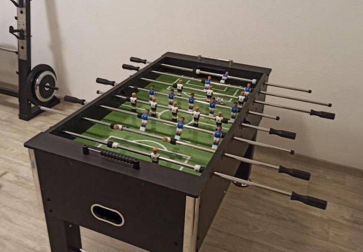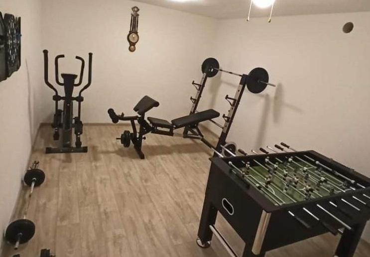 La sala de entretenimiento y fitness en el sótano, incluida en el precio, está equipada con máquinas de ejercicio, una máquina elíptica, futbolín, dardos y una bicicleta: ideal para la recreación y la diversión familiar.