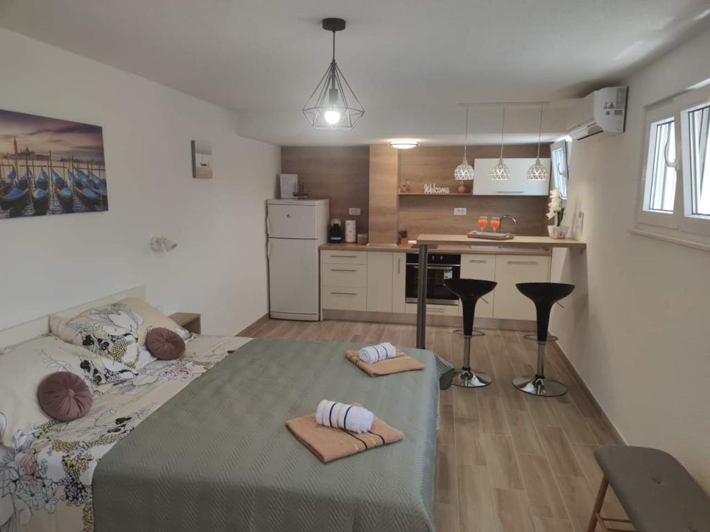 Los apartamentos están situados en una zona tranquila rodeada de vegetación. La playa está a 200 m o menos de 5 minutos a pie. La aplicación Studio es para 2 personas, aunque un niño más pequeño también puede utilizar una cuna de viaje. El apartamento 2+2 es ideal para una familia con niños de hasta 10 años. Todo está a tu alcance, por lo que no necesitas coche.