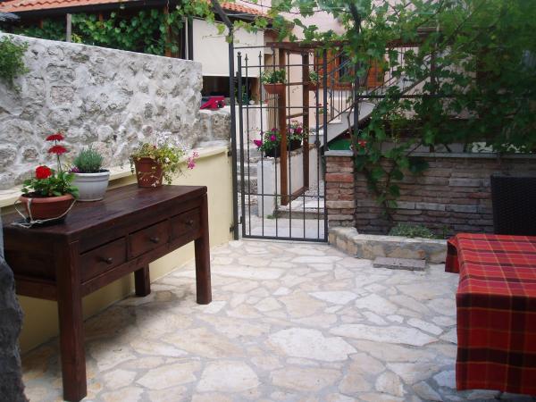 Centro de Krk, villa urbana. Apartamentos de 4 estrellas, amueblados en estilo rústico, con equipamiento moderno, cocina, aire acondicionado, aparato de TV. La villa está ubicada en el corazón del casco antiguo y en una calle tranquila, a solo 70 metros de la playa. Aparcamiento cercano en parking privado.