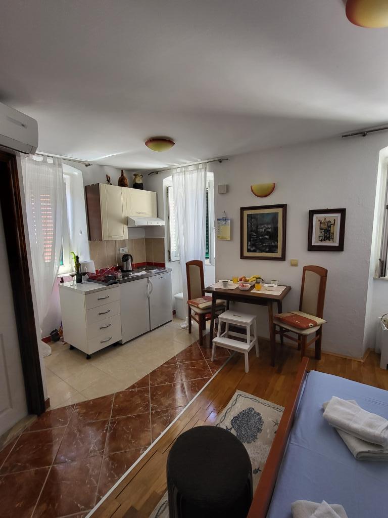 El estudio está ubicado en el mismo centro de la ciudad, en la plaza Kačić. En las inmediaciones se encuentra el paseo marítimo a 10 metros, ya la playa más cercana unos 150 metros. La tienda, el mercado y la panadería están ubicados en el lado norte de la plaza, a menos de 50 m El consultorio médico se encuentra a unos 10 metros de la entrada al edificio. Estudio ofrece 2 + 1 alojamiento. Además de la clásica cama doble, hay un sillón que se estira y se convierte en una cama individual. Mini cocina que cubre las necesidades de cocción y consumo de alimentos, y un baño con ducha, inodoro y lavabo.