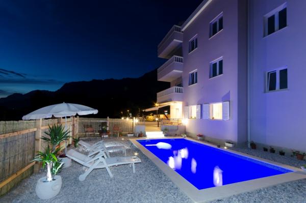 Apartamento en la parte oriental de la ciudad de Makarska, situada en casas de nueva construcción, los otros pisos están cerrados, la piscina es para el uso de los huéspedes de un apartamento individual, aparcamiento gratuito, todas las habitaciones disponen de aire acondicionado, el.roštilj. La instalación está ubicada 10 min. a pie del centro de la ciudad, a la misma distancia de la playa (la ciudad).