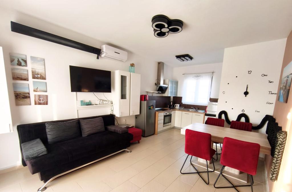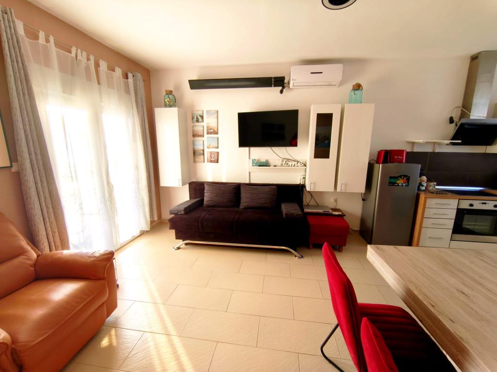 Apartamento completamente amueblado, ubicado en la planta baja. Consta de un dormitorio con cama doble, cocina con comedor, un aseo y un salón con dos sofás, uno de los cuales se puede convertir en cama supletoria. Se admiten mascotas por un suplemento y disponemos de un amarre/boya para que nuestros huéspedes puedan amarrar su embarcación más pequeña.