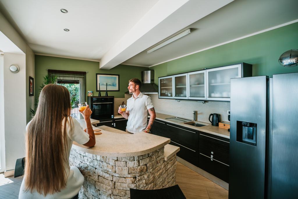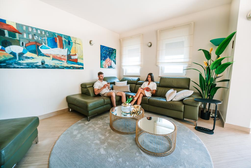 Pasamos 15 días maravillosos en esta hermosa casa. El apartamento es un milagro, 150 m2 con una gran sala de estar y cocina, tres dormitorios, cada uno con su propio baño, que es refrescante y todo por sólo 6 personas. Amplia terraza desde la que se Kvarnerbucht pie en la palma de la mano es una historia diferente. En ella no hay problema, usted puede sentarse y disfrutar del día. En el apartamento, no es el que está fenomenalmente bien equipado. Esto es algo que no hemos visto, y realmente una gran cantidad de viajes. Debe ser vuelto. Una familia de agradecimiento grande Perinic!
