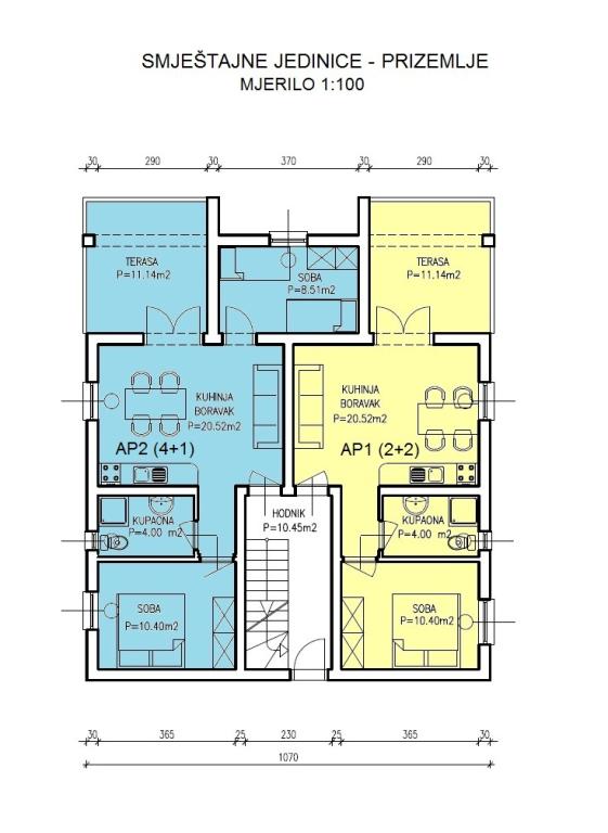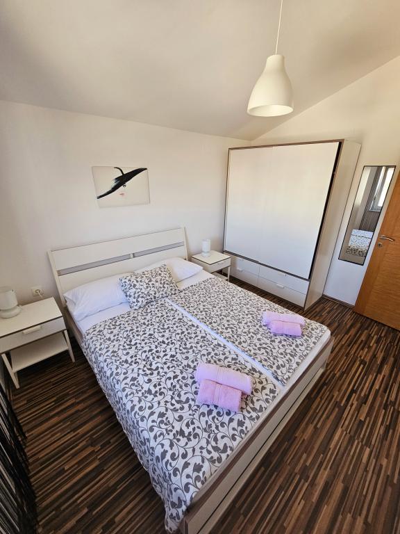 Los apartamentos de nueva construcción y amueblados de forma moderna se encuentran en Mandre, en la segunda línea del mar. Los apartamentos están equipados con aires acondicionados y televisores LCD LED con recepción terrestre y satelital. Las cocinas están equipadas con horno, microondas, lavavajillas, cocina a gas con campana y nevera con congelador. Todos los apartamentos cuentan con amplias terrazas con vista al mar, que están visualmente separadas de las terrazas de otros apartamentos, para que tengas el máximo confort. En cada piso hay un apartamento 2+2 y un apartamento 4+1. Los apartamentos 2+2 están uno encima del otro y tienen el mismo plano de planta, y lo mismo se aplica a los apartamentos 4+1. El estacionamiento y la entrada a la casa están en la parte trasera de la casa. En la planta baja, junto a la carretera, hay un apartamento para 4 personas, con dos dormitorios, terraza exterior y parking privado.