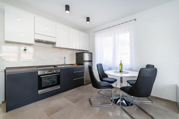 Excelentes apartamentos en una hermosa ubicación con vista al mar ya la ciudad. Totalmente equipada con todo el contenido necesario, parking para coches, wi-fi, todo lo necesario para unas agradables vacaciones. 7 minutos a la playa, 10 minutos al centro de la ciudad y restaurantes. La tienda más cercana está a 5 minutos a pie, todo está disponible en 10 minutos a pie. Los apartamentos 1 a 6 están ubicados en un edificio y son completamente idénticos. Tres apartamentos están en la planta baja (1 a 3) con amplias terrazas. Tres apartamentos están en el primer piso. Todas tienen vista al mar. Los apartamentos 7 y 8 están ubicados en el primer piso del segundo edificio, que se encuentra justo al lado del primer edificio. Todos los apartamentos están amueblados de forma moderna y los huéspedes tienen todo lo que necesitan a su disposición, incluyendo microondas, nevera, wi-fi, hervidor de agua, utensilios de cocina, toallas... Hay una barbacoa con mesa y sillas para socializar.