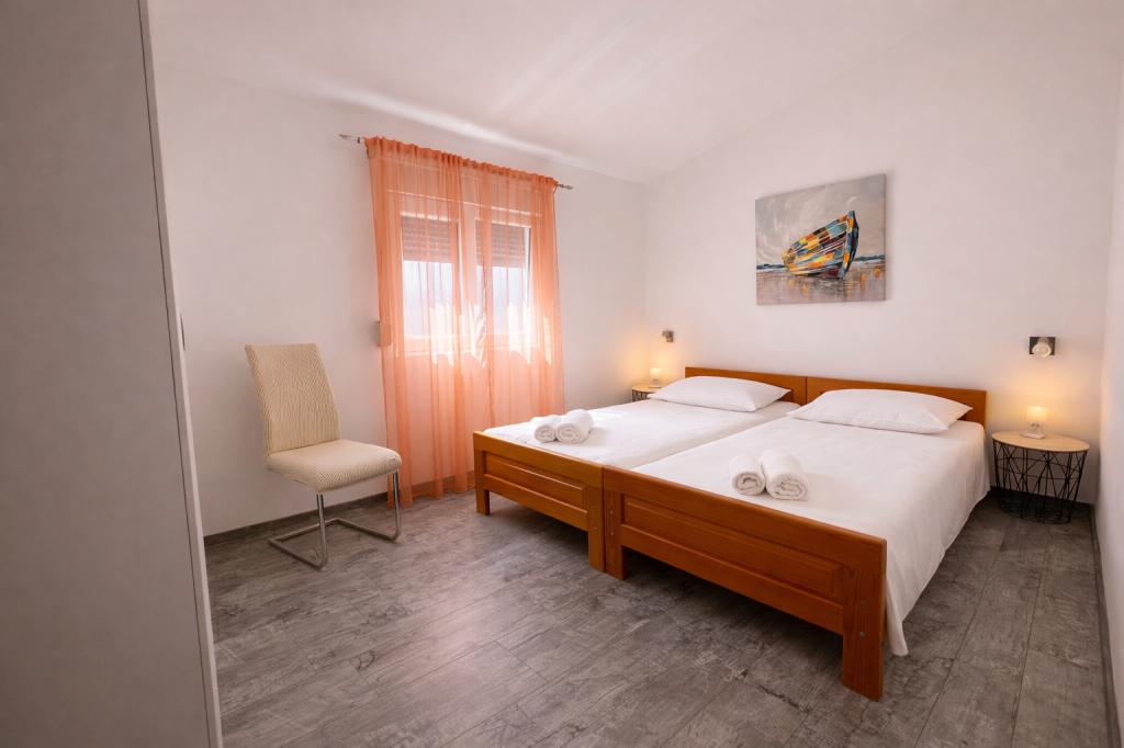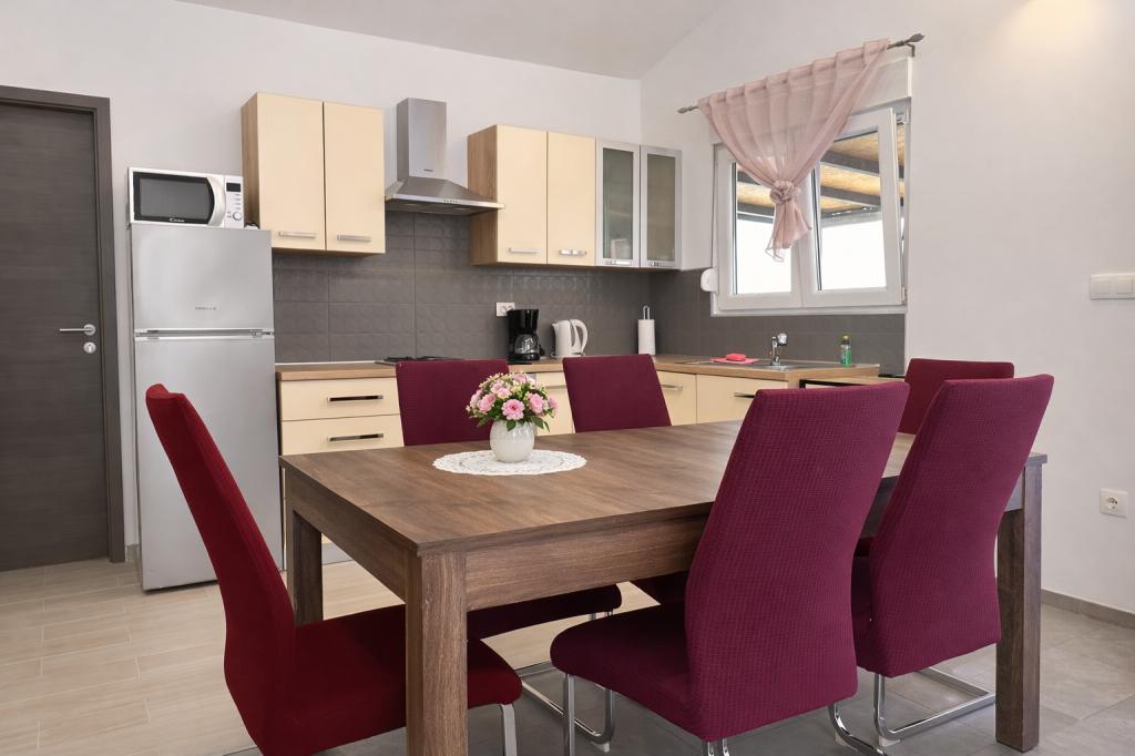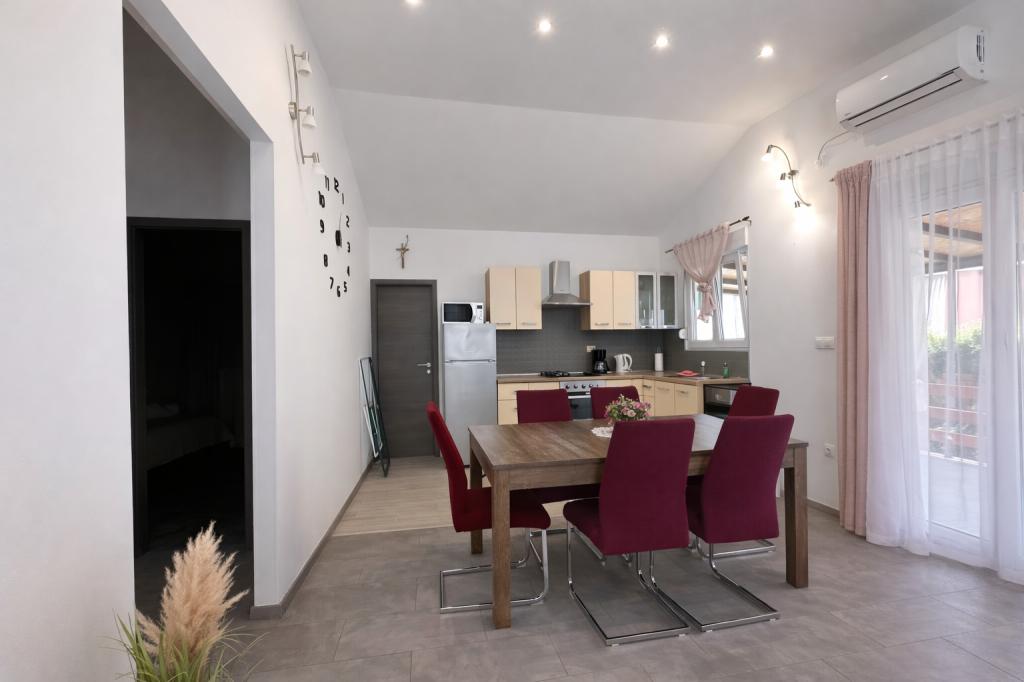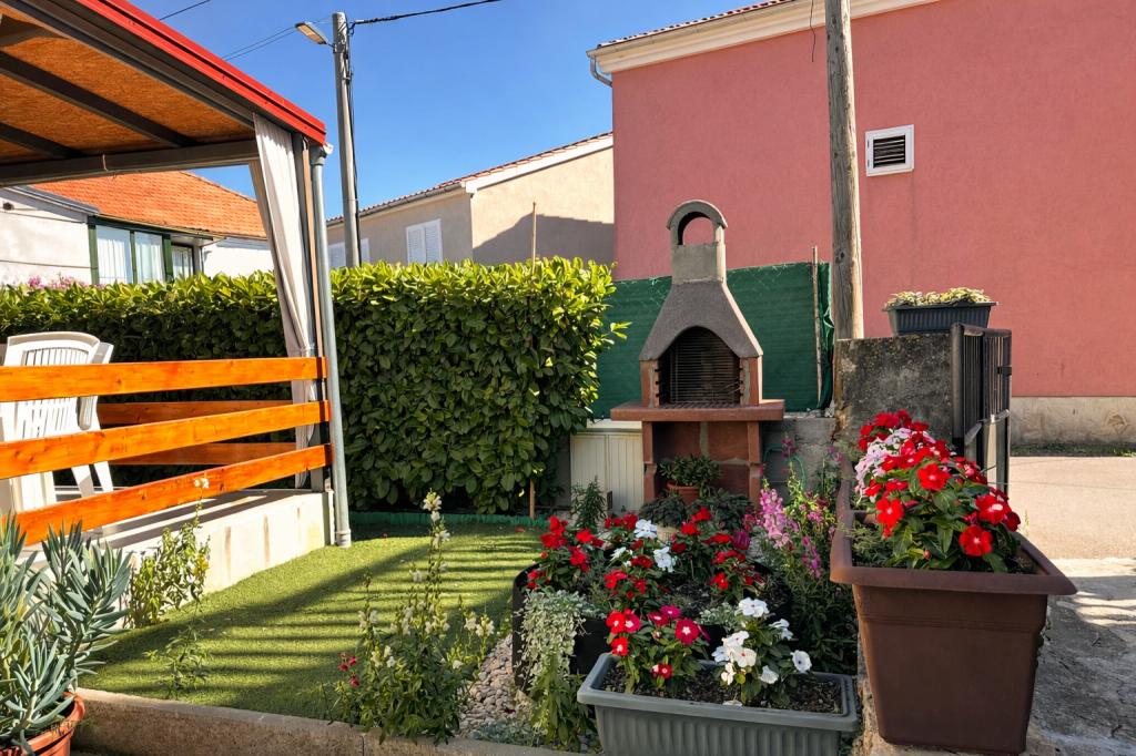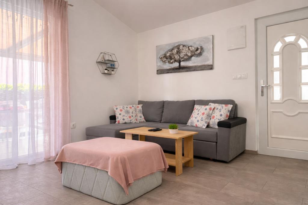 El alojamiento tiene capacidad para 5 personas y cuenta con dos dormitorios con camas dobles (160x200) y una cama supletoria para un niño de hasta 12 años en el salón. Los huéspedes tienen acceso a ropa de cama y toallas, un baño con ducha y lavadora, un acogedor salón con TV y una cocina totalmente equipada (nevera, cocina, horno, lavavajillas, hervidor y vajilla). La terraza cubierta es ideal para tomar un café por la mañana o relajarse, y los huéspedes tienen acceso a una plaza de aparcamiento privada. El patio está vallado. El alojamiento se encuentra a 800-900 m de la playa más cercana, mientras que la tienda y la panadería están a solo 100 m. Se puede acceder fácilmente al alojamiento desde la salida de la autopista cerca de Pakoštane, a unos 15 minutos en coche. ¡Bienvenidos! :) ¡Utilicen el formulario de contacto para cualquier pregunta! ¡GRACIAS! :) ¡La lista de precios para la temporada 2026 ha sido actualizada!