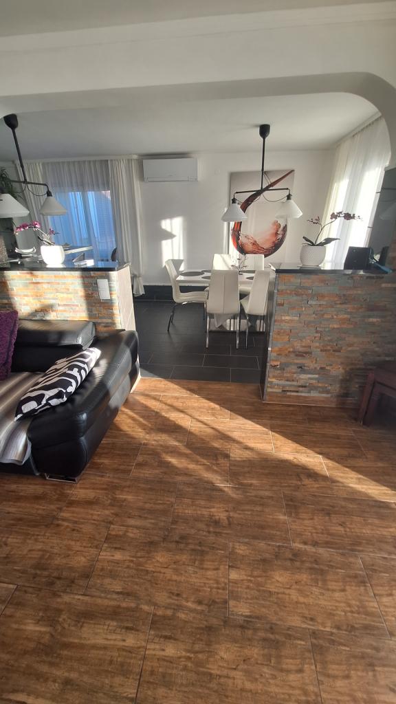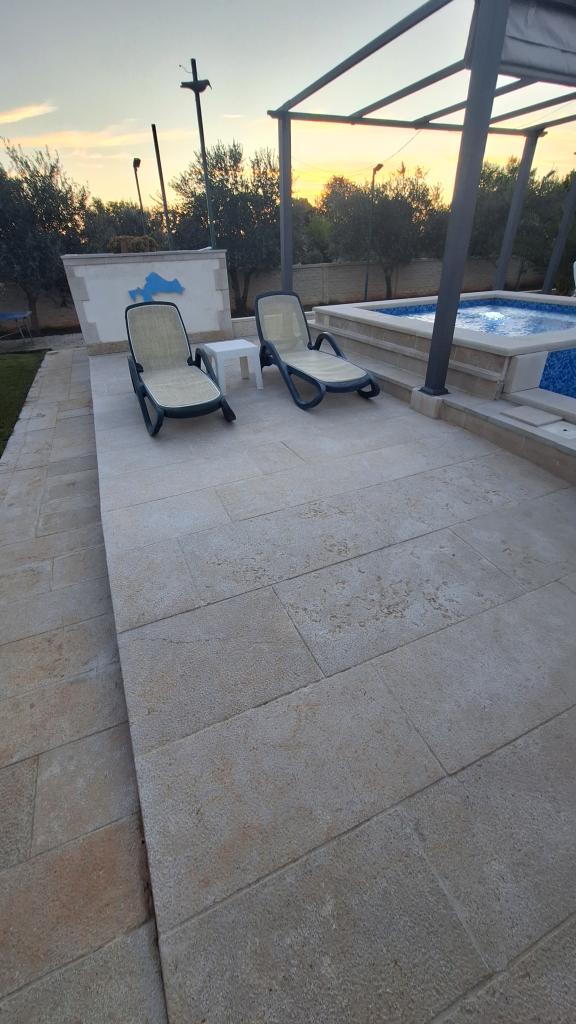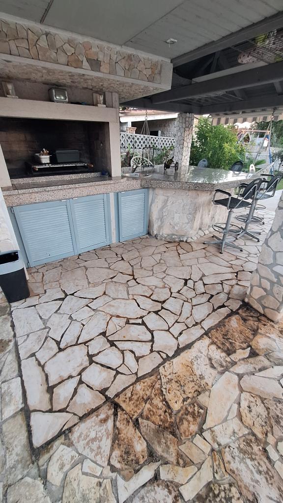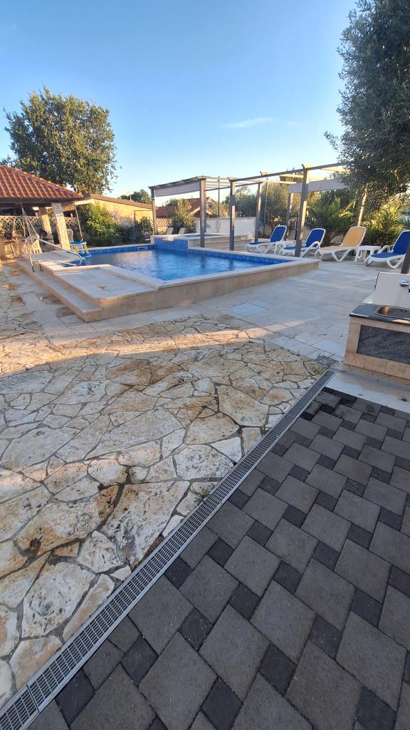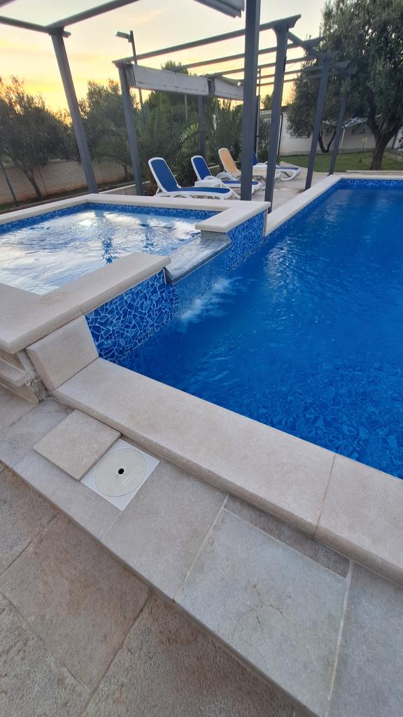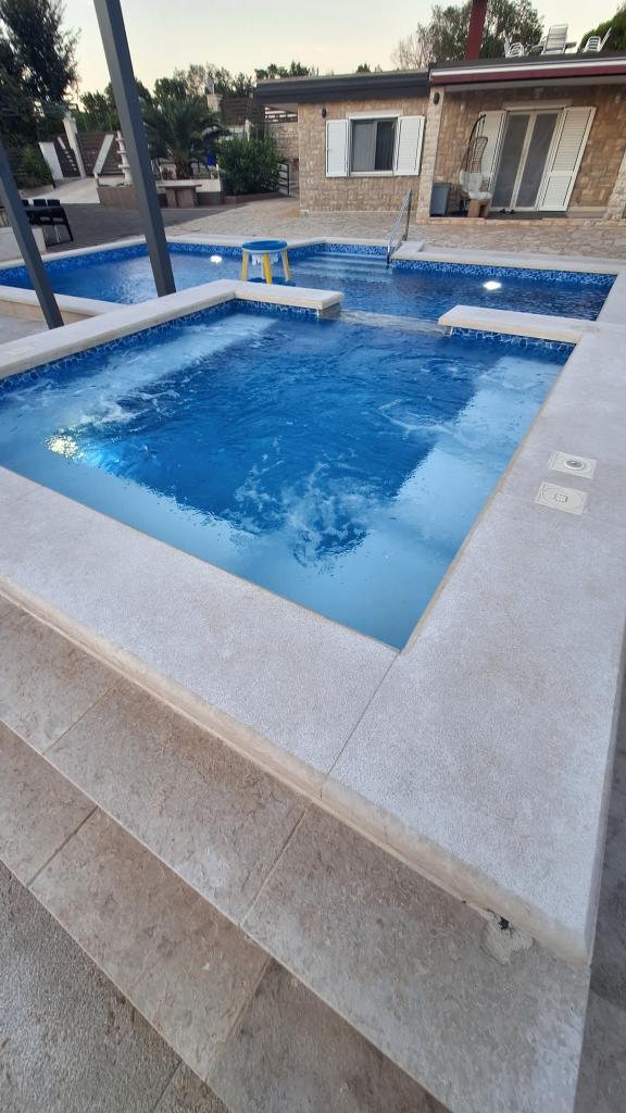 Casa vacacional con piscina climatizada y piscina de masajes con cascada artificial. La piscina mide 8x4 m y la piscina de masajes mide 3x3 m. Se encuentra a 200 metros de la playa. Cerca hay un restaurante, un puerto deportivo para amarrar embarcaciones y una playa para mascotas. Cuenta con parrilla y estacionamiento para 3 autos.