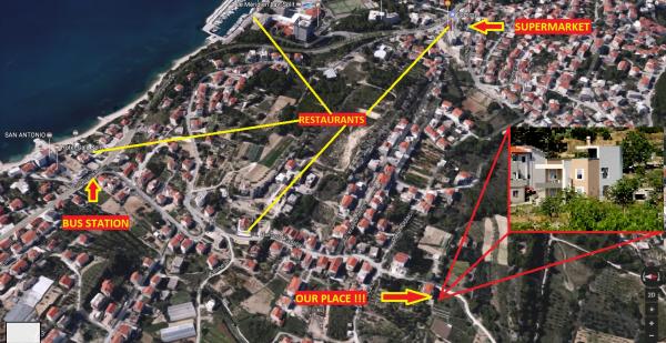 Los apartamentos están situados en la planta baja con el uso del jardín. plaza de aparcamiento para coches. Están situados a 400 metros de los famosos hoteles y las playas de Le Meridien Lav - Split. Desde el centro de Split, que está a sólo 8 kilómetros. El aeropuerto está a 25 km.