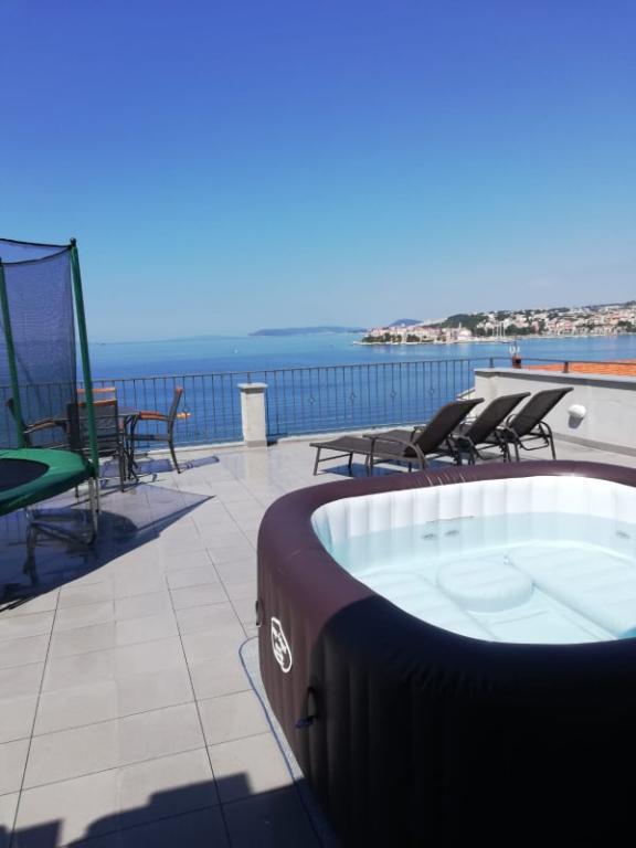 Lujoso apartamento grande y limpio con una hermosa vista al mar. El apartamento está totalmente equipado. Hay aire acondicionado en todas las habitaciones. Tiene dos terrazas. Uno es interno y el otro es externo. Cada apartamento cuenta con parrilla y jacuzzi, ducha exterior, hamacas. Todos los apartamentos tienen vistas al mar. La terraza de la azotea tiene la vista más hermosa. La playa está cerca de 2 min. a pie. Hay varios restaurantes cerca de la playa. En las inmediaciones hay tiendas de alimentación, una farmacia, una panadería... Los anfitriones Ivan y Mário son amables, atentos y muy hospitalarios. Pueden resistir incluso los azules del cielo. Todavía estamos en contacto. Hemos estado aquí 5 veces. Estuvimos aquí por primera vez en 2018 y estamos felices de volver. Nos sentimos como en casa aquí.