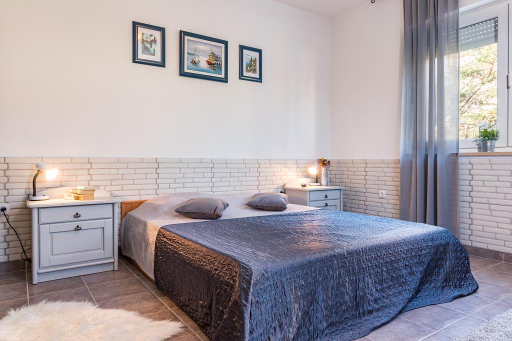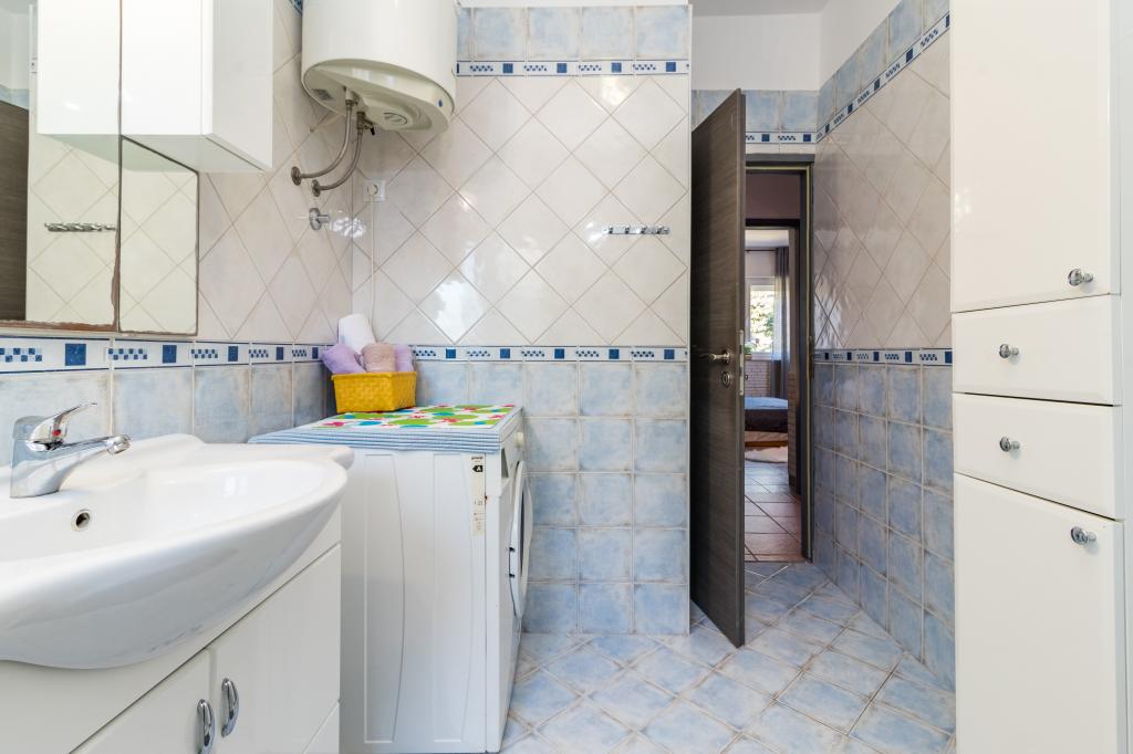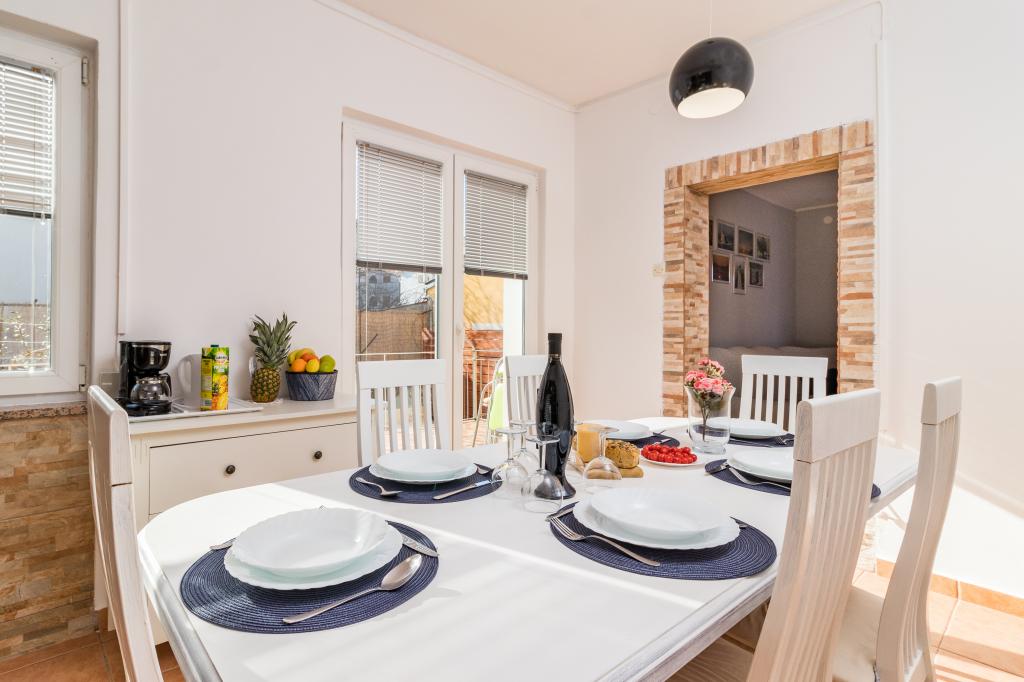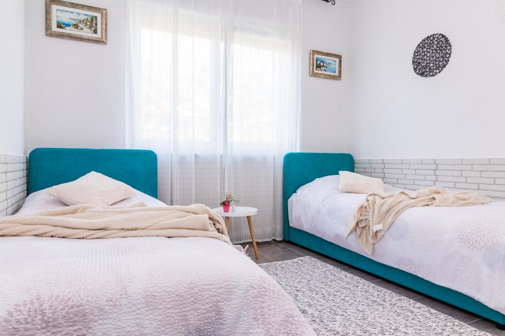 casa de vacaciones en Pomer, un pequeño pueblo cerca de Medulin. La casa está rodeada de vegetación, jardín es grande 600m, tiene dos plazas de aparcamiento, barbacoa, terraza, muebles de jardín. Se encuentra a 300 m del mar ya 500 metros de la playa. La casa es una gran 143 m2, dispone de 3 dormitorios, sala, cocina, comedor y dos baños. En Pomer tenemos una pista de tenis, un parque infantil para el fútbol, balonmano, baloncesto, parque para niños, centro de surf, centro de buceo, parque de fitness. El lugar está situado junto al mar, rodeado de pinos. En la temporada baja ofrecemos la posibilidad de alquilar sólo una parte de la casa como un apartamento tipo estudio para dos personas, y ajustamos el precio.
