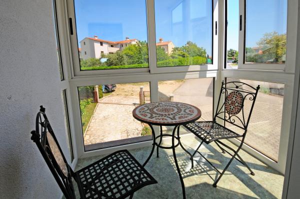 El apartamento está situado en el primer piso de un edificio rodeado de vegetación en una zona tranquila de élite de Porec, por encima del hotel centro deportivo Diamant. El apartamento completamente equipado consta de un amplio salón, dormitorio grande y más pequeño, terraza, balcón cerrado, cocina, cuarto de baño con ducha y WC, y un pasillo. Desde la sala de estar, terraza y dormitorio más pequeño tiene una hermosa vista del mar. El resto de los apartamentos frente su propio bonito jardín con árboles frutales y flores en el jardín es su propia valla protegida plaza de aparcamiento móvil para un coche. Se tarda sólo diez minutos a pie a través de la sombra de los pinos para llegar a las playas de bandera azul. También hay un centro de deportes acuáticos (paracaídas, plátano, tubos, etc.). A una distancia de sólo 2 km de los apartamentos inaugurado recientemente un gran parque acuático Aquacolors Porec.