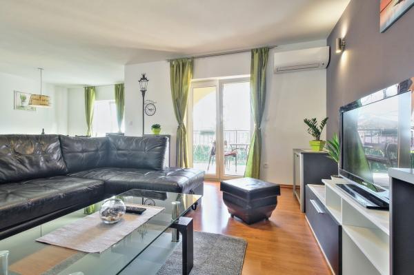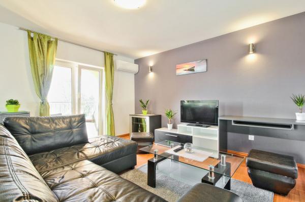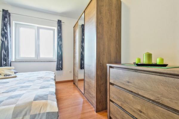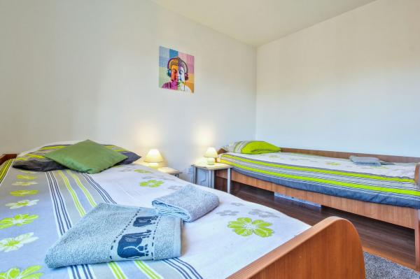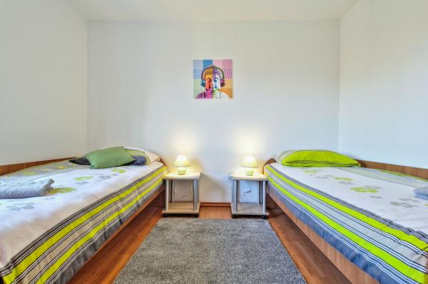 Ubicado en el primer piso del edificio, con dos habitaciones (una con cama de matrimonio y otra con dos camas individuales, cada una para una persona), sala de estar (sofá cama grande para una persona) junto con sala de estar, baño con inodoro, y terraza. La cocina está equipada con todos los electrodomésticos necesarios: lavavajillas, microondas, cafetera, estufa, horno y nevera. Una lavadora y un secador de pelo están disponibles en el baño.