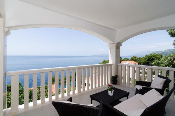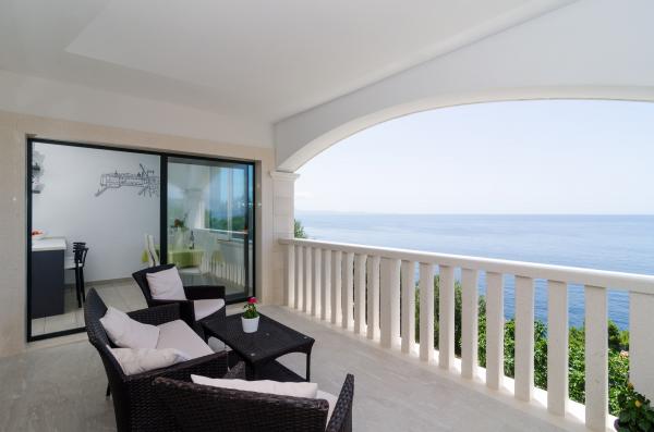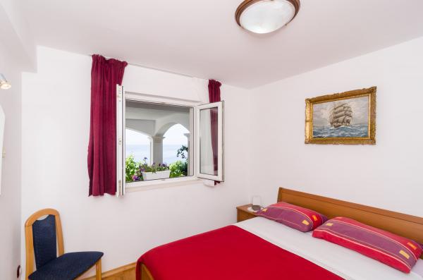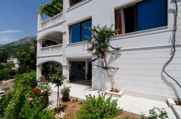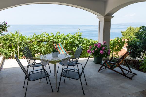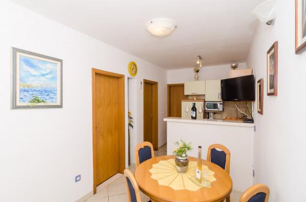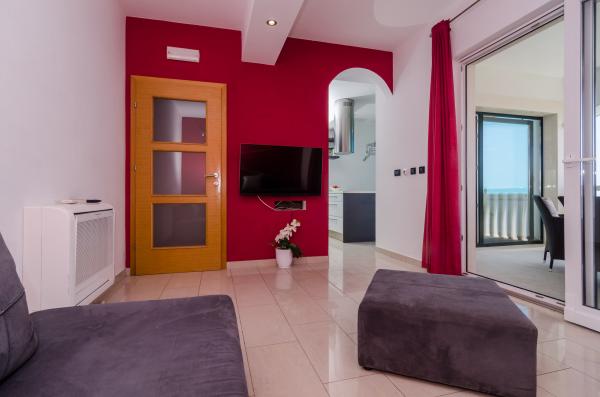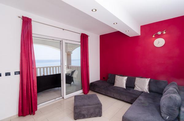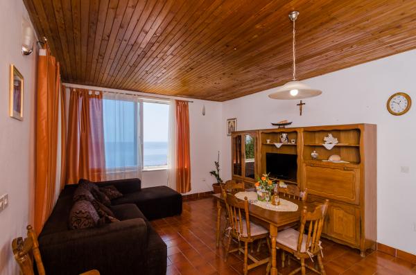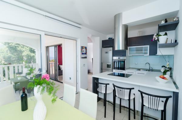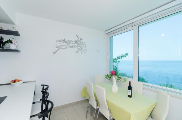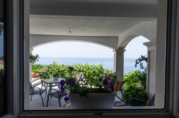 Los apartamentos están situados en una pequeña ciudad tranquila y lejos del centro de 200 metros. Tienen una hermosa vista al mar desde su terraza. El aparcamiento está en frente de la casa.