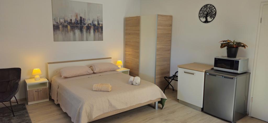 Un lugar muy chulo. Piso en la carretera pero muy tranquilo. Balcón con vistas al mar y Rovinj. Estacionamiento gratis. Playa muy cerca. Definitivamente volveremos allí de nuevo. Saludo a los dueños.