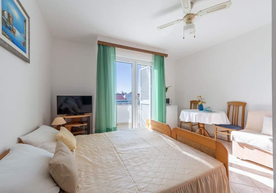 Casa modernamente equipada con 9 unidades de alojamiento: 6 apartamentos con un dormitorio y una sala de estar con dos camas plegables adicionales, una de dos plazas y una de tres plazas, así como una cocina equipada, un baño con ducha y un Amplio balcón con mesa y sillas. Hay un gran armario en el pasillo. 3 estudios están diseñados para dos personas, también están completamente equipados: baño con ducha, amplio armario, cocina y un pequeño balcón con mesa y sillas. Todos los apartamentos tienen aire acondicionado.La casa se encuentra a 3 minutos a pie del mar oa 5 minutos a pie de la gran playa de arena (Kraljičina plaža).
