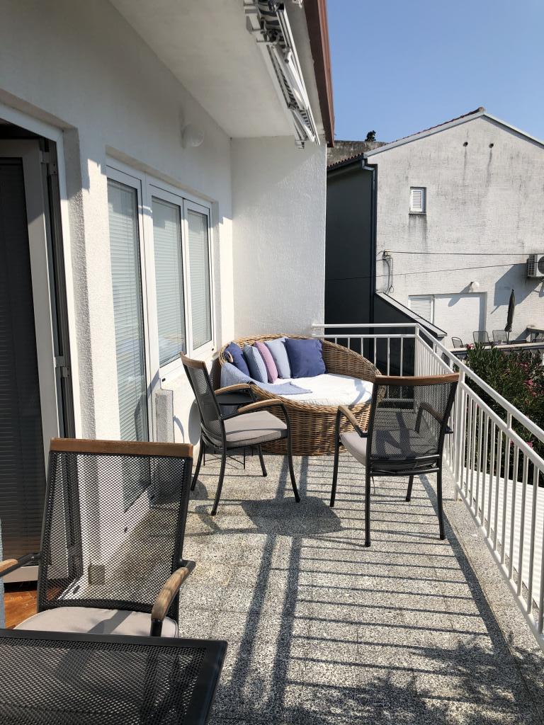 Apartamento de decoración moderna ubicado en el primer piso de una casa unifamiliar, piso independiente con entrada independiente y plaza de aparcamiento. A 5 minutos andando del centro ya diez de la playa. Consta de hall de entrada, baño con tina, cocina completamente equipada equipada con estufa, heladera, microondas, vajilla completa y utensilios. Dormitorios con cama de matrimonio y armario empotrado, dormitorios más pequeños con sofá cama y armario empotrado y salón con TV y sofá rinconera. Delante del dormitorio y del salón hay una cómoda terraza con vistas al mar, cubierta con toldo y equipada con zona de comedor y tumbona. El espacio está climatizado y dispone de wifi.
