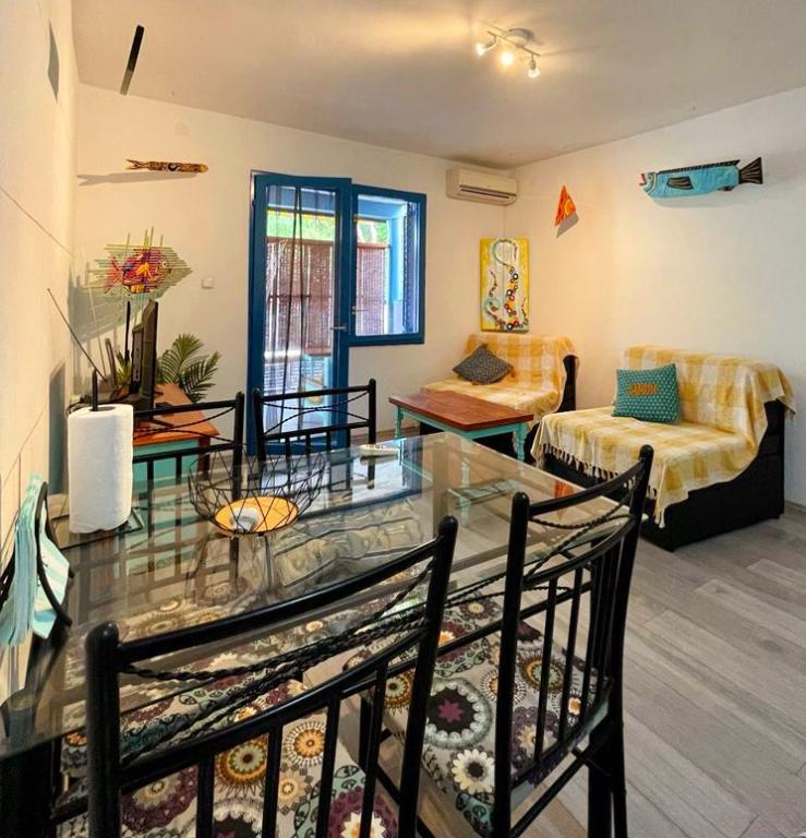 Además del hecho de que se encuentra en un rincón escondido y tranquilo de un pequeño y hermoso pueblo de pescadores, cuando cruce el umbral, será recibido por una decoración inusual y una sensación de alegría que hará que su estadía sea realmente inolvidable. Navega hacia las vacaciones con coloridos peces juguetones que navegan de una habitación a otra, y cada mueble tiene su propia historia. Desde la ventana del dormitorio se pueden ver y oler los árboles de laurel. Desde el salón, donde hay cómodas camas supletorias, puedes salir a la terraza donde tendrás total intimidad. Mientras el aire acondicionado lo refresca, emprenda una aventura culinaria en la cocina totalmente equipada. Puede socializar y cenar en la terraza al aire libre a la sombra espesa. Por supuesto, tu mascota de hojalata tiene un lugar garantizado, justo al lado de nuestro apartamento recién amueblado.