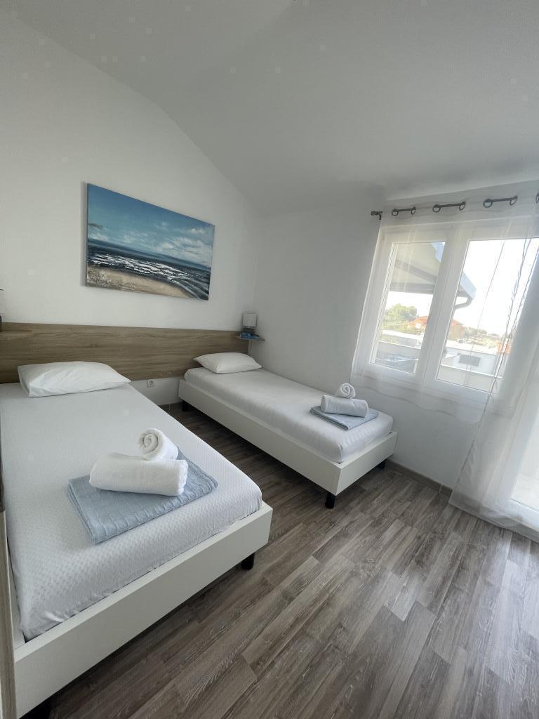 Apartamentos completamente equipados y modernos en una zona tranquila, ubicada a solo 300 m de la playa con muchas instalaciones. Los apartamentos están ubicados en el segundo piso de la casa de la familia, en el patio cercado puede disfrutar de un área cubierta para socializar con una cocina de verano y parrilla. El estacionamiento privado se encuentra frente al patio. Hay una parada de autobús a 50 m de la casa y la primera tienda a 200 m de la casa. El centro del pueblo está a 800m, se puede llegar por carretera o por el paseo marítimo que se extiende junto al mar. Amamos a los animales, pero no aceptamos mascotas.