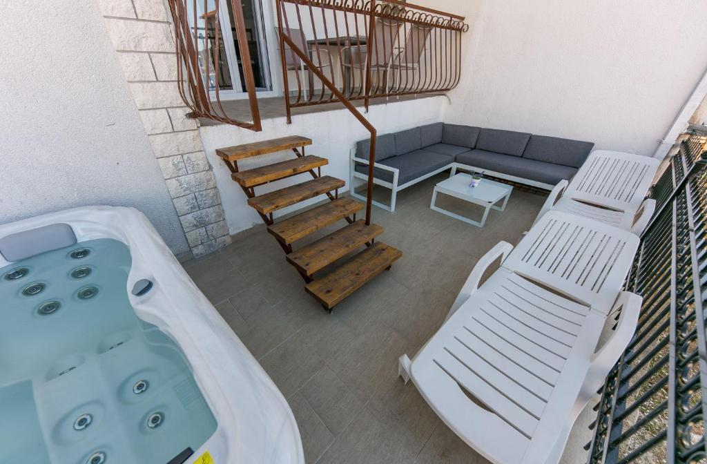 El Apartments Mate se encuentra en Vinišće, 15 km al oeste de Trogir. La casa se encuentra a 10 metros del mar y de la playa, y cuenta con un amplio estacionamiento para 8 autos. La casa cuenta con 5 departamentos: Departamento (6 2) Planta baja con jacuzzi: 3 dormitorios, cocina con sala, baño y lobby con jacuzzi. Apartamento (7) Primera planta con jacuzzi: 3 dormitorios, cocina con salón, 2 baños y amplia terraza con jacuzzi. Apartamento (5 1) Ático: 2 dormitorios, cocina con salón, baño y amplio balcón. Yacuzzi compartido. Apartamento (4) Primera planta con jacuzzi con: 2 habitaciones, cocina, baño y amplia terraza con jacuzzi. Apartamento (4) Segunda planta: 2 dormitorios, cocina, baño y balcón. Jacuzzi compartido Una parrilla al aire libre está disponible para todos los huéspedes. Los huéspedes pueden utilizar bicicletas, un kayak y una tabla de surf. La casa está: - A 10 metros del mar y la playa - A 100 metros del restaurante - A 150 metros de la tienda