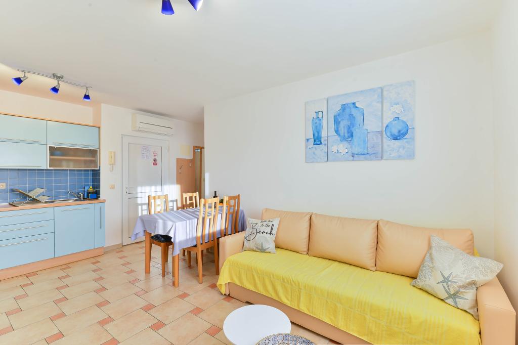 Apartamentos totalmente equipados, cada habitación con su propio aire acondicionado y TV, ubicados a 40 metros del mar. A poca distancia a pie hay un bar, restaurantes y un supermercado. La playa es de grava y hormigón, hay una playa de arena a diez minutos a pie. La casa tiene estacionamiento propio, parrilla y columpio infantil en el jardín. Hay sillas de playa, sombrillas y bicicletas a disposición de los huéspedes.