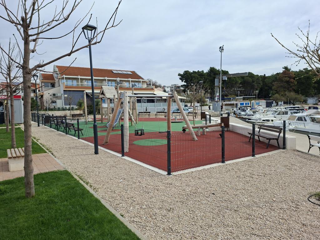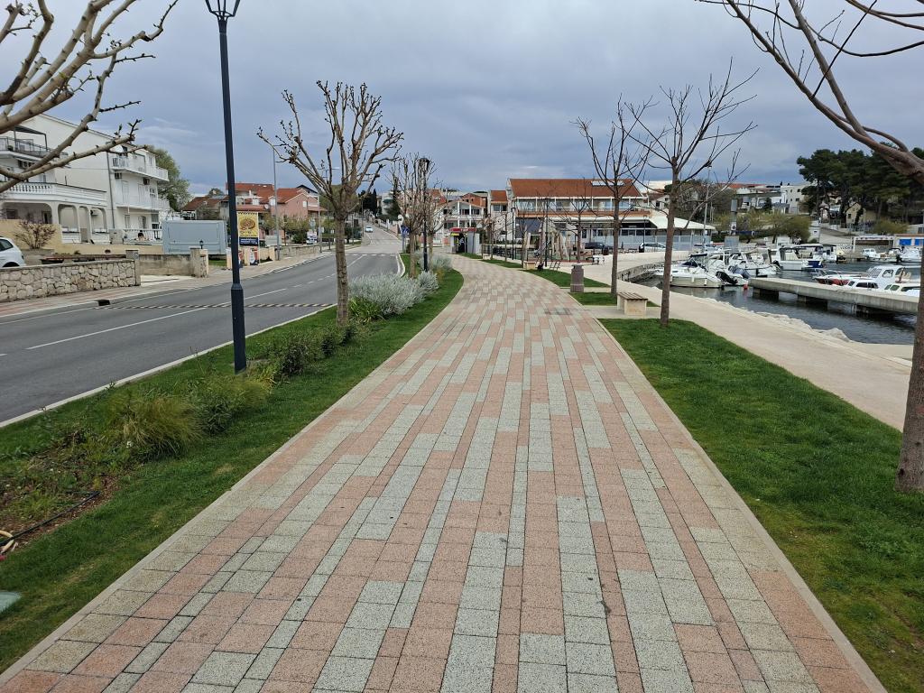 Cerca del alojamiento hay una playa con varias instalaciones de entretenimiento. La distancia hasta el comienzo de la playa es de unos 3 minutos a pie. En las inmediaciones hay tiendas, gasolinera, restaurantes, puerto deportivo ACI, clínica, estación de autobuses, mercado, oficina de correos y bancos. Los apartamentos están ubicados en el primer piso de un edificio residencial con vista parcial al mar. Se proporciona aparcamiento para vehículos en el patio del establecimiento de alojamiento.