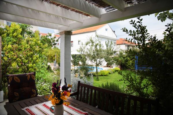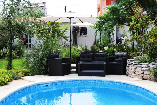 mobiliario rústico pequeña villa en una zona tranquila de la ciudad, cerca del casco antiguo, y excluye el uso de un coche para los que tiene una plaza de aparcamiento. La villa está situada en un amplio y frondoso jardín con una piscina y un parque infantil. Todas las instalaciones necesarias se encuentran en 10 minutos a pie del hotel.