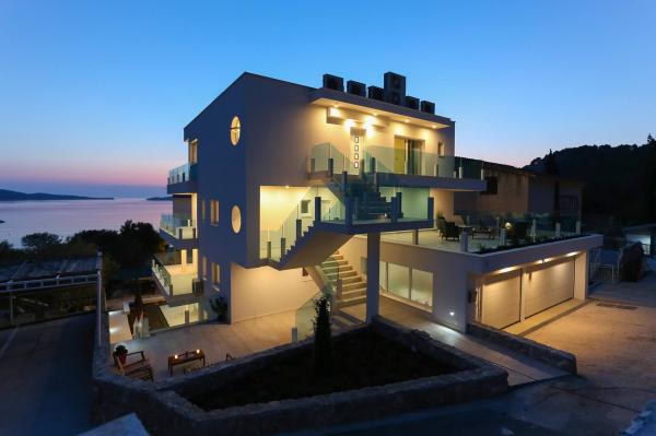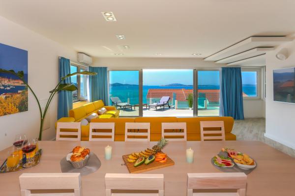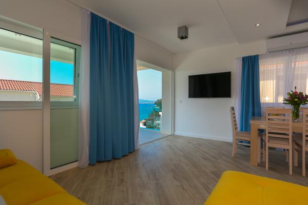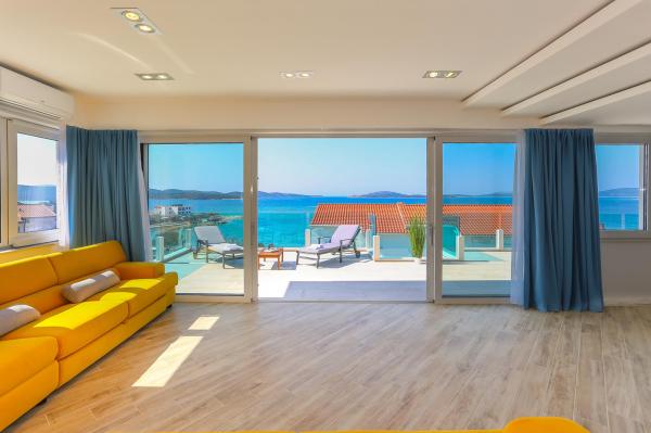 Villa Aqua contiene cinco apartamentos que están completamente equipadas y modernas. El primer y segundo piso consta de 4 apartamentos con cocina, dos dormitorios, baño y grandes terrazas con vistas al mar. En el tercer piso es nuestra pent house de lujo con dos dormitorios, dos baños, cocina, sala de estar y una terraza de 60 metros cuadrados. Las habitaciones y salas de estar en cada piso dispone de aire acondicionado, una lavadora y un horno de baño cocina, lavavajillas, vitrocerámica modernizado y utensilios de cocina completos. Cada salón contiene un androide de la TV inteligente. Villa Aqua está situado a 20 metros a pie de la playa ya 50 metros de la cafetería de África, a 300 metros de la cafetería