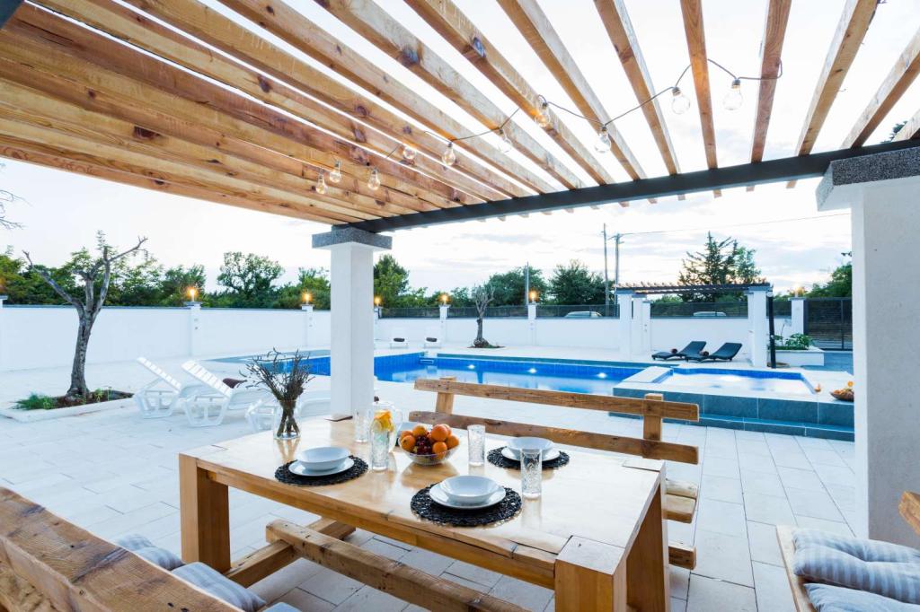 Villa Olana se encuentra en una zona tranquila de Zadar. y ofrece Wi-Fi gratis, alojamiento con aire acondicionado, un salón común y un jardín con una piscina al aire libre. La propiedad también incluye aparcamiento privado gratuito y una cocina compartida y parrilla. La villa tiene 5 dormitorios (10 personas), 4 baños, ropa de cama , toallas, TV de pantalla plana, comedor, cocina totalmente equipada y patio con vistas a la piscina. Los huéspedes de la villa pueden relajarse en la terraza. La Villa Olana se encuentra a 3,8 km del palacio de Providur ya 4,3 km del Museo Nacional de Zadar. El aeropuerto más cercano, el aeropuerto de Zadar, se encuentra a 10 km del establecimiento.