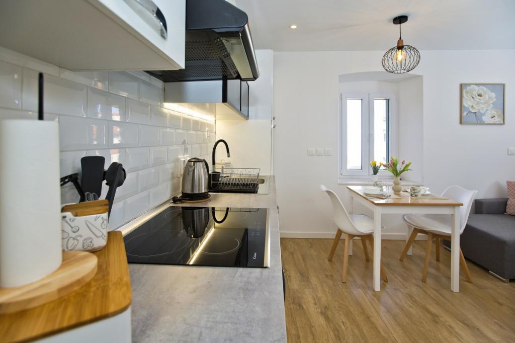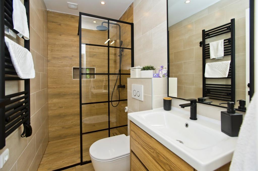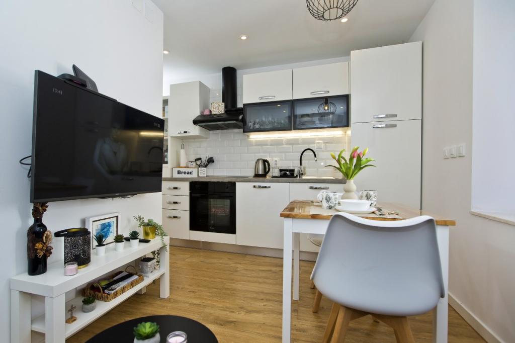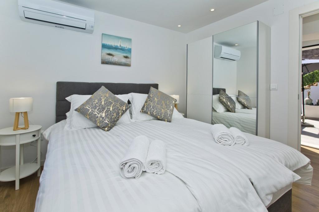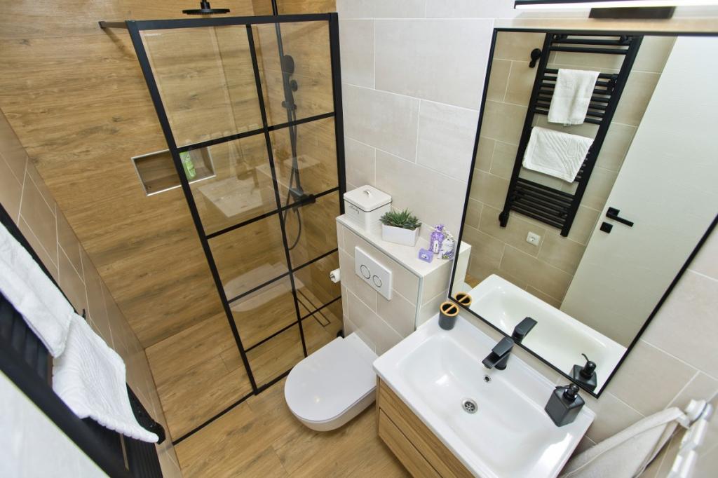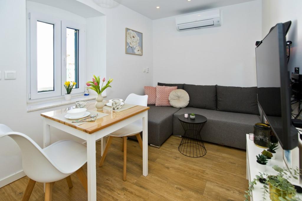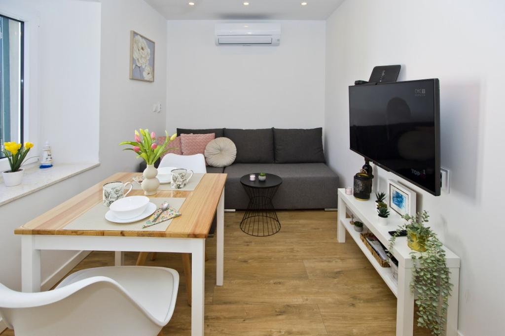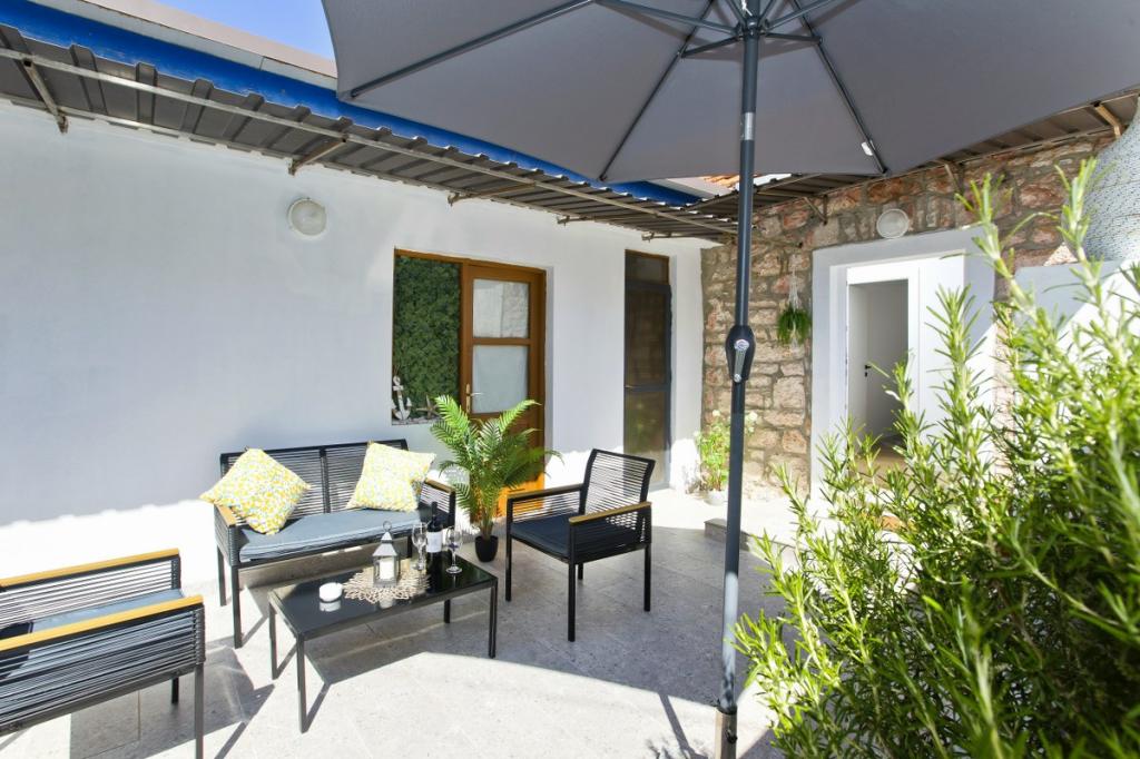 La casa consta de un apartamento de 30 m2 y un patio de 20 m2. El apartamento consta de un dormitorio, baño, sala de estar con cocina y un pequeño trastero. El dormitorio tiene una bonita vista y cuenta con una cama doble debajo de la cual hay un baúl de 160x200 cm. También hay un amplio armario con puertas correderas, dos mesitas de noche con lámparas y aire acondicionado. El baño tiene ducha, radiador, ventilador, lavabo e inodoro. La sala de estar, con ventana, y la cocina están comunicadas. La sala de estar tiene aire acondicionado, un sofá, TV y mesa de cocina con sillas. La cocina está equipada con horno, vitrocerámica, lavavajillas, frigorífico, microondas, calentador de agua y tostadora. En el pequeño trastero hay una lavadora, un calentador de agua y un zapatero. El patio está destinado a socializar y relajarse y cuenta con una tumbona, sombrilla, sillas y un conjunto de muebles de jardín. Este es un apartamento ubicado en el primer piso de la casa familiar y frente a él hay un amplio patio.