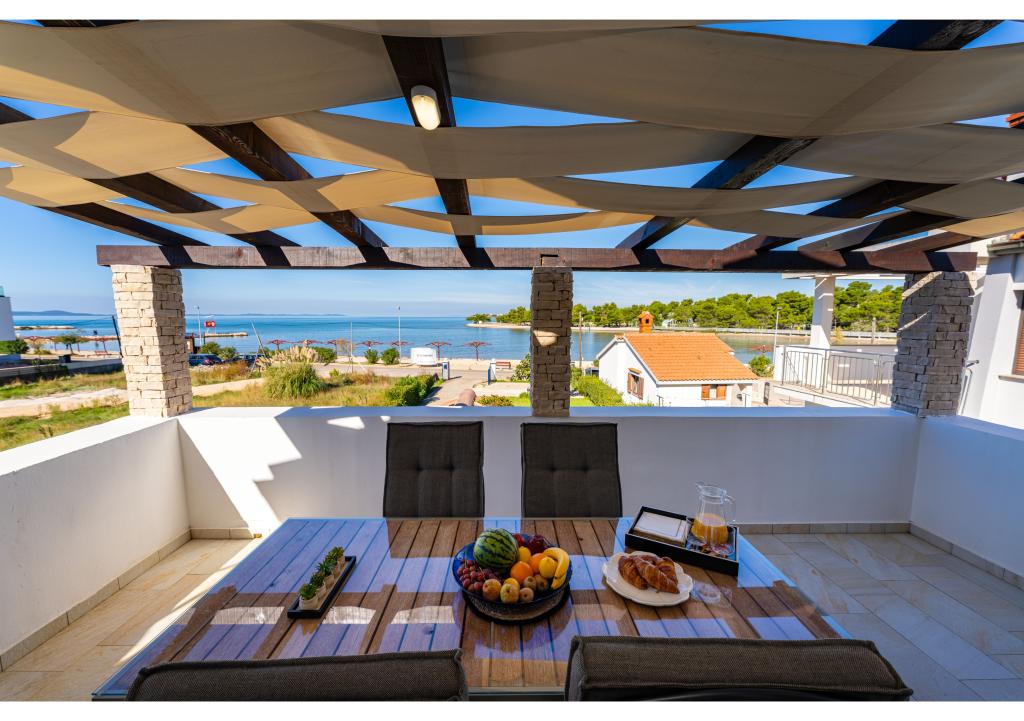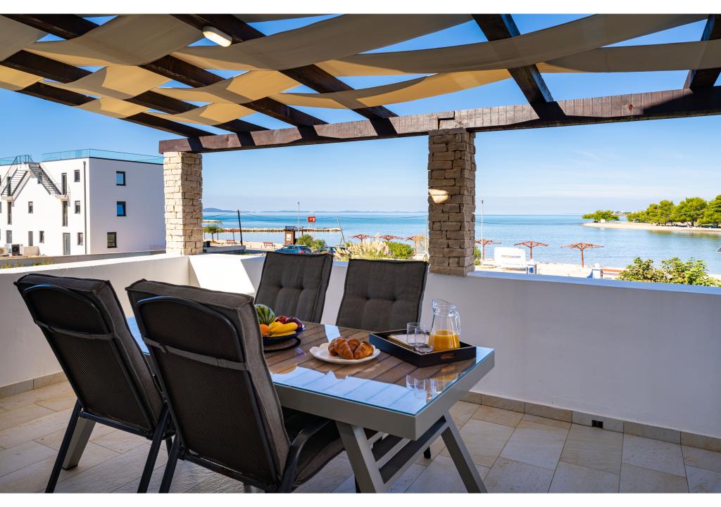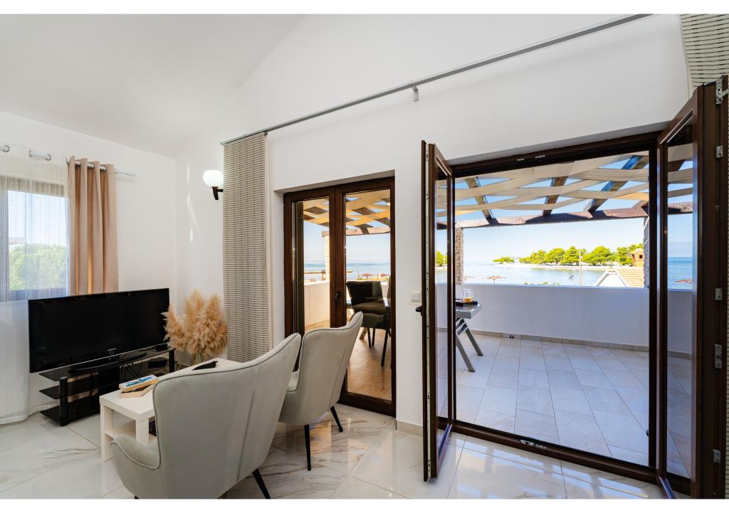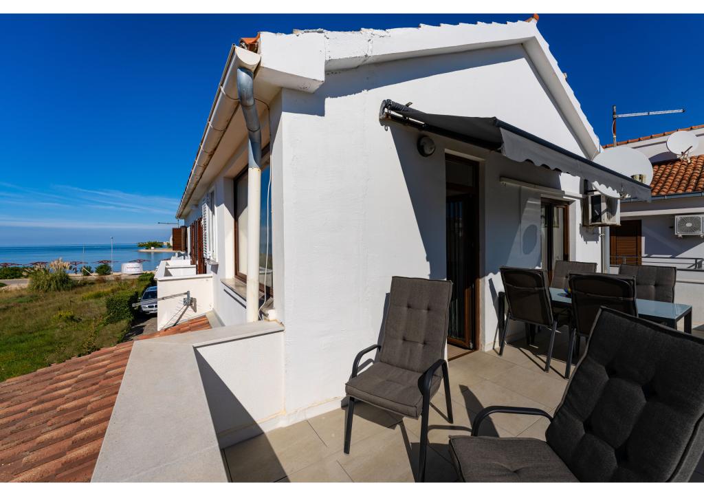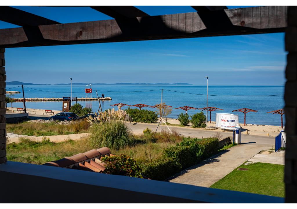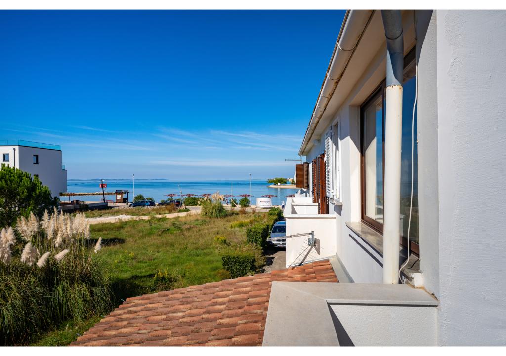 Apartamentos en primera línea de mar. Terraza con vista al mar. La bahía es arenosa y poco profunda. Los apartamentos están cerca del centro turístico de Zaton y están equipados con aire acondicionado, internet, TV vía satélite, aparcamiento, barbacoa, etc.