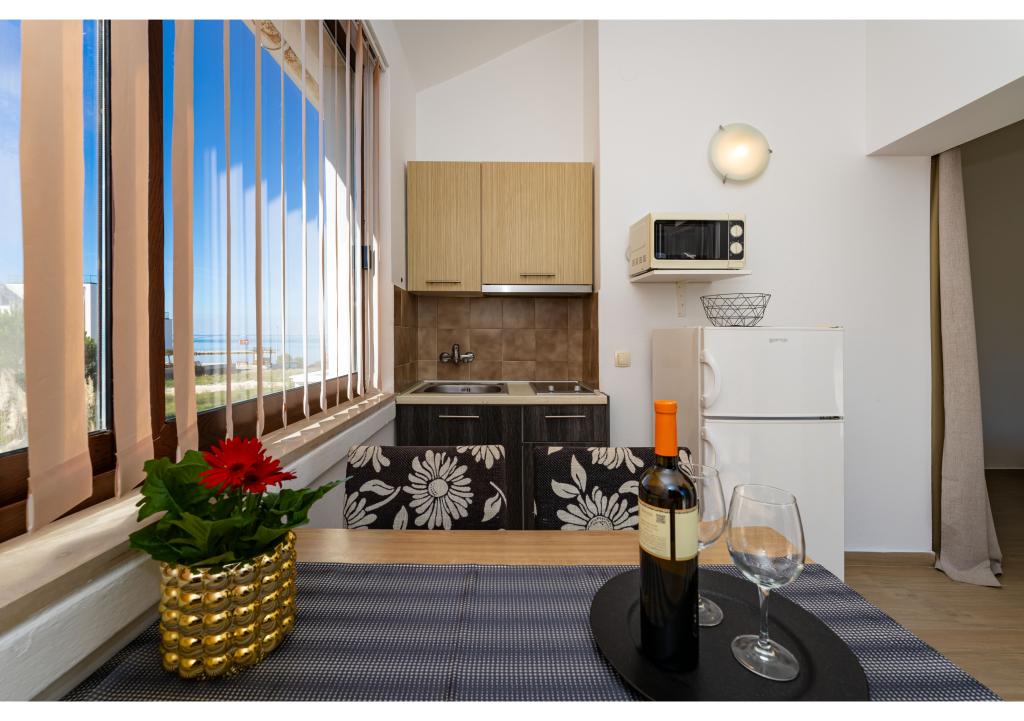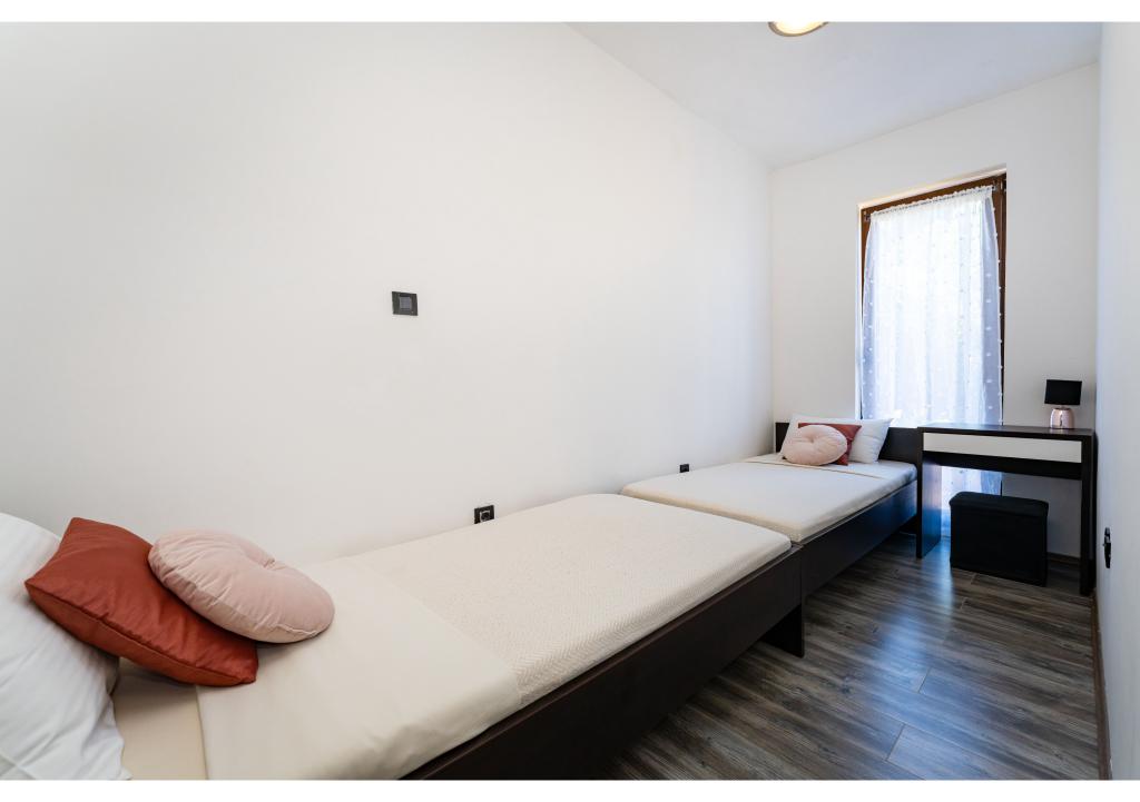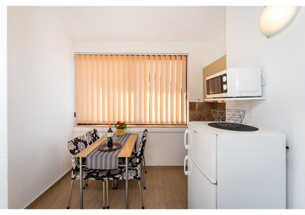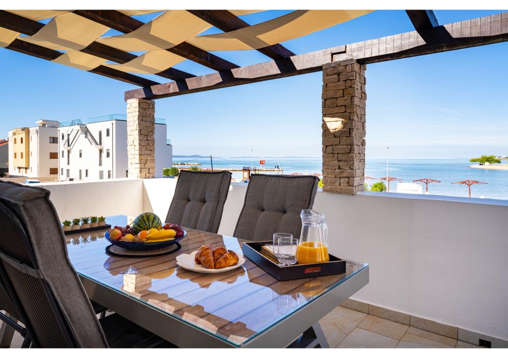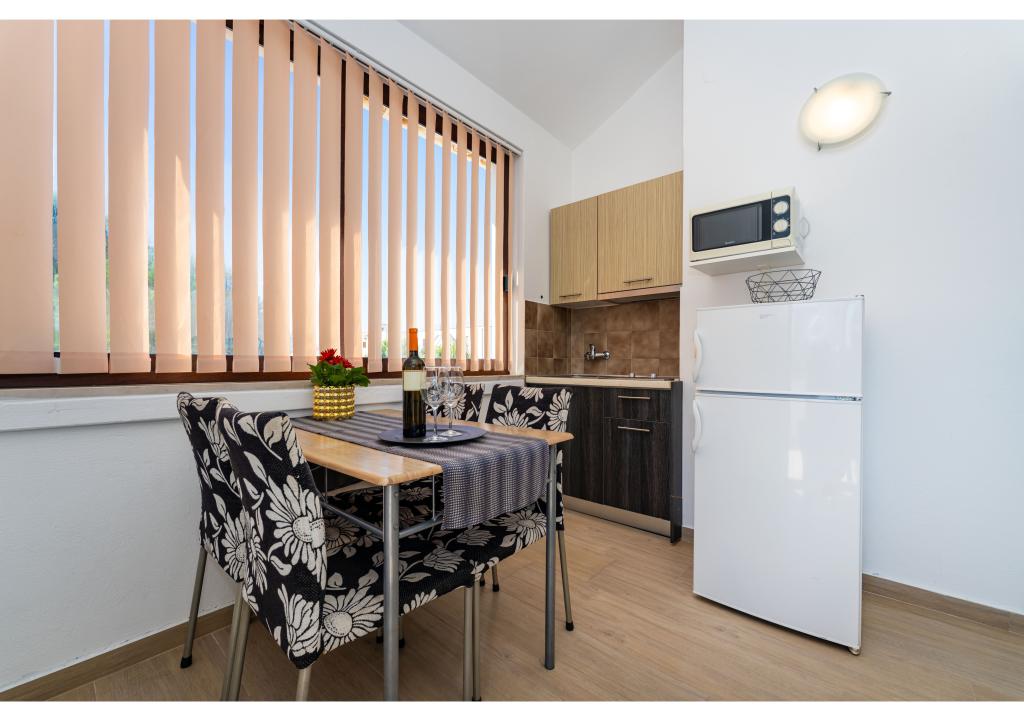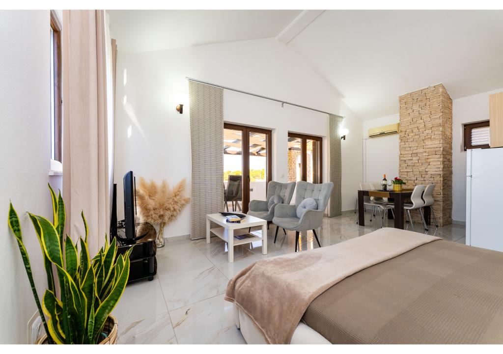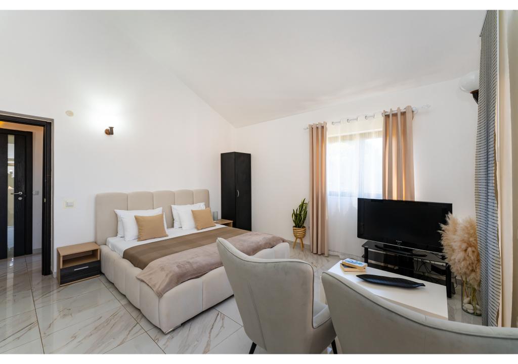Apartamentos en primera línea de mar. Terraza con vista al mar. La bahía es arenosa y poco profunda. Los apartamentos están cerca del centro turístico de Zaton y están equipados con aire acondicionado, internet, TV vía satélite, aparcamiento, barbacoa, etc.