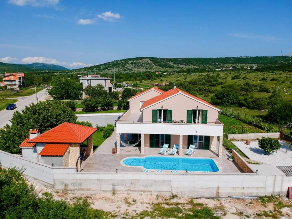 La casa de vacaciones Villa Renato se encuentra en la hermosa y pequeña ciudad de Konjsko, a 15 km de Split.La villa se encuentra en una finca de 1800 m2 con piscina, barbacoa, urnas, tenis de mesa y equipo de gimnasia, y una terraza cubierta. para el disfrute La casa en sí tiene capacidad para 8 personas. Tiene 4 dormitorios para 2 personas + un sofá cama para posiblemente otras 2 personas. La casa tiene 3 baños y un aseo exterior, como parte del cenador y la piscina. La tienda, el bar cafetería y la parada de autobús más cercanos están a solo 400 m. La distancia desde la playa de la ciudad más cercana es de unos 15 km. Conozca la ciudad de Split, Trogir, Solin, nuestras hermosas islas y el mar, los Parques Nacionales, todo en un viaje de un día por la zona. El aeropuerto de Split está a 30 km. En la Villa, disfrute de privacidad, paz y un ambiente relajante...
