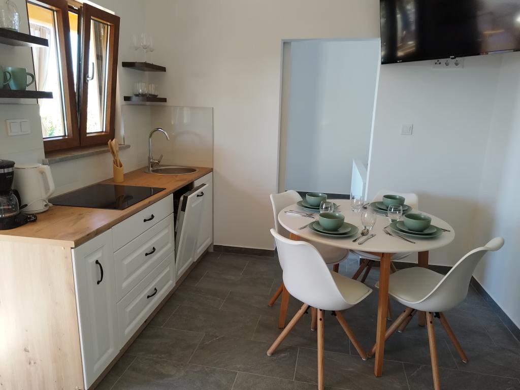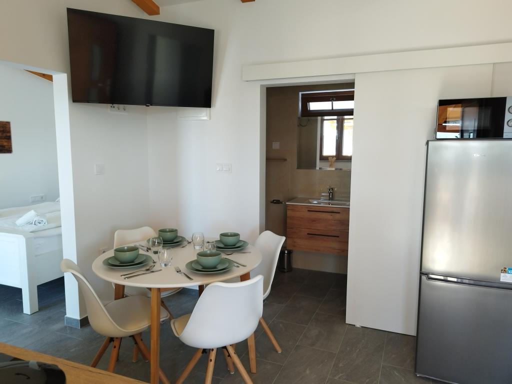 Esta encantadora casa, recién reformada, cuenta con 40 m² de espacio interior y cuenta con dos cómodas habitaciones, un elegante baño y una cocina modernamente equipada con lavavajillas, microondas, nevera y todos los utensilios necesarios. El comedor y la sala de estar con televisión ofrecen un agradable espacio para socializar. Cada habitación cuenta con aire acondicionado para su máximo confort. Frente a la casa hay una amplia terraza cubierta de piedra (90 m²) con mesa de comedor, asientos y barbacoa: un lugar ideal para tomar un café por la mañana, un desayuno largo, leer un libro o disfrutar de la puesta de sol al atardecer.